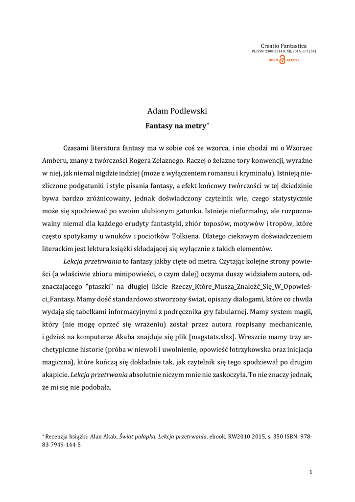 Creatio Fantastica PL ISSN: 2300-2514 R. XII, 2016, nr 3 (54) Adam Podlewski Fantasy na metry ∗ Czasami literatura fantasy ma w sobie coś ze wzorca, i nie chodzi mi o Wzorzec Amberu, znany z twórczości Rogera Zelaznego. Raczej o żelazne tory konwencji, wyraźne w niej, jak niemal nigdzie indziej (może z wyłączeniem romansu i kryminału). Istnieją niezliczone podgatunki i style pisania fantasy, a efekt końcowy twórczości w tej dziedzinie bywa bardzo zróżnicowany, jednak doświadczony czytelnik wie, czego statystycznie może się spodziewać po swoim ulubionym gatunku. Istnieje nieformalny, ale rozpoznawalny niemal dla każdego erudyty fantastyki, zbiór toposów, motywów i tropów, które często spotykamy u wnuków i pociotków Tolkiena. Dlatego ciekawym doświadczeniem literackim jest lektura książki składającej się wyłącznie z takich elementów. Lekcja przetrwania to fantasy jakby cięte od metra. Czytając kolejne strony powie- ści (a właściwie zbioru minipowieści, o czym dalej) oczyma duszy widziałem autora, od- znaczającego "ptaszki" na długiej liście Rzeczy_Które_Muszą_Znaleźć_Się_W_Opowieści_Fantasy. Mamy dość standardowo stworzony świat, opisany dialogami, które co chwila wydają się tabelkami informacyjnymi z podręcznika gry fabularnej. Mamy system magii, który (nie mogę oprzeć się wrażeniu) został przez autora rozpisany mechanicznie, i gdzieś na komputerze Akaba znajduje się plik [magstats.xlsx]. Wreszcie mamy trzy ar- chetypiczne historie (próba w niewoli i uwolnienie, opowieść łotrzykowska oraz inicjacja magiczna), które kończą się dokładnie tak, jak czytelnik się tego spodziewał po drugim akapicie. Lekcja przetrwania absolutnie niczym mnie nie zaskoczyła. To nie znaczy jednak, że mi się nie podobała. Recenzja książki: Alan Akab, Świat pułapka. Lekcja przetrwania, ebook, RW2010 2015, s. 350 ISBN: 97883-7949-144-5 ∗ 1 Akab napisał trzy minipowieści, połączone osobą głównego bohatera. Nordon (przepraszam, musiałem zajrzeć do książki, aby upewnić się, że nasz gieroj tak się nazywa) posiada prosty jak struna charakter; jest przyciętym na miarę fantasty protagonistą campbellowskim, którego jedna z tysiąca twarzy akurat pasuje do opowieści o magii i przedindustrialnym poziomie kultury materialnej. Nordon jest nudny, ale to nie wada: czytelnik poznaje go jako małego chłopca, jeszcze bez cech osobowych świadczących o głębi charakteru. i bohater nie jest właściwie postacią, ale perspektywą, punktem odniesienia, stanowiskiem obserwatora w tym wykreowanym świecie. Nie przynosi powieści punktów za oryginalność, ale i nie odejmuje jej z żadnego powodu. Trzy historie są różne, bo przecież muszą opowiedzieć o różnych aspektach wy- kreowanego świata (tak każe lista!). Pierwsza z nich, historia niewoli Nordona, z pewnością jest najlepszym fragmentem powieści. Nie zaskakuje, ale i nie zawodzi, a pod koniec nawet zmusza do wykrzesania z tak cynicznego czytelnika jak ja cieplejszych uczuć wobec papierowego protagonisty. Poza tym jest niezgorzej zagajona – Nordon opowiada o swo- ich młodzieńczych przygodach z perspektywy starego i sławnego bohatera, niejako obiecując, że jego przygody są na tyle ciekawe, że lokalne uniwersum obwołało go Kozakiemnad-Kozakami. Zapowiada też szczęśliwie zakończoną i nieco nudnawą opowieść o skromnych początkach. Czytelnik dostaje dokładnie to, co mu obiecano. Druga historia, opowieść łotrzykowska (tak w znaczeniu literackim, jak i przygód postaci klasy rogue z mechaniki Dungeons and Dragons) jest nadal ciekawą, choć nieco zbyt rozwlekle poprowadzoną gawędą o ludziach, którzy godzinami buszują po miejskich kanałach (które, z niewyjaśnionych nigdy powodów, są wielkie w niemal każdym mia- steczku świata fantasy), aby wykryć wszystkie pułapki, uciec pogoni straży miejskiej i zdobyć magiczny artefakt, a nie, na przykład, udusić się smrodem, zakazić ranę, albo uto- nąć w bardzo nieprzyjemnych okolicznościach przyrody. Trzecia opowieść to inicjacja magiczna bohatera, bogata w treści "mechaniczne", ale niekoniecznie w fabułę; część poprawna językowo, ale najnudniejsza z zaprezentowanych. Słowem: Lekcja przetrwania nadaje się do czytania, nadaje się nawet do czerpania z niej przyjemności, ale jedyną niespodzianką w powieści (zbiorku?) Akaba jest brak niespodzianek. Tani ebook na pewno nie pozwoli Wam zasnąć w pociągu, ale i nie odkryje przed wami żadnych tajemnych arkanów literatury. Można kupić i przeczytać, ale można też namówić autora do stworzenia settingu dowolnego systemu fantasy RPG. Wyjdzie mu to pewnie niezgorzej, a my może wreszcie poznamy zawartość pliku [magstats.xlsx]. 2