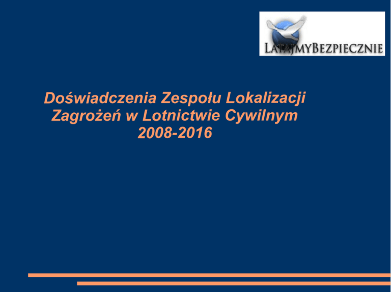 Doświadczenia Zespołu Lokalizacji Zagrożeń w Lotnictwie Cywilnym 2008-2016 Doświadczenia Zespołu Lokalizacji Zagrożeń w Lotnictwie Cywilnym 2008-2016 Początek: audyt ICAO 2008 – system dobrowolnego zgłaszania Wzorzec: CHIRP / UK – główne założenia Mission Just Culture / zgłoszenia latajmybezpiecznie.org Doświadczenia Zespołu Lokalizacji Zagrożeń w Lotnictwie Cywilnym 2008-2016 Jeszcze raz MISJA: Próba wybadania rzeczywistego stanu zagrożeń w lotnictwie cywilnym RP oraz przygotowanie nas/was/ich na zyski i wyzwania wprowadzania kultury bezpieczństwa po polsku Doświadczenia Zespołu Lokalizacji Zagrożeń w Lotnictwie Cywilnym 2008-2016 Zgłoszenia (173): 2008 – 3 2009 – 26 2010 – 21 2011 – 34 2012 – 27 2013 – 22 2014 – 23 40 35 30 25 20 15 10 5 0 2015 – 17 2008 2009 2010 2011 2012 2013 2014 2015 Doświadczenia Zespołu Lokalizacji Zagrożeń w Lotnictwie Cywilnym 2008-2016 Utrudnienia prawno-organizacyjne, niejasne przepisy, biurokracja, prawo – 26% Problemy na/przy lotniskach (LVP, ptaki, BSL, lasery, oznaczenia itp.) – 16% Standardy w szkoleniu lotnictwo ogólne – 13% Przeszkody w rejonie lotnisk – 7% Organizacja przestrzeni powietrznej – 5% Standardy w lotnictwie zarobkowym (w tym obsługa) – 13% Na kręgu nadlotniskowym - w tym komunikacja, prawnie AFIS – 7% Problemy techniczne w lotnictwie ogólnym – 7% Różne „podzielenie się doświadczeniem” - codzienna praktyka lotnicza – 7% Problemy między różnymi użytkownikami przestrzeni powietrznej – 3% Wlot w zajętą (kontrolowaną) przestrzeń bez zezwolenia – z winny pilota – 3% Wloty dronów – 3% Przeszkody trasowe – 3% Doświadczenia Zespołu Lokalizacji Zagrożeń w Lotnictwie Cywilnym 2008-2016 Doświadczenia Zespołu Lokalizacji Zagrożeń w Lotnictwie Cywilnym 2008-2016 Doświadczenia Zespołu Lokalizacji Zagrożeń w Lotnictwie Cywilnym 2008-2016 Zespoł Lokalizacji Zagrożeń w Lotnictwie Cywilnym Praktyczny SMS: system anonimowy dobrowolny w linii lotniczej Ilość zgłoszeń – poniżej jeden na rok na samolot Problemy międzyludzkie raport na inną osobę – 30% Sprawy firmowe m.in. rostering, dokumentacja, technika, procedury – 20% Bardziej ogólnie CRM – 10% Błędy własne, złe decyzje, nieporozumienia, podziel się doświadczzeniem – < 10% Różne obserwacje dotyczące bezpieczeństwa zwłaszcza na lotniskach/ATC – < 10% Problemy (skargi) na security – < 10% Produkty na pokładzie – < 5% Zespoł Lokalizacji Zagrożeń w Lotnictwie Cywilnym Nasze ulubione tematy: Brak INSTRUKTORÓW dobrych, mających czas, doświadczenie, dobry airmanship ; Zapora prawna – kara za spowodowanie zagrożenia w ruchu lotniczym pięć lat pozbawienia wolności; Słaby system prawny, zawiłości prawne, nie wiadomo jak zrobić dobrze, czas na papiery, kłopot – co to jest dobry standard; Zabójca nr jeden: przeciągnięcie / korkociąg ( zwłaszcza w sytuacjach awaryjnych ); Zabójca dwa: niezamierzony/z premedytacją wlot w IMC pilota nie będącego w stanie legalnie / bezpiecznie rozwiązać/zakończyć takiej sytuacji; Krąg nadlotniskowy / AFIS; LVP na lotniskach w Polsce / nakłady na infrastrukturę, a wyposażenie lotnisk; Planowanie, wykonanie pokazów lotniczych, pokaz nieplanowany; Drony, lasery, przeszkody, otoczenie lotnisk; Standardy w szkoleniu podstawowym; Standardy obsługi technicznej; Zapałki...
