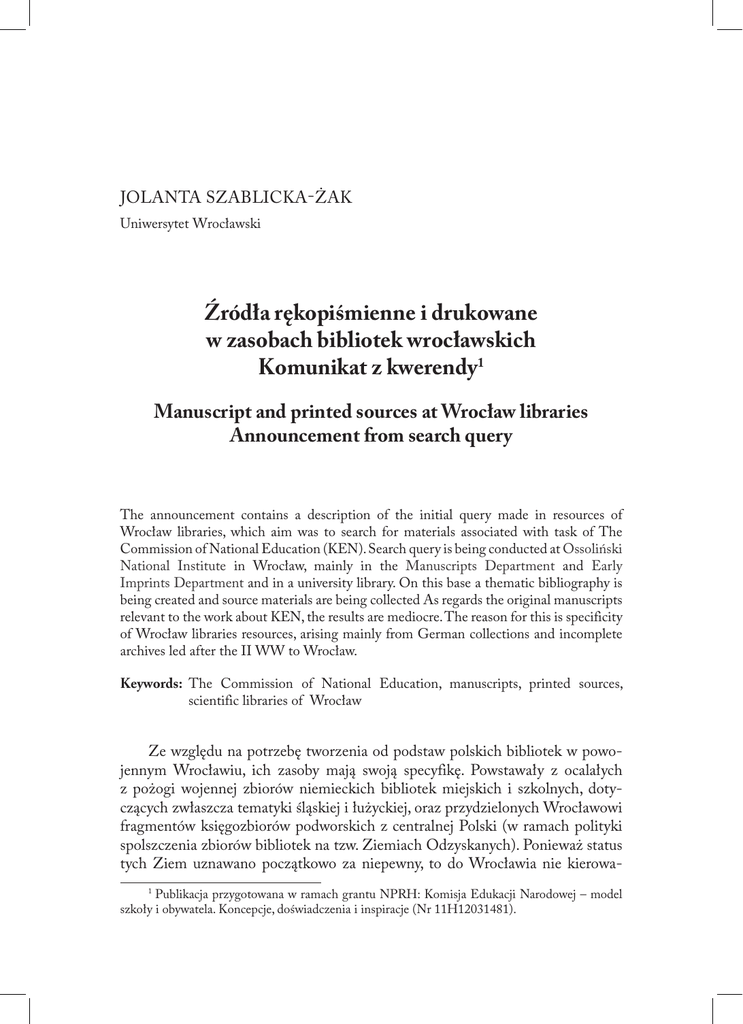 JOLANTA SZABLICKA-ŻAK Uniwersytet Wrocławski Źródła rękopiśmienne i drukowane w zasobach bibliotek wrocławskich Komunikat z kwerendy1 Manuscript and printed sources at Wrocław libraries Announcement from search query The announcement contains a description of the initial query made in resources of Wrocław libraries, which aim was to search for materials associated with task of The Commission of National Education (KEN). Search query is being conducted at Ossoliński National Institute in Wrocław, mainly in the Manuscripts Department and Early Imprints Department and in a university library. On this base a thematic bibliography is being created and source materials are being collected As regards the original manuscripts relevant to the work about KEN, the results are mediocre. The reason for this is specificity of Wrocław libraries resources, arising mainly from German collections and incomplete archives led after the II WW to Wrocław. Keywords: The Commission of National Education, manuscripts, printed sources, scientific libraries of Wrocław Ze względu na potrzebę tworzenia od podstaw polskich bibliotek w powojennym Wrocławiu, ich zasoby mają swoją specyfikę. Powstawały z ocalałych z pożogi wojennej zbiorów niemieckich bibliotek miejskich i szkolnych, dotyczących zwłaszcza tematyki śląskiej i łużyckiej, oraz przydzielonych Wrocławowi fragmentów księgozbiorów podworskich z centralnej Polski (w ramach polityki spolszczenia zbiorów bibliotek na tzw. Ziemiach Odzyskanych). Ponieważ status tych Ziem uznawano początkowo za niepewny, to do Wrocławia nie kierowa Publikacja przygotowana w ramach grantu NPRH: Komisja Edukacji Narodowej – model szkoły i obywatela. Koncepcje, doświadczenia i inspiracje (Nr 11H12031481). 1 Źródła rękopiśmienne i drukowane w zasobach bibliotek wrocławskich…71 no cennych poloników, ich główną siedzibą czyniąc Bibliotekę Narodową. Sytuacja zmieniła się w 1947 r., kiedy na skutek działań wrocławskiego środowiska naukowego ustanowiono nową siedzibę Zakładu Narodowego im. Ossolińskich w siedemnastowiecznym budynku poklasztornym Zakonu Szpitalnego Kawalerów Krzyżowych z Czerwoną Gwiazdą we Wrocławiu. Zbiory Biblioteki Zakładu Narodowego im. Ossolińskich we Wrocławiu należą do najważniejszych i najcenniejszych zasobów dziedzictwa narodowego. Liczą obecnie ok. 1 800 000 jednostek, pośród których znajdują się druki zwarte, czasopisma, rękopisy, dokumenty, stare druki, rysunki, ryciny, obrazy, ekslibrisy, medale, monety, pieczęcie, mapy i plany, plakaty, broszury, afisze, zbiory mikrofilmowe. Ale czas powstania, miejsce i osoba fundatora, późniejsze losy Ossolineum i jego obecna siedziba we Wrocławiu, raczej nie rokują sukcesów w odkryciu pierwotnych dokumentów źródłowych bezpośrednio związanych z instytucją Komisji Edukacji Narodowej i jej dziełem. Biblioteka Zakładu Narodowego im. Ossolińskich została utworzona we Lwowie w 1817 r. przez Józefa Maksymiliana hr. Ossolińskiego (1748–1826), który w kilka lat po rozbiorach powziął zamiar powołania narodowej instytucji biblioteczno-muzealnej, mającej przypominać kolejnym pokoleniom Polaków, kim byli, zanim pozbawiono ich własnego państwa. Zgodnie z wolą założyciela w jej zasobach znalazły się zbiory książek, rękopisów, numizmatów i muzealiów, ofiarowanych przez J.M. Ossolińskiego (przebywającego w Wiedniu), oraz innych darczyńców, które były później stale wzbogacane. Dopiero wybuch II wojny światowej odmienił los Ossolineum, które okupant niemiecki i sowiecki poddał represjom, zubożając i rozpraszając jego cenne zbiory. W 1944 r., z powodu zbliżającego się frontu, władze niemieckie zarządziły ewakuację zbiorów ważnych dla kultury niemieckiej. Prace te przeprowadzane były pod kierownictwem Mieczysława Gębarowicza, który wykorzystał tę sytuację dla własnych planów ewakuacji zbiorów polskich. W dwóch transportach, skierowanych do Biblioteki Jagiellońskiej w Krakowie, wbrew wyraźnym instrukcjom niemieckim nakazującym przede wszystkim ewakuację niemieckiej literatury fachowej i księgozbiorów podręcznych czytelni głównych, wysłano najcenniejsze i starannie wyselekcjonowane zbiory specjalne i cymelia Ossolineum2. Ponadto ewakuowano spuścizny rękopiśmienne lwowskich uczonych: Wojciecha Kętrzyńskiego, Ludwika Bernackiego, Oswalda Balzera, Karola Szajnochy. Kolejnym etapem ewakuacji, w zamierzeniu Niemców, miała być Rzesza Niemiecka, ale na skutek działań wojennych transport został porzucony w miejscowości Adelin (obecnie Zagrodno) na Dolnym Śląsku, gdzie po wojnie odnaleźli go Polacy. I tak w 1947 r. zbiory trafiły do Wrocławia, gdzie również następnie przekazano 2 Było to ok. 2300 rękopisów, ok. 2200 dokumentów (dyplomów), ok. 1700 starych druków, ok. 2400 rycin i rysunków z dawnych zbiorów Muzeum im. Lubomirskich i kolekcji Pawlikowskich oraz kilkaset sztuk numizmatów. Ponadto znalazło się tam ok. 170 najcenniejszych rękopisów innej fundacyjnej biblioteki polskiej – Biblioteki Baworowskich, oraz najcenniejsze rękopisy i inkunabuły Biblioteki Uniwersyteckiej we Lwowie. 72 Jolanta Szablicka-Żak jako „dar narodu ukraińskiego dla narodu polskiego” (sic!) część pozostawionej we Lwowie kolekcji3. Jednakże szacuje się, że ok. 70% przedwojennego zasobu Ossolineum pozostaje nadal we Lwowie. Od 1992 r. trwają negocjacje z Ukraińcami w sprawie ich rewindykacji. W roku 2003 nastąpił przełom w prowadzonych rozmowach, Ossolineum uzyskało możliwość pełnego dostępu do polskich kolekcji przechowywanych w Bibliotece im. V. Stefanyka, z możliwością ich kopiowania (skanowania i mikrofilmowania) oraz opracowania4. Ustawa o ZNiO z 1995 roku umożliwia także proces odtworzenia Muzeum Książąt Lubomirskich. Obecnie jest oddział ZNiO pod nazwą Muzeum Książąt Lubomirskich, w skład którego wchodzą dwa gabinety: Grafiki i 