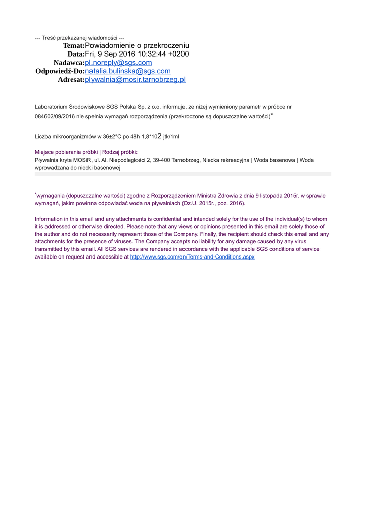 --- Treść przekazanej wiadomości --- Temat:Powiadomienie o przekroczeniu Data:Fri, 9 Sep 2016 10:32:44 +0200 Nadawca:[email protected] Odpowiedź-Do:[email protected] Adresat:[email protected] Laboratorium Środowiskowe SGS Polska Sp. z o.o. informuje, że niżej wymieniony parametr w próbce nr 084602/09/2016 nie spełnia wymagań rozporządzenia (przekroczone są dopuszczalne wartości)* Liczba mikroorganizmów w 36±2°C po 48h 1,8*102 jtk/1ml Miejsce pobierania próbki | Rodzaj próbki: Pływalnia kryta MOSiR, ul. Al. Niepodległości 2, 39-400 Tarnobrzeg, Niecka rekreacyjna | Woda basenowa | Woda wprowadzana do niecki basenowej *wymagania (dopuszczalne wartości) zgodne z Rozporządzeniem Ministra Zdrowia z dnia 9 listopada 2015r. w sprawie wymagań, jakim powinna odpowiadać woda na pływalniach (Dz.U. 2015r., poz. 2016). Information in this email and any attachments is confidential and intended solely for the use of the individual(s) to whom it is addressed or otherwise directed. Please note that any views or opinions presented in this email are solely those of the author and do not necessarily represent those of the Company. Finally, the recipient should check this email and any attachments for the presence of viruses. The Company accepts no liability for any damage caused by any virus transmitted by this email. All SGS services are rendered in accordance with the applicable SGS conditions of service available on request and accessible at http://www.sgs.com/en/Terms-and-Conditions.aspx --- Treść przekazanej wiadomości --- Temat:Powiadomienie o przekroczeniu Data:Fri, 9 Sep 2016 10:32:45 +0200 Nadawca:[email protected] Odpowiedź-Do:[email protected] Adresat:[email protected] Laboratorium Środowiskowe SGS Polska Sp. z o.o. informuje, że niżej wymieniony parametr w próbce nr 084633/09/2016 nie spełnia wymagań rozporządzenia (przekroczone są dopuszczalne wartości)* Liczba mikroorganizmów w 36±2°C po 48h 1,2*102 jtk/1ml Miejsce pobierania próbki | Rodzaj próbki: Pływalnia kryta MOSiR, ul. Al. Niepodległości 2, 39-400 Tarnobrzeg, Wanny z hydromasażem | Woda basenowa | N2 wanna nr 2 - przy wejściu na zjeżdźalnię *wymagania (dopuszczalne wartości) zgodne z Rozporządzeniem Ministra Zdrowia z dnia 9 listopada 2015r. w sprawie wymagań, jakim powinna odpowiadać woda na pływalniach (Dz.U. 2015r., poz. 2016). Information in this email and any attachments is confidential and intended solely for the use of the individual(s) to whom it is addressed or otherwise directed. Please note that any views or opinions presented in this email are solely those of the author and do not necessarily represent those of the Company. Finally, the recipient should check this email and any attachments for the presence of viruses. The Company accepts no liability for any damage caused by any virus transmitted by this email. All SGS services are rendered in accordance with the applicable SGS conditions of service available on request and accessible at http://www.sgs.com/en/Terms-and-Conditions.aspx --- Treść przekazanej wiadomości --- Temat:Powiadomienie o przekroczeniu Data:Fri, 9 Sep 2016 10:32:44 +0200 Nadawca:[email protected] Odpowiedź-Do:[email protected] Adresat:[email protected] Laboratorium Środowiskowe SGS Polska Sp. z o.o. informuje, że niżej wymieniony parametr w próbce nr 084631/09/2016 nie spełnia wymagań rozporządzenia (przekroczone są dopuszczalne wartości)* Liczba mikroorganizmów w 36±2°C po 48h >3,0*102 jtk/1ml Miejsce pobierania próbki | Rodzaj próbki: Pływalnia kryta MOSiR, ul. Al. Niepodległości 2, 39-400 Tarnobrzeg, Wanny z hydromasażem | Woda basenowa | Woda wprowadzana do wanny *wymagania (dopuszczalne wartości) zgodne z Rozporządzeniem Ministra Zdrowia z dnia 9 listopada 2015r. w sprawie wymagań, jakim powinna odpowiadać woda na pływalniach (Dz.U. 2015r., poz. 2016). Information in this email and any attachments is confidential and intended solely for the use of the individual(s) to whom it is addressed or otherwise directed. Please note that any views or opinions presented in this email are solely those of the author and do not necessarily represent those of the Company. Finally, the recipient should check this email and any attachments for the presence of viruses. The Company accepts no liability for any damage caused by any virus transmitted by this email. All SGS services are rendered in accordance with the applicable SGS conditions of service available on request and accessible at http://www.sgs.com/en/Terms-and-Conditions.aspx