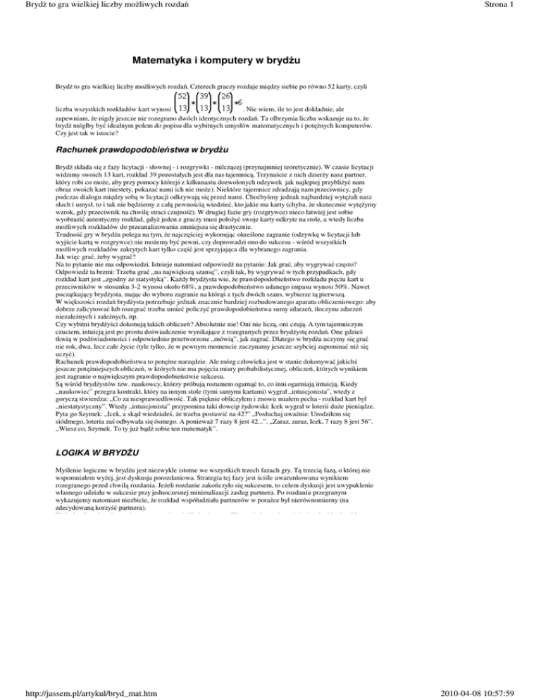 Brydż to gra wielkiej liczby możliwych rozdań Strona 1 Matematyka i komputery w brydżu Brydż to gra wielkiej liczby możliwych rozdań. Czterech graczy rozdaje między siebie po równo 52 karty, czyli liczba wszystkich rozkładów kart wynosi . Nie wiem, ile to jest dokładnie, ale zapewniam, że nigdy jeszcze nie rozegrano dwóch identycznych rozdań. Ta olbrzymia liczba wskazuje na to, że brydż mógłby być idealnym polem do popisu dla wybitnych umysłów matematycznych i potężnych komputerów. Czy jest tak w istocie? Rachunek prawdopodobieństwa w brydżu Brydż składa się z fazy licytacji - słownej - i rozgrywki - milczącej (przynajmniej teoretycznie). W czasie licytacji widzimy swoich 13 kart, rozkład 39 pozostałych jest dla nas tajemnicą. Trzynaście z nich dzierży nasz partner, który robi co może, aby przy pomocy którejś z kilkunastu dozwolonych odzywek jak najlepiej przybliżyć nam obraz swoich kart (niestety, pokazać nami ich nie może). Niektóre tajemnice zdradzają nam przeciwnicy, gdy podczas dialogu między sobą w licytacji odkrywają się przed nami. Choćbyśmy jednak najbardziej wytężali nasz słuch i umysł, to i tak nie będziemy z całą pewnością wiedzieć, kto jakie ma karty (chyba, że skutecznie wytężymy wzrok, gdy przeciwnik na chwilę straci czujność). W drugiej fazie gry (rozgrywce) nieco łatwiej jest sobie wyobrazić autentyczny rozkład, gdyż jeden z graczy musi położyć swoje karty odkryte na stole, a wtedy liczba możliwych rozkładów do przeanalizowania zmniejsza się drastycznie. Trudność gry w brydża polega na tym, że najczęściej wykonując określone zagranie (odzywkę w licytacji lub wyjście kartą w rozgrywce) nie możemy być pewni, czy doprowadzi ono do sukcesu - wśród wszystkich możliwych rozkładów zakrytych kart tylko część jest sprzyjająca dla wybranego zagrania. Jak więc grać, żeby wygrać? Na to pytanie nie ma odpowiedzi. Istnieje natomiast odpowiedź na pytanie: Jak grać, aby wygrywać często? Odpowiedź ta brzmi: Trzeba grać „na największą szansę”, czyli tak, by wygrywać w tych przypadkach, gdy rozkład kart jest „zgodny ze statystyką”. Każdy brydżysta wie, że prawdopodobieństwo rozkładu pięciu kart u przeciwników w stosunku 3-2 wynosi około 68%, a prawdopodobieństwo udanego impasu wynosi 50%. Nawet początkujący brydżysta, mając do wyboru zagranie na którąś z tych dwóch szans, wybierze tą pierwszą. W większości rozdań brydżysta potrzebuje jednak znacznie bardziej rozbudowanego aparatu obliczeniowego: aby dobrze zalicytować lub rozegrać trzeba umieć policzyć prawdopodobieństwa sumy zdarzeń, iloczynu zdarzeń niezależnych i zależnych, itp. Czy wybitni brydżyści dokonują takich obliczeń? Absolutnie nie! Oni nie liczą, oni czują. A tym tajemniczym czuciem, intuicją jest po prostu doświadczenie wynikające z rozegranych przez brydżystę rozdań. One gdzieś tkwią w podświadomości i odpowiednio przetworzone „mówią”, jak zagrać. Dlatego w brydża uczymy się grać nie rok, dwa, lecz całe życie (tyle tylko, że w pewnym momencie zaczynamy jeszcze szybciej zapominać niż się uczyć). Rachunek prawdopodobieństwa to potężne narzędzie. Ale mózg człowieka jest w stanie dokonywać jakichś jeszcze potężniejszych obliczeń, w których nie ma pojęcia miary probabilistycznej, obliczeń, których wynikiem jest zagranie o największym prawdopodobieństwie sukcesu. Są wśród brydżystów tzw. naukowcy, którzy próbują rozumem ogarnąć to, co inni ogarniają intuicją. Kiedy „naukowiec” przegra kontrakt, który na innym stole (tymi samymi kartami) wygrał „intuicjonista”, wtedy z goryczą stwierdza: „Co za niesprawiedliwość. Tak pięknie obliczyłem i znowu miałem pecha - rozkład kart był „niestatystyczny”. Wtedy „intuicjonista” przypomina taki dowcip żydowski: Icek wygrał w loterii duże pieniądze. Pyta go Szymek: „Icek, a skąd wiedziałeś, że trzeba postawić na 42?” „Posłuchaj uważnie. Urodziłem się siódmego, loteria zaś odbywała się ósmego. A ponieważ 7 razy 8 jest 42...”. „Zaraz, zaraz, Icek, 7 razy 8 jest 56”. „Wiesz co, Szymek. To ty już bądź sobie ten matematyk”. LOGIKA W BRYDŻU Myślenie logiczne w brydżu jest niezwykle istotne we wszystkich trzech fazach gry. Tą trzecią fazą, o której nie wspomniałem wyżej, jest dyskusja porozdaniowa. Strategia tej fazy jest ściśle uwarunkowana wynikiem rozegranego przed chwilą rozdania. Jeżeli rozdanie zakończyło się sukcesem, to celem dyskusji jest uwypuklenie własnego udziału w sukcesie przy jednoczesnej minimalizacji zasług partnera. Po rozdaniu przegranym wykazujemy natomiast niezbicie, że rozkład współudziału partnerów w porażce był nierównomierny (na zdecydowaną korzyść partnera). W dyskusji posługujemy się rozumowaniem ściśle logicznym. Wypowiadamy się mniej więcej takim językiem: http://jassem.pl/artykul/bryd_mat.htm 2010-04-08 10:57:59 Brydż to gra wielkiej liczby możliwych rozdań Strona 2 wykazujemy natomiast niezbicie, że rozkład współudziału partnerów w porażce był nierównomierny (na zdecydowaną korzyść partnera). W dyskusji posługujemy się rozumowaniem ściśle logicznym. Wypowiadamy się mniej więcej takim językiem: „Logicznym jest, że skoro zalicytowałeś p, na co ja odpowiedziałem q, a ty zalicytowałeś r, a mogłeś alternatywnie zapowiedzieć s, to oznacza, że nie masz króla. Odpowiedź na takie dictum jest z reguły podobnie ścisła logicznie: „jeśli zalicytowałem p, a ty odpowiedziałeś q, to gdybym nie miał króla, oczywiście zalicytowałbym s. Skoro więc zalicytowałem r, to wniosek jest jednoznaczny: mam króla! Te dwa z pozoru sprzeczne rozumowania są całkowicie zgodne z brydżową logiką dwuwartościową, w której stwierdzenie może być zarówno prawdziwe jak i fałszywe w zależności od punktu widzenia. Myślenie logiczn