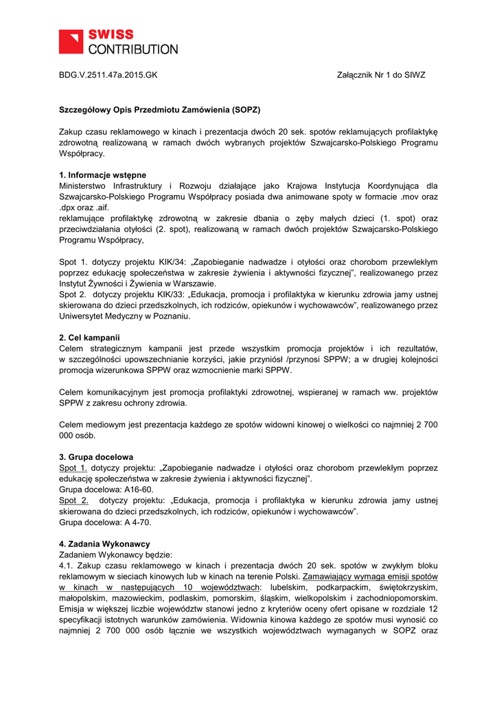 BDG.V.2511.47a.2015.GK Załącznik Nr 1 do SIWZ Szczegółowy Opis Przedmiotu Zamówienia (SOPZ) Zakup czasu reklamowego w kinach i prezentacja dwóch 20 sek. spotów reklamujących profilaktykę zdrowotną realizowaną w ramach dwóch wybranych projektów Szwajcarsko-Polskiego Programu Współpracy. 1. Informacje wstępne Ministerstwo Infrastruktury i Rozwoju działające jako Krajowa Instytucja Koordynująca dla Szwajcarsko-Polskiego Programu Współpracy posiada dwa animowane spoty w formacie .mov oraz .dpx oraz .aif. reklamujące profilaktykę zdrowotną w zakresie dbania o zęby małych dzieci (1. spot) oraz przeciwdziałania otyłości (2. spot), realizowaną w ramach dwóch projektów Szwajcarsko-Polskiego Programu Współpracy, Spot 1. dotyczy projektu KIK/34: „Zapobieganie nadwadze i otyłości oraz chorobom przewlekłym poprzez edukację społeczeństwa w zakresie Ŝywienia i aktywności fizycznej”, realizowanego przez Instytut śywności i śywienia w Warszawie. Spot 2. dotyczy projektu KIK/33: „Edukacja, promocja i profilaktyka w kierunku zdrowia jamy ustnej skierowana do dzieci przedszkolnych, ich rodziców, opiekunów i wychowawców”, realizowanego przez Uniwersytet Medyczny w Poznaniu. 2. Cel kampanii Celem strategicznym kampanii jest przede wszystkim promocja projektów i ich rezultatów, w szczególności upowszechnianie korzyści, jakie przyniósł /przynosi SPPW; a w drugiej kolejności promocja wizerunkowa SPPW oraz wzmocnienie marki SPPW. Celem komunikacyjnym jest promocja profilaktyki zdrowotnej, wspieranej w ramach ww. projektów SPPW z zakresu ochrony zdrowia. Celem mediowym jest prezentacja kaŜdego ze spotów widowni kinowej o wielkości co najmniej 2 700 000 osób. 3. Grupa docelowa Spot 1. dotyczy projektu: „Zapobieganie nadwadze i otyłości oraz chorobom przewlekłym poprzez edukację społeczeństwa w zakresie Ŝywienia i aktywności fizycznej”. Grupa docelowa: A16-60. Spot 2. dotyczy projektu: „Edukacja, promocja i profilaktyka w kierunku zdrowia jamy ustnej skierowana do dzieci przedszkolnych, ich rodziców, opiekunów i wychowawców”. Grupa docelowa: A 4-70. 4. Zadania Wykonawcy Zadaniem Wykonawcy będzie: 4.1. Zakup czasu reklamowego w kinach i prezentacja dwóch 20 sek. spotów w zwykłym bloku reklamowym w sieciach kinowych lub w kinach na terenie Polski. Zamawiający wymaga emisji spotów w kinach w następujących 10 województwach: lubelskim, podkarpackim, świętokrzyskim, małopolskim, mazowieckim, podlaskim, pomorskim, śląskim, wielkopolskim i zachodniopomorskim. Emisja w większej liczbie województw stanowi jedno z kryteriów oceny ofert opisane w rozdziale 12 specyfikacji istotnych warunków zamówienia. Widownia kinowa kaŜdego ze spotów musi wynosić co najmniej 2 700 000 osób łącznie we wszystkich województwach wymaganych w SOPZ oraz zadeklarowanych w ofercie Wykonawcy. W przypadku emisji obu spotów w tym samym bloku reklamowym, muszą one być przedzielone innymi reklamami. 4.2. Przekształcenie materiałów wyjściowych, posiadanych przez Zamawiającego, zgodnie z wymaganiami technicznymi sieci dystrybutorów kinowych lub kin oraz produkcja wymaganej przez sieci kinowe/kina liczby kopii kinowych. 4.3. Dostarczenie kopii kinowych do kin. 4.4. Przedstawienie raportu końcowego. Raport musi zawierać m.in. informację o terminie realizacji zadania, miejscach realizacji emisji kaŜdego ze spotów (wykaz kin i miejscowości), udokumentowanej widowni i skuteczności kampanii. Raport naleŜy przekazać w 2 egzemplarzach, w formie pisemnej i elektronicznej, na płycie CD, dołączonym plikiem .xls (z wykazem kin, w których odbywały się emisje, i nazwami miejscowości). Miejsce dostarczenia raportu – Ministerstwo lnfrastruktury i Rozwoju, Departament Programów Pomocowych, ul. Wspólna 2/4, 00-926 Warszawa.