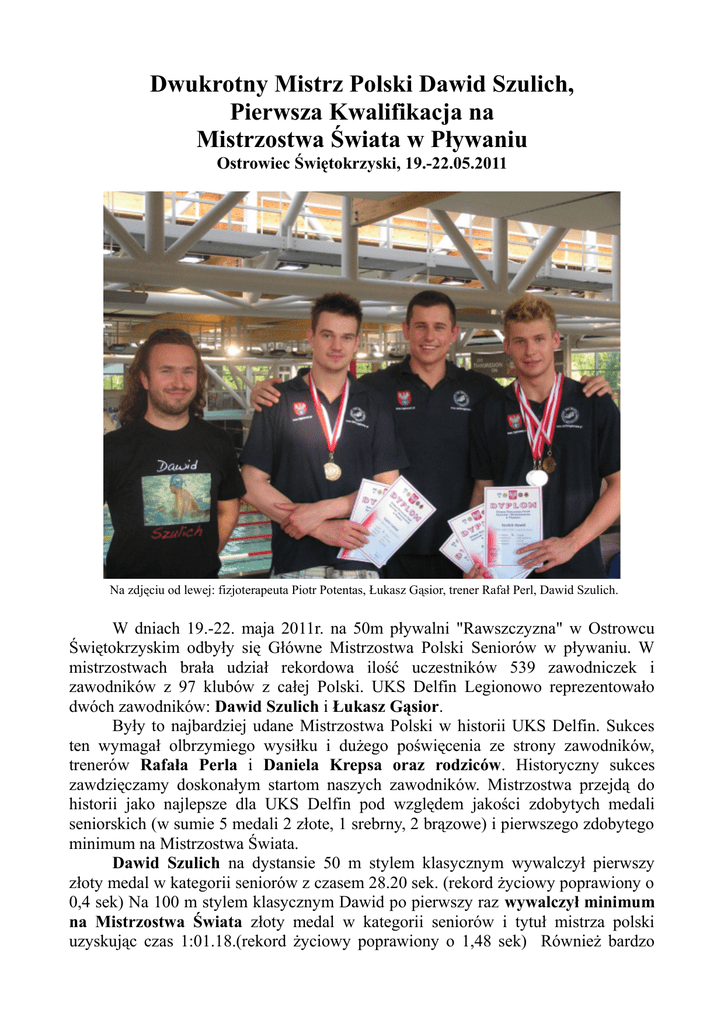 Dwukrotny Mistrz Polski Dawid Szulich, Pierwsza Kwalifikacja na Mistrzostwa Świata w Pływaniu Ostrowiec Świętokrzyski, 19.-22.05.2011 Na zdjęciu od lewej: fizjoterapeuta Piotr Potentas, Łukasz Gąsior, trener Rafał Perl, Dawid Szulich. W dniach 19.-22. maja 2011r. na 50m pływalni "Rawszczyzna" w Ostrowcu Świętokrzyskim odbyły się Główne Mistrzostwa Polski Seniorów w pływaniu. W mistrzostwach brała udział rekordowa ilość uczestników 539 zawodniczek i zawodników z 97 klubów z całej Polski. UKS Delfin Legionowo reprezentowało dwóch zawodników: Dawid Szulich i Łukasz Gąsior. Były to najbardziej udane Mistrzostwa Polski w historii UKS Delfin. Sukces ten wymagał olbrzymiego wysiłku i dużego poświęcenia ze strony zawodników, trenerów Rafała Perla i Daniela Krepsa oraz rodziców. Historyczny sukces zawdzięczamy doskonałym startom naszych zawodników. Mistrzostwa przejdą do historii jako najlepsze dla UKS Delfin pod względem jakości zdobytych medali seniorskich (w sumie 5 medali 2 złote, 1 srebrny, 2 brązowe) i pierwszego zdobytego minimum na Mistrzostwa Świata. Dawid Szulich na dystansie 50 m stylem klasycznym wywalczył pierwszy złoty medal w kategorii seniorów z czasem 28.20 sek. (rekord życiowy poprawiony o 0,4 sek) Na 100 m stylem klasycznym Dawid po pierwszy raz wywalczył minimum na Mistrzostwa Świata złoty medal w kategorii seniorów i tytuł mistrza polski uzyskując czas 1:01.18.(rekord życiowy poprawiony o 1,48 sek) Również bardzo udany start zaliczył na dystansie 200 m, po raz kolejny udowadniając, że jest w krajowej czołówce w stylu klasycznym. Wywalczył srebrny medal w kategorii seniorów z czasem 2:16.34. Dla samego zawodnika są to najlepsze mistrzostwa w jego karierze sportowej pod względem prestiżu zdobytych medali w kategorii senior ( 2 złote, 1 srebrny ) oraz uzyskanych rekordów życiowych i co najważniejsze uzyskania minimum na Mistrzostwa Świata. Był to najlepszy prezent urodzinowy, jaki sprawił sobie Dawid na przypadające 19. maja, jego 21. urodziny. Drugi zawodnik reprezentujący UKS Delfin Łukasz Gąsior również może zaliczyć mistrzostwa do udanych, ponieważ wywalczył dwa brązowe medale w kategorii seniorów. Na 50m stylem dowolnym Łukasz uległ tylko Konradowi Czerniakowi i Filipowi Wypychowi kolegom z byłej hiszpańskiej grupy treningowej, wynik Łukasza to 22.74sek. Ten sam kolor medalu powtórzył się na dystansie dwa razy dłuższym, gdzie Łukasz płynąc 51.06 sek. zdobył brąz w kategorii seniorów. Na 200m stylem dowolnym Łukasz zajął 9 miejsce z czasem 1:53.59 Mistrzostwa nie byłyby tak udane, gdyby nie pomoc na miejscu naszego fizjoterapeuty Piotra Potentasa i pracującego na co dzień w Legionowie Kamila Choszczyka. Gorące podziękowania dla wszystkich współtwórców i ojców tego wielkiego sukcesu UKS Delfin Legionowo m.in.: Urzędu Miasta Legionowo, grupy sponsorskiej "Szulich Team", Fundacji "Legionowo dla Ciebie", Adama Wilczęgi, Dyrekcji ZSO nr 2 i pływalni przy ZSO nr 2 w Legionowie, Klubu Perła Wellness w Michałowie Reginowie i wielu innych. /rp/, /tk/