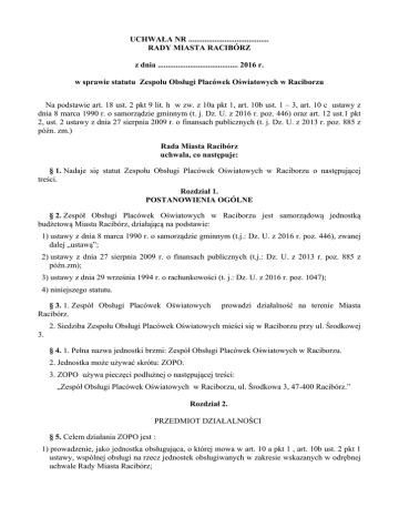 UCHWAŁA NR ........................................ RADY MIASTA RACIBÓRZ z dnia ........................................ 2016 r. w sprawie statutu Zespołu Obsługi Placówek Oświatowych w Raciborzu Na podstawie art. 18 ust. 2 pkt 9 lit. h w zw. z 10a pkt 1, art. 10b ust. 1 – 3, art. 10 c ustawy z dnia 8 marca 1990 r. o samorządzie gminnym (t. j. Dz. U. z 2016 r. poz. 446) oraz art. 12 ust.1 pkt 2, ust. 2 ustawy z dnia 27 sierpnia 2009 r. o finansach publicznych (t. j. Dz. U. z 2013 r. poz. 885 z późn. zm.) Rada Miasta Racibórz uchwala, co następuje: § 1. Nadaje się statut Zespołu Obsługi Placówek Oświatowych w Raciborzu o następującej treści. Rozdział 1. POSTANOWIENIA OGÓLNE § 2. Zespół Obsługi Placówek Oświatowych w Raciborzu jest samorządową jednostką budżetową Miasta Racibórz, działającą na podstawie: 1) ustawy z dnia 8 marca 1990 r. o samorządzie gminnym (t.j.: Dz. U. z 2016 r. poz. 446), zwanej dalej „ustawą”; 2) ustawy z dnia 27 sierpnia 2009 r. o finansach publicznych (t.j.: Dz. U. z 2013 r. poz. 885 z późn.zm); 3) ustawy z dnia 29 września 1994 r. o rachunkowości (t. j.: Dz. U. z 2016 r. poz. 1047); 4) niniejszego statutu. § 3. 1. Zespół Obsługi Placówek Oświatowych Racibórz. prowadzi działalność na terenie Miasta 2. Siedziba Zespołu Obsługi Placówek Oświatowych mieści się w Raciborzu przy ul. Środkowej 3. § 4. 1. Pełna nazwa jednostki brzmi: Zespół Obsługi Placówek Oświatowych w Raciborzu. 2. Jednostka może używać skrótu: ZOPO. 3. ZOPO używa pieczęci podłużnej o następującej treści: „Zespół Obsługi Placówek Oświatowych w Raciborzu, ul. Środkowa 3, 47-400 Racibórz.” Rozdział 2. PRZEDMIOT DZIAŁALNOŚCI § 5. Celem działania ZOPO jest : 1) prowadzenie, jako jednostka obsługująca, o której mowa w art. 10 a pkt 1 , art. 10b ust. 2 pkt 1 ustawy, wspólnej obsługi na rzecz jednostek obsługiwanych w zakresie wskazanych w odrębnej uchwale Rady Miasta Racibórz; 2) prowadzenie, jako jednostka obsługująca, o której mowa w art. 10a pkt 1, art. 10b ust. 2 pkt 1 ustawy, wspólnej obsługi na rzecz gminnych instytucji kultury na zasadach określonych w ustawie. § 6. 1. ZOPO wykonuje swoje zadania samodzielnie. 2. Nadzór nad działalnością ZOPO sprawuje Prezydent Miasta Racibórz. Rozdział 3. STRUKTURA ZOPO § 7. 1. Działalnością ZOPO kieruje Dyrektor, który reprezentuje ZOPO na zewnątrz. 2. W czasie nieobecności Dyrektora ZOPO jego zadania wykonuje posiadający umocowanie pracownik ZOPO. 3. Prezydent Miasta Racibórz wykonuje wobec Dyrektora ZOPO czynności z zakresu prawa pracy. § 8. 1. ZOPO jest pracodawcą w rozumieniu przepisów prawa pracy. 2. Pracownicy ZOPO są pracownikami samorządowymi w rozumieniu ustawy z dnia 21 listopada 2008 r. o pracownikach samorządowych. 3. Czynności w sprawach z zakresu prawa pracy wobec pracowników ZOPO wykonuje Dyrektor ZOPO lub upoważniona przez Dyrektora ZOPO osoba. § 9. Szczegółową organizację wewnętrzną ZOPO określa regulamin organizacyjny nadany przez Dyrektora ZOPO i zatwierdzany przez Prezydenta Miasta Racibórz. Rozdział 4. GOSPODARKA FINANSOWA § 10. 1. ZOPO prowadzi gospodarkę finansową na zasadach określonych w ustawie o finansach publicznych. 2. Podstawę gospodarki finansowej jednostki ZOPO stanowi plan finansowy. Rozdział 5. GOSPODAROWANIE MIENIEM ZOPO § 11. 1. Za prawidłowe gospodarowanie mieniem powierzonym przez Miasto Racibórz odpowiada Dyrektor ZOPO, które to powinno być użytkowane w sposób zapewniający jego zachowanie w należytym stanie oraz nie powodujący utraty lub zniszczenia. 2. Szczegółowe zasady gospodarowania mieniem, o którym mowa w ust. 1 określają odrębne przepisy, w szczególności ustawa o finansach publicznych, ustawa o rachunkowości oraz udzielone pełnomocnictwa. Rozdział 6. POSTANOWIENIA KOŃCOWE § 12. Zmiany postanowień niniejszego statutu następują w trybie właściwy dla jego uchwalenia. § 13. Traci moc Uchwała Nr XV/215/2012 Rady Miasta Racibórz z dnia 22 lutego 2012 r. w sprawie zatwierdzenia statutu Zespołu Obsługi Placówek Oświatowych z późniejszymi zmianami. § 14. Wykonanie uchwały powierza się Prezydentowi Miasta Racibórz. § 15. Uchwała wchodzi w życie z dniem 1 stycznia 2017 r. Uzasadnienie Zgodnie z art. 10 a pkt. 1 ustawy z dnia 8 marca 1990 r. o samorządzie gminnym (Dz. U. z 2016 r., poz. 446) gmina może zapewnić wspólną obsługę, w szczególności administracyjną, finansową i organizacyjną jednostkom organizacyjnym gminy zaliczanym do sektora finansów publicznych. W myśl postanowień art. 10 b ust. 2 ww. ustawy, Rada Miasta określiła w odrębnej uchwale jednostkę obsługującą, jednostki obsługiwane oraz zakres obowiązków powierzonych jednostkom obsługującym w ramach wspólnej obsługi. W związku z powyższym zaistniała konieczność nadania statutu Zespołowi Obsługi Placówek Oświatowych. Wobec powyższego podjęcie uchwały należy uznać za celowe i w pełni uzasadnione.