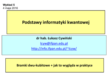 Wykład 5 4 maja 2016 Podstawy informatyki kwantowej dr hab. Łukasz Cywiński [email protected] http://info.ifpan.edu.pl/~lcyw/ Bramki dwu-kubitowe + jak to wygląda w praktyce A co z operacjami na większej ilości kubitów? Ewolucja układu opisaniego przez zależny od czasu H(t): Ewolucja unitarna opisana przez operator U(t) Uwaga: ewolucja jest zawsze odwracalna! (klasyczne bramki logiczne nie są odwracalne!) Ewolucja w mechanice kwantowej jest odwracalna (bo transformacje unitarne są odwracalne) – musi być możliwe puszczenie programu „od tyłu”! Transformacja unitarna w przestrzeni stanów dwóch kubitów – macierz 4x4 Baza stanów w kolejności: |11>, |10>, |01>, |00> A co z operacjami na większej ilości kubitów? Twierdzenie o rozkładzie operacji U na jedno- i dwukubitowe: Do zbudowania dowolnego U dla N kubitów wystarczą operacje na pojedyńczych kubitach, i operacje na parach kubitów (bramki dwukubitowe). Bramka dwukubitowa: wymaga kontrolowanego oddziaływania jednego kubitu z drugim. Oddziaływanie dwóch spinów Przykład: oddziaływanie dipolowe (magnetostatyczne) Przykład: oddziaływanie wymienne (elektrostatyczne + zakaz Pauliego) Pojawia się, gdy funkcje falowe dwóch elektronów zaczynają się przekrywać. Główny problem – oddziaływanie z resztą świata Czyste stany kwantowe są bardzo delikatne, prawie każde oddziaływanie z otoczeniem (nawet próżnią!) może zniszczyć ich prawdziwie kwantowe własności w procesie dekoherencji. Dlatego nie widzimy kwantowych zjawisk w makroświecie – żyjemy w silnym sprzężeniu z resztą świata. Obiektów makroskopowych praktycznie nie można odizolować od ich otoczenia. Faza jest szczególnie delikatna. Jeśli stracimy dobrze zdefiniowaną względną fazę, to zamiast kubitu będziemy mieli bardzo zły klasyczny bit Czas dekoherencji = TD Jak wiele obliczeń da się wykonać w tym czasie? Nie za dużo, o ile nie pogłówkujemy… Korekcja błędu W obecności szumu klasyczny analogowy komputer zawodzi… 1996 – odkrycie kwantowej korekcji błędu Wiele fizycznych kubitów koduje jeden kubit logiczny Stany kubitu logicznego są splątane: Kolektywny pomiar (np. parzystości dwóch fizycznych kubitów) Wykłady Johna Preskilla W ten sposób możemy wykryć błąd bez pomiaru stanu kubitu logicznego (pomiar zabija superpozycje!) Odporność na błędy (fault tolerance) Jeżeli prawdopodobieństwo błędu na operację jest poniżej pewnego progu, to zastosowanie kolejnej „warstwy” korekcji zmniejsza całkowite prawdopodobieństwo błędnego wykonania algorytmu (pomimo zwiększenia liczby fizycznych kubitów) Założenia twierdzeń o odporności: Lokalne błędy (bez korelacji pomiędzy kubitami), otoczenie nie „pamięta” co kubity robiły wcześniej. To nie jest całkowicie realistyczne, w szczególności dla kubitów w nanostrukturach. Ciągle trwa spór naukowy (choć większośc wierzy w teoretyczną odporność na błędy). Symulacja faktoryzacji Rozkład 1024-bitowej liczby algorytmem Shora (Suchara et al., arXiv:1312.2316) uwzględniając obliczeniowy koszt korekcji błędu. Trochę historii kubitów na kropkach bramkowanych 1998 - min. 30 elektronów w kropce, pomiar pojedynczego spinu? 2000 - pojedynczy elektron w kropce bramkowanej (Ciorga et al, PRB) 2002-4 - konwersja spin-ładunek - pomiar pojedynczego spinu 2005 - częściowa kontrola nad qubitem singletowo-trypletowym, bramka SWAP i SWAP1/2 2006 - ESR na pojedynczym spinie w kropce - oscylujące pole magnetyczne 2007-8 - EDSR: lokalne oscylujące pole elektryczne obraca spin 2009 - Pełna kontrola nad kubitem S-T 2011 - Długie czasy koherencji w kubicie S-T, zanik echa spinowego w ~40 s 2011 - Pełna kontrola nad dwoma kubitami spinowymi: obroty spinów i bramka dwu-kubitowa