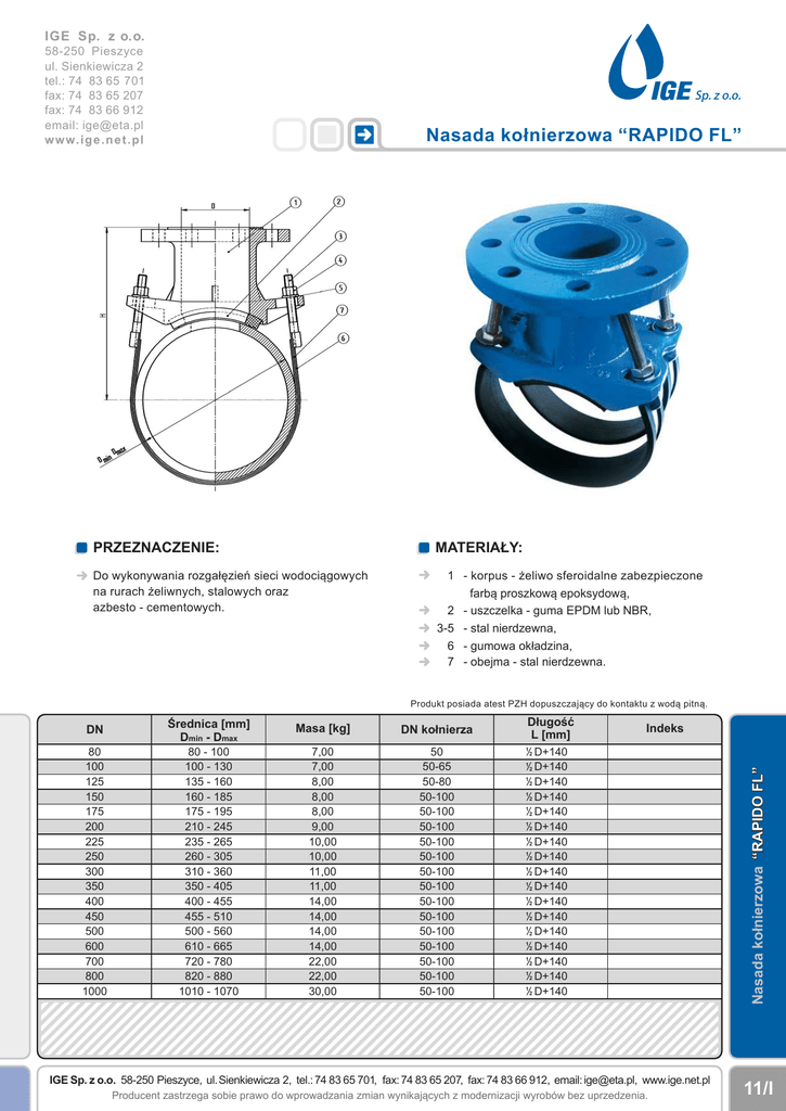IGE Sp. z o.o. 58-250 Pieszyce ul. Sienkiewicza 2 tel.: 74 83 65 701 fax: 74 83 65 207 fax: 74 83 66 912 email: [email protected] w w w. i g e . n e t . pl Sp. z o.o. Nasada kołnierzowa “RAPIDO FL” PRZEZNACZENIE: MATERIAŁY: Do wykonywania rozgałęzień sieci wodociągowych na rurach żeliwnych, stalowych oraz azbesto - cementowych. 1 - korpus - żeliwo sferoidalne zabezpieczone farbą proszkową epoksydową, 2 - uszczelka - guma EPDM lub NBR, 3-5 - stal nierdzewna, 6 - gumowa okładzina, 7 - obejma - stal nierdzewna. Produkt posiada atest PZH dopuszczający do kontaktu z wodą pitną. Średnica [mm] Dmin - Dmax Masa [kg] DN kołnierza 80 100 125 150 175 200 225 250 300 350 400 450 500 600 700 800 1000 80 - 100 100 - 130 135 - 160 160 - 185 175 - 195 210 - 245 235 - 265 260 - 305 310 - 360 350 - 405 400 - 455 455 - 510 500 - 560 610 - 665 720 - 780 820 - 880 1010 - 1070 7,00 7,00 8,00 8,00 8,00 9,00 10,00 10,00 11,00 11,00 14,00 14,00 14,00 14,00 22,00 22,00 30,00 50 50-65 50-80 50-100 50-100 50-100 50-100 50-100 50-100 50-100 50-100 50-100 50-100 50-100 50-100 50-100 50-100 Długość L [mm] 1 /2 D+140 1 /2 D+140 1 /2 D+140 1 /2 D+140 1 /2 D+140 1 /2 D+140 1 /2 D+140 1 /2 D+140 1 /2 D+140 1 /2 D+140 1 /2 D+140 1 /2 D+140 1 /2 D+140 1 /2 D+140 1 /2 D+140 1 /2 D+140 1 /2 D+140 Indeks IGE Sp. z o.o. 58-250 Pieszyce, ul. Sienkiewicza 2, tel.: 74 83 65 701, fax: 74 83 65 207, fax: 74 83 66 912, email: [email protected], www.ige.net.pl Producent zastrzega sobie prawo do wprowadzania zmian wynikających z modernizacji wyrobów bez uprzedzenia. Nasada kołnierzowa “RAPIDO FL” DN 11/I