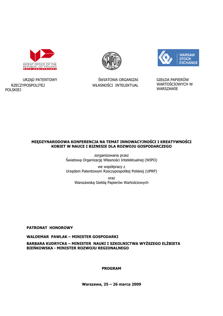 URZĄD PATENTOWY ŚWIATOWA ORGANIZACJA RZECZYPOSPOLITEJ POLSKIEJ WŁASNOŚCI INTELEKTUALNEJ GIEŁDA PAPIERÓW WARTOŚCIOWYCH W WARSZAWIE MIĘDZYNARODOWA KONFERENCJA NA TEMAT INNOWACYJNOŚCI I KREATYWNOŚCI KOBIET W NAUCE I BIZNESIE DLA ROZWOJU GOSPODARCZEGO zorganizowana przez Światową Organizację Własności Intelektualnej (WIPO) we współpracy z Urzędem Patentowym Rzeczypospolitej Polskiej (UPRP) oraz Warszawską Giełdą Papierów Wartościowych PATRONAT HONOROWY WALDEMAR PAWLAK – MINISTER GOSPODARKI BARBARA KUDRYCKA – MINISTER NAUKI I SZKOLNICTWA WYŻSZEGO ELŻBIETA BIEŃKOWSKA - MINISTER ROZWOJU REGIONALNEGO PROGRAM Warszawa, 25 – 26 marca 2009 CZWARTEK, 25 MARCA 2010 HOTEL SHERATON 10.00 – 11.00 Rejestracja 11.00 – 11.05 Otwarcie Konferencji dr Alicja Adamczak, Prezes Urzędu Patentowego Rzeczypospolitej Polskiej 11.05 - 11.45 Wystąpienia: Waldemar Pawlak, Prezes Rady Ministrów, Minister Gospodarki, Warszawa Barbara Kudrycka, Minister Nauki i Szkolnictwa Wyższego, Ministerstwo Nauki i Szkolnictwa Wyższego, Warszawa Maire Geoghegan-Quinn, Komisarz Europejski do spraw Badań, Innowacyjności i Nauki, Komisja Europejska, Bruksela (do potwierdzenia) Dr Francis Gurry, Dyrektor Generalny, Światowa Organizacja Własności Intelektualnej (WIPO), Genewa Mi-Young Han, Światowe Stowarzyszenie Kobiet Wynalazców i Przedsiębiorców, Korea 11.45 – 12.05 Przerwa kawowa 12.05 – 13.45 Temat 1: Innowacyjny i twórczy potencjał kobiet w globalnej gospodarce opartej na wiedzy. Kompetencje naukowe i biznesowe kobiet Wystąpienie: prof. Ewa Okoń-Horodyńska, Uniwersytet Jagielloński (UJ), Kraków Moderator: prof. Ewa Okoń – Horodyńska , UJ Kraków Wprowadzenie do panelu: prof. dr hab. Tadeusz Oleksyn, Uniwersytet Warszawski dr Leszek Mellibruda, psycholog biznesu, Warszawa Uczestnicy panelu: Judyta Kwaśniewska, Prezes, Galaktyka Kobiet Sp. z o.o. ,Nowy Sącz Bogna Szukalska, Dyrektor, STC Co.Ltd. ,Nowy Sącz Kinga Pawłowska, Dyrektor, Miasteczko Multimedialne Sp.z o.o,Nowy Sącz Małgorzata Chechlińska, Prezes GRUPY TRIP, Warszawa Tatiana Pogaevskaja, Dyrektor, MITON Medical Centre, Kijów, Ukraina 13.45 – 14.15 Dyskusja 14.15 – 15.15 Lunch 15.15 – 16.50 Temat 2: Edukacja podstawą kształtowania i rozwoju innowacyjnego i twórczego potencjału kobiet Wystąpienie: prof. Maria Orłowska, Sekretarz Stanu, Ministerstwo Nauki i Szkolnictwa Wyższego Moderator: prof. Maria Orłowska, Sekretarz Stanu , MNiSzW Uczestnicy panelu: Waldemar Siwiński, Prezes Fundacji “PERSPEKTYWY” Ewa Gołębiowska, Dyrektor Śląskiego Zamku Sztuki i Przedsiębiorczości w Cieszynie, prof. Mirosława Nowak – Dziemianowicz, Dolnośląska Szkoła Wyższa, Wrocław Ludmiła Shmygova, Dyrektor Międzyuczelnianego Centrum do spraw Marketingu Badań i Rozwoju- Park Naukowo- Technologiczny „Polytechnic”, Białoruska Państwowa Politechnika , Białoruś 16.50 – 17.20 17.20 – 18.00 Dyskusja Bufet 18.00 Wyjazd do teatru 19.00 Spektakl teatralny PIĄTEK, 26 MARCA 2010 GIEŁDA PAPIERÓW WARTOŚCIOWYCH S.A. 9.00 – 9.10 Otwarcie 2. części konferencji: dr Alicja Adamczak, UPRP 9.10- 9.25 9.25 – 9.50. 9.50 – 11.35 dr Lidia Adamska, członek Zarządu Giełdy Papierów Wartościowych w Warszawie wręczenie WIPO Award for Creativity dr Ludwikowi Sobolewskiemu, Prezesowi Giełdy Papierów Wartościowych S.A. Wystąpienie: Elżbieta Bieńkowska, Minister Rozwoju Regionalnego, Warszawa Temat 3: Jak zwiększyć wykorzystanie innowacyjnego i twórczego potencjału kobiet w nauce i biznesie- rola międzynarodowych, regionalnych i krajowych instytucji dr Ewa Rumińska –Zimny, Profesor, SGH, Warszawa Moderator : Dr Ewa Rumińska-Zimny Wprowadzenie do panelu: Henryka Bochniarz, Prezes Polskiej Konfederacji Pracodawców Prywatnych “Lewiatan”, Warszawa Uczestnicy panelu: Ewa Mańkiewicz – Cudny, Prezes NOT Marta Turk, naczelnik, Izba Handlowo – Przemysłowa w Lublanie, Słoweńska Izba Handlowa, Lublana Malinka Koparanova, Komisja Gospodarcza UNECE Genewa Laila Medin, Zastępca Sekretarza Stanu, Ministerstwo Sprawiedliwości Łotwa, Ryga Olaf Gajl, Dyrektor OPI, Warszawa 11.35 – 11.55 Dyskusja 11.55 – 12.15 Przerwa kawowa 12.15 – 13.40 Temat 4: Od pomysłu do biznesu – znaczenie finansowania innowacyjnej i twórczej aktywności kobiet Wystąpienia: dr Lidia Adamska, Członek Zarządu GPW Warszawa Bożena Lublińska-Kasprzak, Prezes Polskiej Agencji Rozwoju Przedsiębiorczości (PARP), Warszawa Moderator: dr Lidia Adamska Uczestnicy panelu: Serra Akcaoglu, Dyrektor Generalny, Citibank Turkey Przemysław Gdański, Członek Zarządu ds. Bankowości Korporacyjnej, BRE Bank, Warszawa Olga Grygier, Prezes, PricewaterhouseCoopers Polska, Warszawa Sonia Wędrychowicz- Horbatowska, Wiceprezes Bank City Handlowy Polska, Michał Pietras, Dyrektor Programów Finansowanych z Funduszy Strukturalnych, Fundacja na rzecz Nauki Polskiej, Warszawa Aneta Wilmańska , Wiceprezes PARP, Warszawa 13.40 - 14.00 Dyskusja 14.00 – 15.00 Lunch 15.00 – 16.30 Temat 5: Ochrona własności intelektualnej warunkiem sukcesów w gospodarce opartej na wiedzy 16.30 – 16.50 Wystąpienie: dr Alicja Adamczak UP RP Moderator: d Alicja Adamczak Wystąpienie: Mr.Omar Katbi, kierownik Sekcji Programów Pomocowych, Wydział komunikacji, WIPO, Genewa Uczestnicy panelu: Dr Margot Frohlinger, Dyrekcja Generalna Rynku Wewnętrznego i Usług, Dyrektor Dyrektoriatu , Komisja Europejska ,Bruksela Ms. Shlomit Yanisky- Ravid, Profesor, Wydział Prawa, Wyższa Szkoła i Uniwersytet Bar- Ilan, Kiryat Ono, Izrael Valentina V. Orlova, Prorektor ds. Nauki i Współpracy Międzynarodowej, Rosyjski Państwowy Instytut Własności Intelektualnej , Moskwa Mi-Young Han, Światowe Stowarzyszenie Kobiet Wynalazców i Przedsiębiorców, Korea Darina Kiljanowa, Prezes, Urząd Własności Przemysłowej Republiki Słowacji, Bańska Bystrzyca Lili Maksudyan, Dyrektor Departamentu Ministerstwa Gospodarki ,Armenia Dyskusja 16.50 – 17.00 Zamk