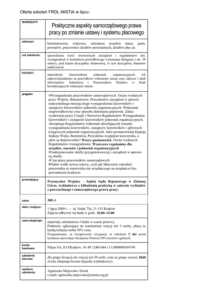 Oferta szkoleń FRDL MISTiA w lipcu: WARSZATY Praktyczne aspekty samorządowego prawa pracy po zmianie ustawy i systemu płacowego adresaci: burmistrzowie, wójtowie, sekretarze urzędów miast, gmin, powiatów, pracownicy działów personalnych, działów płac jst. cel szkolenia: sprawdzenie treści stworzonych zarządzeń i regulaminów dot. wynagrodzeń w kontekście prawidłowego wykonania delegacji z art. 39 ustawy, pod kątem dyscypliny finansowej, w tym dyscypliny finansów publicznych korzyści: nakreślenie kierownikom jednostek organizacyjnych ich odpowiedzialności za prawidłowe wdrożenie zmian oraz zakresu i skali obowiązków Sekretarza i Pracowników Działów w Kadr koordynujących wdrażanie zmian. program: #Wynagradzanie pracowników samorządowych. Ocena wydanych przez Wójtów, Burmistrzów, Prezydentów zarządzeń w sprawie maksymalnego miesięcznego wynagrodzenia kierowników i zastępców kierowników jednostek organizacyjnych. Wskazanie nieprawidłowości oraz sposobu dokonania poprawek. Zakaz wydawania przez Urzędy i Starostwa Regulaminów Wynagradzania kierowników i zastępców kierowników jednostek organizacyjnych. Akceptacja Regulaminów Jednostek określających warunki wynagradzania kierowników, zastępców kierowników i głównych księgowych jednostek organizacyjnych. Jakie postanowienia krępują funkcje Wójta, Burmistrza, Prezydenta względem kierownika, a jakie są dopuszczalne? Wzory postanowień. Ocena wydanych Regulaminów wynagradzania. Wzorcowe regulaminy dla urzędów, starostw i jednostek organizacyjnych #Funkcjonowanie służby przygotowawczej i zarządzeń w sprawie tej służby #Czas pracy pracowników samorządowych #Nabór wedle nowej ustawy, czyli jak faktycznie zatrudnić pracownika ze stanowiska nie urzędniczego na urzędnicze bez prowadzenia konkursu prowadzący: Przemysław Wojnicz – Sędzia Sądu Rejonowego w Zielonej Górze, wykładowca z kilkuletnią praktyką w zakresie wykładów z powszechnego i samorządowego prawa pracy. cena: 300 zł data i miejsce: 1 lipca 2009 r. — ul. Szlak 73a, 31-153 Kraków Zajęcia odbywać się będą w godz. 10.00–15.00 cena obejmuje: materiały szkoleniowe i bufet w czasie przerwy. Podmioty zgłaszające na seminarium więcej niż 2 osoby, płacą za każdą kolejną osobę 50% ceny. Przypominamy, że niezgłoszenie rezygnacji ze szkolenia 5 dni przed terminem spowoduje obciążenie Państwa 50% kosztów ogólnych. konto bankowe: Pekao SA, II O/Kraków, Nr 49 12401444 1111000009364749 szkolenie zlecone: dla grupy liczącej nie więcej niż 20 osób, cena za grupę wynosi 3840 zł (nie obejmuje kosztu dojazdu wykładowcy). opiekun szkolenia: Agnieszka Majewska–Siwek e-mail: [email protected] SEMINARIUM adresaci: Prawa mieszkańca DPS a skuteczność oddziaływań terapeutycznych pracownicy domów pomocy społecznej, ośrodków społecznej oraz inne osoby zainteresowane tematem. pomocy cel szkolenia: zdobycie wiedzy na temat praw i obowiązków mieszkańca Domu Pomocy Społecznej. korzyści: poszerzenie wiedzy m.in. na temat warunków skuteczności oddziaływań terapeutycznych w Domu Pomocy Społecznej. program: #Prawa mieszkańca Domu Pomocy Społecznej – problemy definicyjne #Prawa mieszkańca z różnych perspektyw: ustawodawcy, pracownika i samego mieszkańca #Analiza „Karty praw mieszkańca” #Sytuacje trudne związane z nieprzestrzeganiem „Karty praw mieszkańca” #Klasyfikacja mieszkańców ze względu na stopień świadomości swoich praw i sposobów ubiegania się o nie #Zachowania pracowników naruszające prawa mieszkańców #Procedura wymogów wobec pracownika DPS #Obowiązki mieszkańca DPS #Oddziaływania terapeutyczne – rodzaje, cele, zadania #Warunki skuteczności oddziaływań terapeutycznych #Pytania i odpowiedzi prowadzący: Monika Matusiak - pedagog z doświadczeniem w pracy z osobami niepełnosprawnymi i jako kierownik ZTO oraz Anna Rosińska – psycholog, pedagog, psychoterapeutka. cena: 195 zł data i miejsce: 7 lipca 2009 r. — ul. Szlak 73a, 31-153 Kraków Zajęcia odbywać się będą w godz. 9.00–15.00 cena obejmuje: materiały szkoleniowe i bufet w czasie przerwy. Podmioty zgłaszające na seminarium więcej niż 2 osoby, płacą za każdą kolejną osobę 50% ceny. Przypominamy, że niezgłoszenie rezygnacji ze szkolenia 5 dni przed terminem spowoduje obciążenie Państwa 50% kosztów ogólnych. konto bankowe: Pekao SA, II O/Kraków, Nr 49 12401444 1111000009364749 szkolenie zlecone: dla grupy liczącej nie więcej niż 20 osób, cena za grupę wynosi 2470 zł (nie obejmuje kosztu dojazdu wykładowcy). opiekun szkolenia: Agnieszka Majewska–Siwek e-mail: [email protected] SEMINARIUM Egzekucja z nieruchomości - windykacja i postępowanie egzekucyjne adresaci: pracownicy jednostek samorządowych zajmujący się windykacją należności cywilnoprawnych i postępowaniem egzekucyjnym. cel szkolenia: zdobycie wiedzy na temat zasad postępowania przy egzekucji z nieruchomości prowadzonej w ramach windykacji należności cywilnoprawnych i w postępowaniu egzekucyjnym w administracji. korzyści: poszerzenie wiedzy m.in. na temat egzekucji komorniczej, skarg na czynności komornika składanych w toku postepowania. program: #Egzekucja cywilna i administracyjna. Właściwość rzeczowa i miejscowa organu egzekucyjnego. Tytuł wykonawczy. Uczestnicy postępowania egzekucyjnego z nieruchomości. Egzekucja komornicza. Współpraca z komornikiem przyspieszająca egzekucje. Postępowanie egzekucyjne z kilku nieruchomości #Ustanawianie kuratora do zastępowania osoby nieobecnej. Zarządzanie zajętą nieruchomością. Wpis do księgi wieczystej w formie ostrzeżenia o wszczęciu postępowania egzekucyjnego. Etapy egzekucji. Egzekucja roszczeń zabezpieczonych hipoteką przymusową. Egzekucja z ułamkowej części nieruchomości i z użytkowania wieczystego. Uproszczona egzekucja z nieruchomości. Podział sumy uzyskanej przez egzekucję z nieruchomości. 