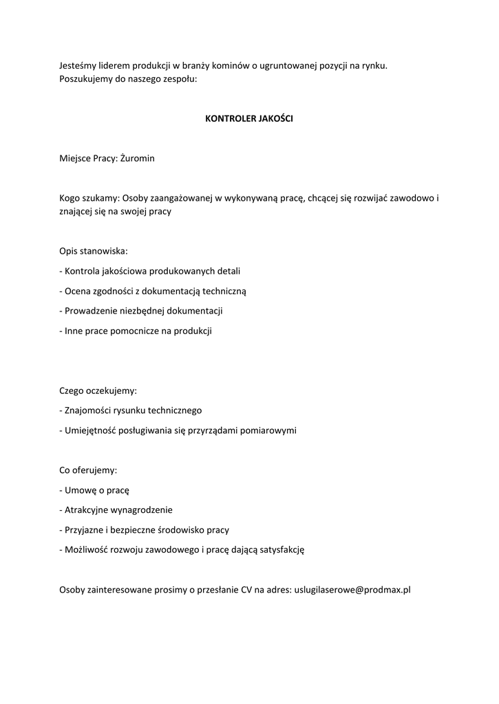 Jesteśmy liderem produkcji w branży kominów o ugruntowanej pozycji na rynku. Poszukujemy do naszego zespołu: KONTROLER JAKOŚCI Miejsce Pracy: Żuromin Kogo szukamy: Osoby zaangażowanej w wykonywaną pracę, chcącej się rozwijać zawodowo i znającej się na swojej pracy Opis stanowiska: - Kontrola jakościowa produkowanych detali - Ocena zgodności z dokumentacją techniczną - Prowadzenie niezbędnej dokumentacji - Inne prace pomocnicze na produkcji Czego oczekujemy: - Znajomości rysunku technicznego - Umiejętność posługiwania się przyrządami pomiarowymi Co oferujemy: - Umowę o pracę - Atrakcyjne wynagrodzenie - Przyjazne i bezpieczne środowisko pracy - Możliwość rozwoju zawodowego i pracę dającą satysfakcję Osoby zainteresowane prosimy o przesłanie CV na adres: [email protected]
