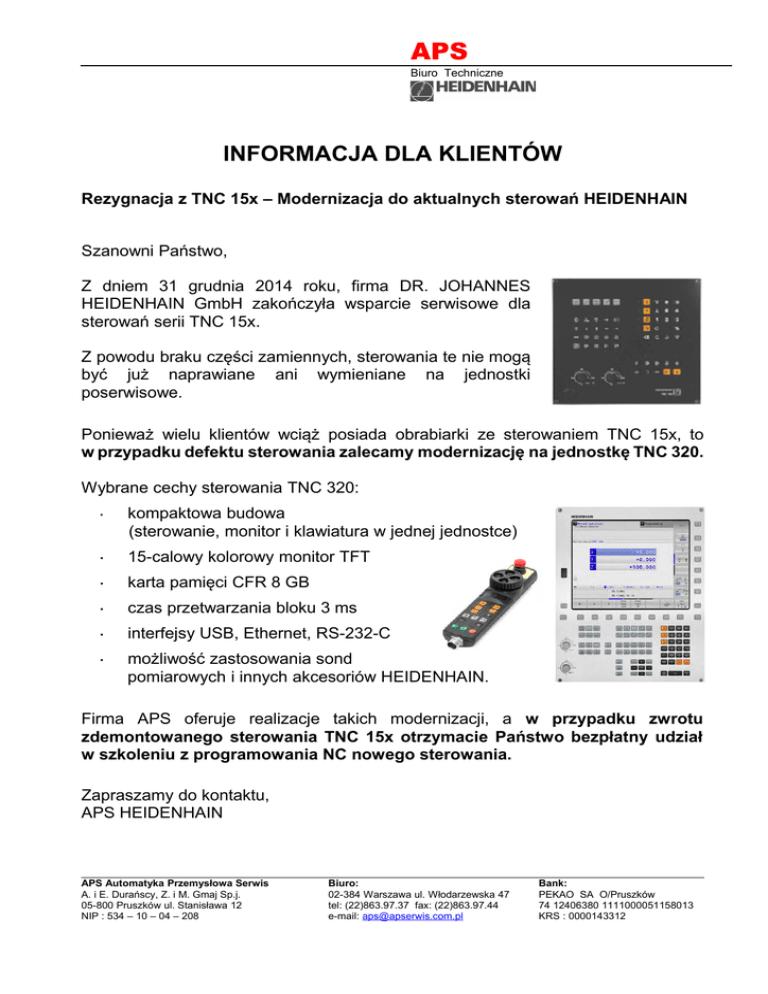 APS Biuro Techniczne INFORMACJA DLA KLIENTÓW Rezygnacja z TNC 15x – Modernizacja do aktualnych sterowań HEIDENHAIN Szanowni Państwo, Z dniem 31 grudnia 2014 roku, firma DR. JOHANNES HEIDENHAIN GmbH zakończyła wsparcie serwisowe dla sterowań serii TNC 15x. Z powodu braku części zamiennych, sterowania te nie mogą być już naprawiane ani wymieniane na jednostki poserwisowe. Ponieważ wielu klientów wciąż posiada obrabiarki ze sterowaniem TNC 15x, to w przypadku defektu sterowania zalecamy modernizację na jednostkę TNC 320. Wybrane cechy sterowania TNC 320: kompaktowa budowa (sterowanie, monitor i klawiatura w jednej jednostce) 15-calowy kolorowy monitor TFT karta pamięci CFR 8 GB czas przetwarzania bloku 3 ms interfejsy USB, Ethernet, RS-232-C możliwość zastosowania sond pomiarowych i innych akcesoriów HEIDENHAIN. Firma APS oferuje realizacje takich modernizacji, a w przypadku zwrotu zdemontowanego sterowania TNC 15x otrzymacie Państwo bezpłatny udział w szkoleniu z programowania NC nowego sterowania. Zapraszamy do kontaktu, APS HEIDENHAIN APS Automatyka Przemysłowa Serwis A. i E. Durańscy, Z. i M. Gmaj Sp.j. 05-800 Pruszków ul. Stanisława 12 NIP : 534 – 10 – 04 – 208 Biuro: 02-384 Warszawa ul. Włodarzewska 47 tel: (22)863.97.37 fax: (22)863.97.44 e-mail: [email protected] Bank: PEKAO SA O/Pruszków 74 12406380 1111000051158013 KRS : 0000143312