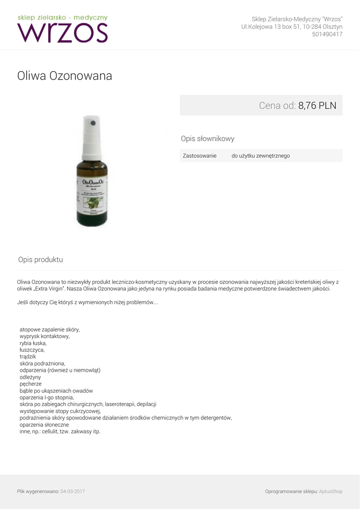 Sklep Zielarsko-Medyczny "Wrzos" Ul.Kolejowa 13 box 51, 10-284 Olsztyn 501490417 Oliwa Ozonowana Cena od: 8,76 PLN Opis słownikowy Zastosowanie do użytku zewnętrznego Opis produktu Oliwa Ozonowana to niezwykły produkt leczniczo-kosmetyczny uzyskany w procesie ozonowania najwyższej jakości kreteńskiej oliwy z oliwek „Extra Virgin”. Nasza Oliwa Ozonowana jako jedyna na rynku posiada badania medyczne potwierdzone świadectwem jakości. Jeśli dotyczy Cię któryś z wymienionych niżej problemów…. atopowe zapalenie skóry, wyprysk kontaktowy, rybia łuska, łuszczyca, trądzik skóra podrażniona, odparzenia (również u niemowląt) odleżyny pęcherze bąble po ukąszeniach owadów oparzenia I-go stopnia, skóra po zabiegach chirurgicznych, laseroterapii, depilacji występowanie stopy cukrzycowej, podrażnienia skóry spowodowane działaniem środków chemicznych w tym detergentów, oparzenia słoneczne inne, np.: cellulit, tzw. zakwasy itp. Plik wygenerowano: 04-03-2017 Oprogramowanie sklepu: AptusShop Sklep Zielarsko-Medyczny "Wrzos" Ul.Kolejowa 13 box 51, 10-284 Olsztyn 501490417 …. A chcesz doprowadzić do….. złagodzenia oparzeń słonecznych spowolnienia procesu starzenia skóry odmładzając, ujędrniając i wygładzając ją, działań antybakteryjnych, przeciwgrzybiczych i przeciwzapalnych, które oczyszczą skórę rewitalizując ją poprzez natlenianie, poprawienia krążenia krwi i limfy, przyspieszenia dostarczania tlenu do tkanek zmniejszając stany zapalne i zastój płynów charakterystyczny dla cellulitu, przyspieszenia gojenia się uszkodzonej skóry, działań wewnątrzkomórkowych niwelujących zakwasy powstałe po wysiłku fizycznym po prostu musisz stosować Oliwę Ozonowaną!! Dzięki jej niesamowitym właściwościom pozbędziesz się szpecących zmian skórnych, odmłodzisz i zrewitalizujesz swoja skórę. Jak stosować Oliwę Ozonowaną? W pielęgnacji kosmetycznej - cienką warstwą preparatu pokryć suchą skórę (czynność powtarzać 2 do 4 razy dziennie), jeżeli jest taka potrzeba po godzinie zmyć oliwę tonikiem lub ciepłą wodą z delikatnym mydłem W pielęgnacji leczniczej – nasączyć oliwą jałową gazę i przyłożyć na miejsca zmienione chorobowo na 1 godzinę (potarzać czynność 2 do 3 razy dziennie), po usunięciu opatrunku nie ścierać pozostałości) Ja właściwie przechowywać Oliwę Ozonowaną: butelka farmaceutyczna jest wykonana z ciemnego szkła i posiada nakrętkę z zabezpieczeniem, przed otwarciem należy skontrolować stan nakrętki - powinna być nienaruszona, preparat powinien być przechowywany w oryginalnym opakowaniu w ciemnym, chłodnym miejscu (wskazana lodówka), poza zasięgiem dzieci; UWAGA: nie jest to produkt spożywczy! przed użyciem wymieszać zawartość poprzez kilkakrotne przekręcanie butelki dnem do góry, osad na dnie jest zjawiskiem naturalnym, przy przechowywaniu preparatu w lodówce oliwa może być gęsta uniemożliwiając jest wylanie dlatego po wyjęciu preparatu z lodówki należy odczekać aż oliwa ogrzeje się do temperatury pokojowej, wylać potrzebną ilość oliwki na spodeczek/opatrunek i zakręcić butelkę, ozonowana oliwka ma swoisty zapach ozonków, przy przechowywaniu w temperaturze pokojowej preparat jest przydatny do użycia przez 12 miesięcy od daty produkcji, przy przechowywaniu w lodówce przez 18 miesięcy od daty produkcji; data produkcji jest umieszczona na etykiecie. Producent : CzystyOzon Plik wygenerowano: 04-03-2017 Oprogramowanie sklepu: AptusShop Sklep Zielarsko-Medyczny "Wrzos" Ul.Kolejowa 13 box 51, 10-284 Olsztyn 501490417 Warianty produktu Plik wygenerowano: 04-03-2017 Powered by TCPDF (www.tcpdf.org) Oliwa Ozonowana 10 ml 8,76 PLN Oliwa Ozonowana 50 ml 22,69 PLN Oliwa Ozonowana 100 ml 33,33 PLN Oprogramowanie sklepu: AptusShop