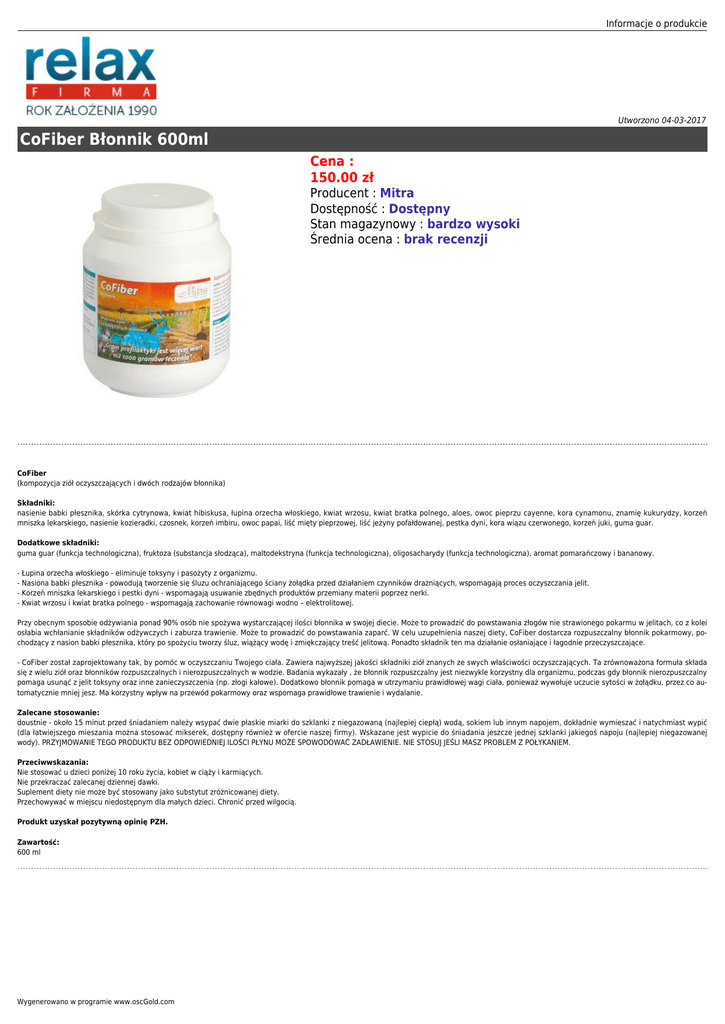 Informacje o produkcie Utworzono 04-03-2017 CoFiber Błonnik 600ml Cena : 150.00 zł Producent : Mitra Dostępność : Dostępny Stan magazynowy : bardzo wysoki Średnia ocena : brak recenzji CoFiber (kompozycja ziół oczyszczających i dwóch rodzajów błonnika) Składniki: nasienie babki płesznika, skórka cytrynowa, kwiat hibiskusa, łupina orzecha włoskiego, kwiat wrzosu, kwiat bratka polnego, aloes, owoc pieprzu cayenne, kora cynamonu, znamię kukurydzy, korzeń mniszka lekarskiego, nasienie kozieradki, czosnek, korzeń imbiru, owoc papai, liść mięty pieprzowej, liść jeżyny pofałdowanej, pestka dyni, kora wiązu czerwonego, korzeń juki, guma guar. Dodatkowe składniki: guma guar (funkcja technologiczna), fruktoza (substancja słodząca), maltodekstryna (funkcja technologiczna), oligosacharydy (funkcja technologiczna), aromat pomarańczowy i bananowy. - Łupina orzecha włoskiego - eliminuje toksyny i pasożyty z organizmu. - Nasiona babki płesznika - powodują tworzenie się śluzu ochraniającego ściany żołądka przed działaniem czynników drażniących, wspomagają proces oczyszczania jelit. - Korzeń mniszka lekarskiego i pestki dyni - wspomagają usuwanie zbędnych produktów przemiany materii poprzez nerki. - Kwiat wrzosu i kwiat bratka polnego - wspomagają zachowanie równowagi wodno – elektrolitowej. Przy obecnym sposobie odżywiania ponad 90% osób nie spożywa wystarczającej ilości błonnika w swojej diecie. Może to prowadzić do powstawania złogów nie strawionego pokarmu w jelitach, co z kolei osłabia wchłanianie składników odżywczych i zaburza trawienie. Może to prowadzić do powstawania zaparć. W celu uzupełnienia naszej diety, CoFiber dostarcza rozpuszczalny błonnik pokarmowy, pochodzący z nasion babki płesznika, który po spożyciu tworzy śluz, wiążący wodę i zmiękczający treść jelitową. Ponadto składnik ten ma działanie osłaniające i łagodnie przeczyszczające. - CoFiber został zaprojektowany tak, by pomóc w oczyszczaniu Twojego ciała. Zawiera najwyższej jakości składniki ziół znanych ze swych właściwości oczyszczających. Ta zrównoważona formuła składa się z wielu ziół oraz błonników rozpuszczalnych i nierozpuszczalnych w wodzie. Badania wykazały , że błonnik rozpuszczalny jest niezwykle korzystny dla organizmu, podczas gdy błonnik nierozpuszczalny pomaga usunąć z jelit toksyny oraz inne zanieczyszczenia (np. złogi kałowe). Dodatkowo błonnik pomaga w utrzymaniu prawidłowej wagi ciała, ponieważ wywołuje uczucie sytości w żołądku, przez co automatycznie mniej jesz. Ma korzystny wpływ na przewód pokarmowy oraz wspomaga prawidłowe trawienie i wydalanie. Zalecane stosowanie: doustnie - około 15 minut przed śniadaniem należy wsypać dwie płaskie miarki do szklanki z niegazowaną (najlepiej ciepłą) wodą, sokiem lub innym napojem, dokładnie wymieszać i natychmiast wypić (dla łatwiejszego mieszania można stosować mikserek, dostępny również w ofercie naszej firmy). Wskazane jest wypicie do śniadania jeszcze jednej szklanki jakiegoś napoju (najlepiej niegazowanej wody). PRZYJMOWANIE TEGO PRODUKTU BEZ ODPOWIEDNIEJ ILOŚCI PŁYNU MOŻE SPOWODOWAĆ ZADŁAWIENIE. NIE STOSUJ JEŚLI MASZ PROBLEM Z POŁYKANIEM. Przeciwwskazania: Nie stosować u dzieci poniżej 10 roku życia, kobiet w ciąży i karmiących. Nie przekraczać zalecanej dziennej dawki. Suplement diety nie może być stosowany jako substytut zróżnicowanej diety. Przechowywać w miejscu niedostępnym dla małych dzieci. Chronić przed wilgocią. Produkt uzyskał pozytywną opinię PZH. Zawartość: 600 ml Wygenerowano w programie www.oscGold.com