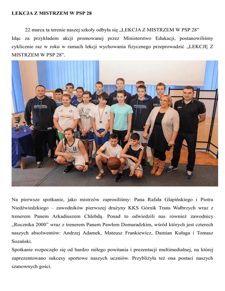 LEKCJA Z MISTRZEM W PSP 28 22 marca ta terenie naszej szkoły odbyła się „LEKCJA Z MISTRZEM W PSP 28” Idąc za przykładem akcji promowanej przez Ministerstwo Edukacji, postanowiliśmy cyklicznie raz w roku w ramach lekcji wychowania fizycznego przeprowadzić „LEKCJĘ Z MISTRZEM W PSP 28”. Na pierwsze spotkanie, jako mistrzów zaprosiliśmy: Pana Rafała Glapińskiego i Piotra Niedźwiedzkiego – zawodników pierwszej drużyny KKS Górnik Trans Wałbrzych wraz z trenerem Panem Arkadiuszem Chlebdą. Ponad to odwiedzili nas również zawodnicy „Rocznika 2000” wraz z trenerem Panem Pawłem Domaradzkim, wśród których jest czterech naszych absolwentów: Andrzej Adamek, Mateusz Frankiewicz, Damian Kułaga i Tomasz Sozański. Spotkanie rozpoczęło się od bardzo miłego powitania i prezentacji multimedialnej, na której zaprezentowano sukcesy sportowe naszych uczniów. Przybliżyła też ona postaci naszych szanownych gości. „Lekcja z Mistrzem” ma na celu rozpropagowanie akcji STOP ZWOLNIENIOM Z WF-U, Podczas naszego spotkania Mistrzowie przeprowadzili konkurs wiedzy o Górniku Wałbrzych i okazało się, że wiedza na ten temat była imponująca. Druga część spotkania to trening pokazowy, następnie uczniowie pod okiem MISTRZÓW doskonalili elementy piłki koszykowej. Na koniec rozegrano mecz, do składu uczniów PSP 28 dołączył R. Glapiński i P. Niedźwiedzki.