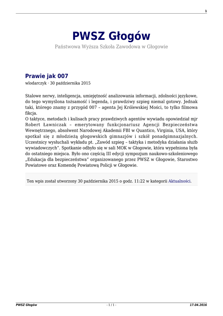 1 PWSZ Głogów Państwowa Wyższa Szkoła Zawodowa w Głogowie Prawie jak 007 wlodarczyk · 30 października 2015 Stalowe nerwy, inteligencja, umiejętność analizowania informacji, zdolności językowe, do tego wymyślona tożsamość i legenda, i prawdziwy szpieg niemal gotowy. Jednak taki, którego znamy z przygód 007 – agenta Jej Królewskiej Mości, to tylko filmowa fikcja. O taktyce, metodach i kulisach pracy prawdziwych agentów wywiadu opowiedział mjr Robert Ławniczak – emerytowany funkcjonariusz Agencji Bezpieczeństwa Wewnętrznego, absolwent Narodowej Akademii FBI w Quantico, Virginia, USA, który spotkał się z młodzieżą głogowskich gimnazjów i szkół ponadgimnazjalnych. Uczestnicy wysłuchali wykładu pt. „Zawód szpieg – taktyka i metodyka działania służb wywiadowczych”. Spotkanie odbyło się w sali MOK w Głogowie, która wypełniona była do ostatniego miejsca. Było ono częścią III edycji sympozjum naukowo-szkoleniowego „Edukacja dla bezpieczeństwa” organizowanego przez PWSZ w Głogowie, Starostwo Powiatowe oraz Komendę Powiatową Policji w Głogowie. Ten wpis został utworzony 30 października 2015 o godz. 11:22 w kategorii Aktualności. PWSZ Głogów -1/1- 17.04.2016
