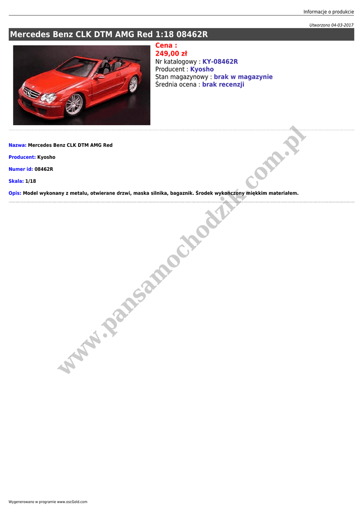 Informacje o produkcie Utworzono 04-03-2017 Mercedes Benz CLK DTM AMG Red 1:18 08462R Cena : 249,00 zł .p l Nr katalogowy : KY-08462R Producent : Kyosho Stan magazynowy : brak w magazynie Średnia ocena : brak recenzji Nazwa: Mercedes Benz CLK DTM AMG Red om Producent: Kyosho Numer id: 08462R .c Skala: 1/18 w w w .p an sa m oc ho dz ik Opis: Model wykonany z metalu, otwierane drzwi, maska silnika, bagaznik. Środek wykończony miękkim materiałem. Wygenerowano w programie www.oscGold.com