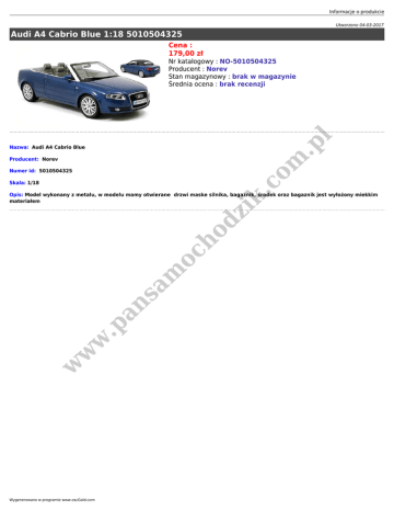 Informacje o produkcie Utworzono 04-03-2017 Audi A4 Cabrio Blue 1:18 5010504325 Cena : 179,00 zł .p l Nr katalogowy : NO-5010504325 Producent : Norev Stan magazynowy : brak w magazynie Średnia ocena : brak recenzji Nazwa: Audi A4 Cabrio Blue om Producent: Norev Numer id: 5010504325 .c Skala: 1/18 w w w .p an sa m oc ho dz ik Opis: Model wykonany z metalu, w modelu mamy otwierane drzwi maske silnika, bagaznik, środek oraz bagaznik jest wyłożony miekkim materiałem Wygenerowano w programie www.oscGold.com