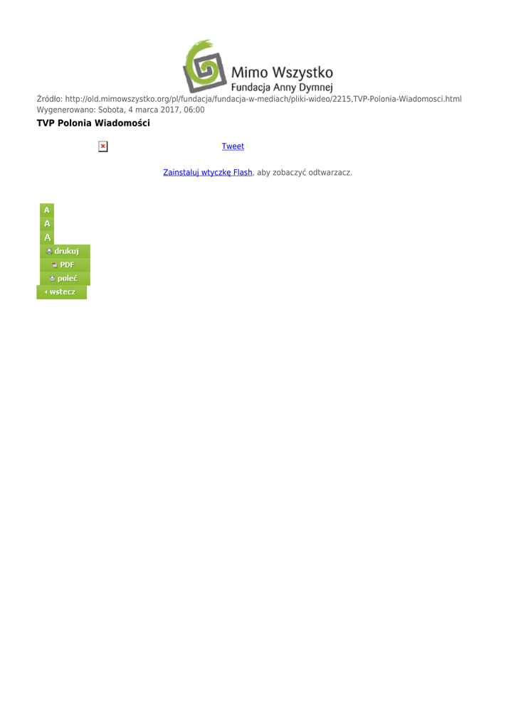 Źródło: http://old.mimowszystko.org/pl/fundacja/fundacja-w-mediach/pliki-wideo/2215,TVP-Polonia-Wiadomosci.html Wygenerowano: Sobota, 4 marca 2017, 06:00 TVP Polonia Wiadomości Tweet Zainstaluj wtyczkę Flash, aby zobaczyć odtwarzacz.