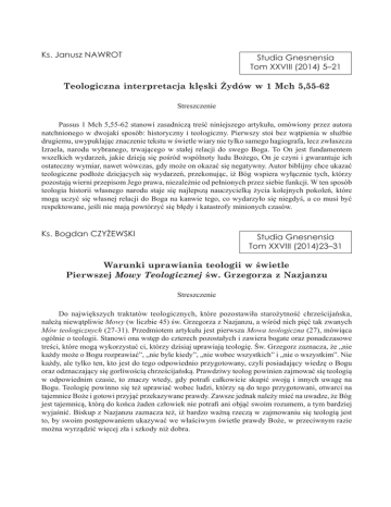 Ks. Janusz NAWROT Studia Gnesnensia Tom XXVIII (2014) 5–21 Teologiczna interpretacja klęski Żydów w 1 Mch 5,55-62 Streszczenie Passus 1 Mch 5,55-62 stanowi zasadniczą treść niniejszego artykułu, omówiony przez autora natchnionego w dwojaki sposób: historyczny i teologiczny. Pierwszy stoi bez wątpienia w służbie drugiemu, uwypuklając znaczenie tekstu w świetle wiary nie tylko samego hagiografa, lecz zwłaszcza Izraela, narodu wybranego, trwającego w stałej relacji do swego Boga. To On jest fundamentem wszelkich wydarzeń, jakie dzieją się pośród wspólnoty ludu Bożego, On je czyni i gwarantuje ich ostateczny wymiar, nawet wówczas, gdy może on okazać się negatywny. Autor biblijny chce ukazać teologiczne podłoże dziejących się wydarzeń, przekonując, iż Bóg wspiera wyłącznie tych, którzy pozostają wierni przepisom Jego prawa, niezależnie od pełnionych przez siebie funkcji. W ten sposób teologia historii własnego narodu staje się najlepszą nauczycielką życia kolejnych pokoleń, które mogą uczyć się własnej relacji do Boga na kanwie tego, co wydarzyło się niegdyś, a co musi być respektowane, jeśli nie mają powtórzyć się błędy i katastrofy minionych czasów. Ks. Bogdan CZYŻEWSKI Studia Gnesnensia Tom XXVIII (2014)23–31 Warunki uprawiania teologii w świetle Pierwszej Mowy Teologicznej św. Grzegorza z Nazjanzu Streszczenie Do największych traktatów teologicznych, które pozostawiła starożytność chrześcijańska, należą niewątpliwie Mowy (w liczbie 45) św. Grzegorza z Nazjanzu, a wśród nich pięć tak zwanych Mów teologicznych (27-31). Przedmiotem artykułu jest pierwsza Mowa teologiczna (27), mówiąca ogólnie o teologii. Stanowi ona wstęp do czterech pozostałych i zawiera bogate oraz ponadczasowe treści, które mogą wykorzystać ci, którzy dzisiaj uprawiają teologię. Św. Grzegorz zaznacza, że „nie każdy może o Bogu rozprawiać”, „nie byle kiedy”, „nie wobec wszystkich” i „nie o wszystkim”. Nie każdy, ale tylko ten, kto jest do tego odpowiednio przygotowany, czyli posiadający wiedzę o Bogu oraz odznaczający się gorliwością chrześcijańską. Prawdziwy teolog powinien zajmować się teologią w odpowiednim czasie, to znaczy wtedy, gdy potrafi całkowicie skupić swoją i innych uwagę na Bogu. Teologię powinno się też uprawiać wobec ludzi, którzy są do tego przygotowani, otwarci na tajemnice Boże i gotowi przyjąć przekazywane prawdy. Zawsze jednak należy mieć na uwadze, że Bóg jest tajemnicą, którą do końca żaden człowiek nie potrafi ani objąć swoim rozumem, a tym bardziej wyjaśnić. Biskup z Nazjanzu zaznacza też, iż bardzo ważną rzeczą w zajmowaniu się teologią jest to, by swoim postępowaniem ukazywać we właściwym świetle prawdy Boże, w przeciwnym razie można wyrządzić więcej zła i szkody niż dobra. Ks. Piotr JASKÓŁA Studia Gnesnensia Tom XXVIII (2014) 33–45 Natura i misja Kościoła Świadectwo rozwoju eklezjologii Komisji „Wiara i Ustrój” Streszczenie Studyjny tekst Natura i misja Kościoła – (NMC) reprezentuje bieżący stan refleksji nad Kościołem wypracowany przez Komisję „Wiara i Ustrój”. Tekst stanowi znaczącą rewizję wcześniejszego dokumentu zatytułowanego Natura i cel Kościoła. Podtytuł Etap na drodze ku wspólnemu oświadczeniu wskazuje, że jest to też tekst tymczasowy, również jeszcze dzieło będące w rozwoju. Dokument jest świadectwem postępu dokonanego przez chrześcijańskie wspólnoty na drodze do jedności, ponieważ konwergencje pokazują, jak wiele potrafimy już wspólnie powiedzieć o Kościele. Studyjny tekst ujawnia również zdolność uczciwego mówienia o wszelkich różnicach. W uzgodnionym tekście Trójca Święta jest punktem wyjścia dla zrozumienia natury Kościoła, specjalnie jego jedności w wielości. Kościół jest dziełem Bożego Słowa i Ducha Świętego. Będąc Bożym darem, nie może istnieć dla siebie. Bp Henryk WEJMAN Studia Gnesnensia Tom XXVIII (2014) 47–57 Ufność w życiu moralno-duchowym człowieka Streszczenie Celem artykułu jest ukazanie wartości postawy ufności w rozwoju moralno-duchowym człowieka. Tak określony cel był realizowany w trzech etapach. Najpierw została zaprezentowana podstawa ufności. Stanowi je w pierwszym rzędzie dzieło stworzenia człowieka przez Boga na Jego obraz i podobieństwo. Z faktu, iż człowiek został powołany przez Boga do istnienia płynie dla niego apel do powierzenia się Jemu. Drugim obliczem tej podstawy jest dzieło odkupienia człowieka przez Chrystusa. Właśnie On w akcie odkupienia dał człowiekowi dowód bezgranicznej miłości Boga wobec niego, a tym samym zaprosił go do zaufania Jemu. Odsłonięcie podstawy ufności skierowało refleksję w stronę zaprezentowania jej natury. W efekcie analiz danych źródłowych ufność została określona jako bezwarunkowe zdanie się człowieka na Boga i trwanie w Jego obecności. Taka postawa nie ma charakteru statycznego, lecz podlega rozwojowi. Wzrost człowieka w zaufaniu Bogu wzmaga się na miarę uznania przez niego osobistej relacji wobec Niego, czyli pokory i stopnia intensywności dialogowania z Nim, czyli modlitwy. Ostatnim etapem refleksji było zaprezentowanie wartości postawy w moralno-duchowym wzroście człowieka. Kierując się zaufaniem Bogu, człowiek nabiera siły duchowej do zmagania się z osobistymi niedoskonałościami, aby je przezwyciężyć i staje się coraz bardziej nieugięty w doskonaleniu własnego człowieczeństwa. Tak wewnętrznie odrodzony człowiek nabiera większej wrażliwości na bliźnich i bywa gotowy do zaradzania ich potrzebom. W ten sposób ufność stanowi zasadniczy czynnik jego otwartości społecznej. Ks. Jarosław MOSKAŁYK Studia Gnesnensia Tom XXVIII (2014) 59–70 Chrześcijańska wizja współczesnego człowieka Streszczenie Jednym z podstawowych przymiotów chrześcijańskiej wizji człowieka jest jego n