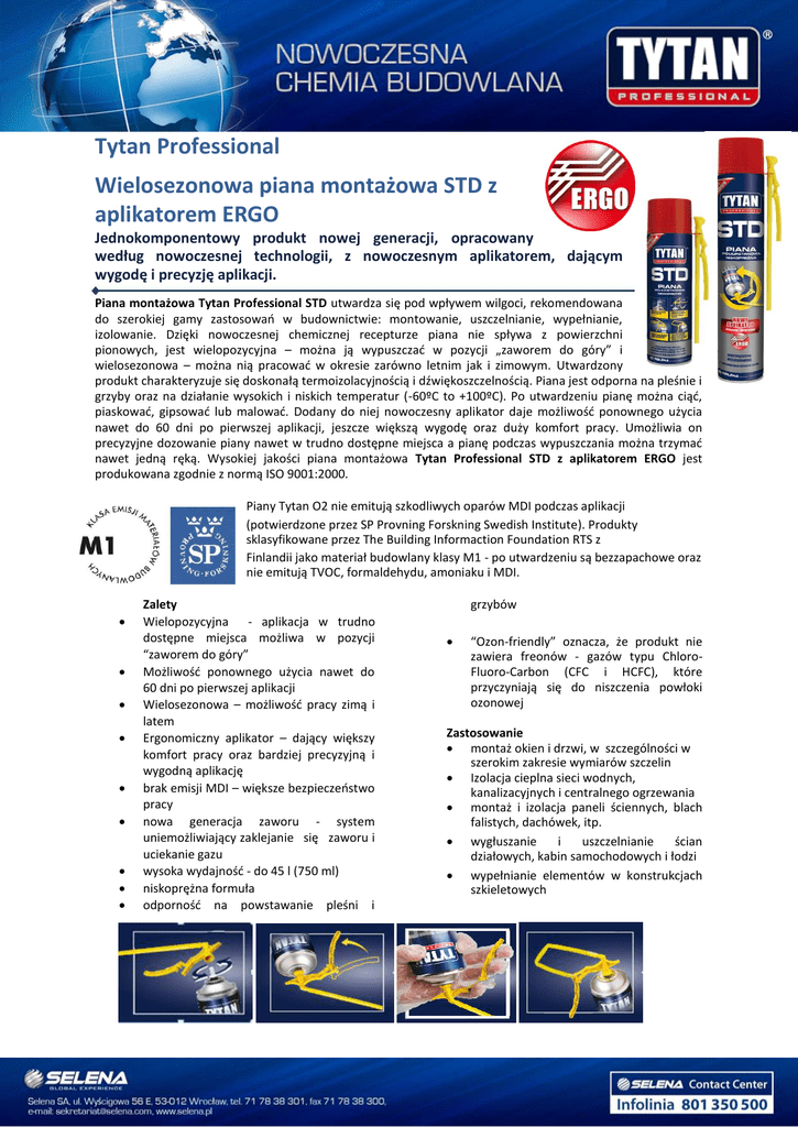 Tytan Professional Wielosezonowa piana montażowa STD z aplikatorem ERGO Jednokomponentowy produkt nowej generacji, opracowany według nowoczesnej technologii, z nowoczesnym aplikatorem, dającym wygodę i precyzję aplikacji. Piana montażowa Tytan Professional STD utwardza się pod wpływem wilgoci, rekomendowana do szerokiej gamy zastosowań w budownictwie: montowanie, uszczelnianie, wypełnianie, izolowanie. Dzięki nowoczesnej chemicznej recepturze piana nie spływa z powierzchni pionowych, jest wielopozycyjna – można ją wypuszczać w pozycji „zaworem do góry” i wielosezonowa – można nią pracować w okresie zarówno letnim jak i zimowym. Utwardzony produkt charakteryzuje się doskonałą termoizolacyjnością i dźwiękoszczelnością. Piana jest odporna na pleśnie i grzyby oraz na działanie wysokich i niskich temperatur (-60ºC to +100ºC). Po utwardzeniu pianę można ciąć, piaskować, gipsować lub malować. Dodany do niej nowoczesny aplikator daje możliwość ponownego użycia nawet do 60 dni po pierwszej aplikacji, jeszcze większą wygodę oraz duży komfort pracy. Umożliwia on precyzyjne dozowanie piany nawet w trudno dostępne miejsca a pianę podczas wypuszczania można trzymać nawet jedną ręką. Wysokiej jakości piana montażowa Tytan Professional STD z aplikatorem ERGO jest produkowana zgodnie z normą ISO 9001:2000. Piany Tytan O2 nie emitują szkodliwych oparów MDI podczas aplikacji (potwierdzone przez SP Provning Forskning Swedish Institute). Produkty sklasyfikowane przez The Building Informaction Foundation RTS z Finlandii jako materiał budowlany klasy M1 - po utwardzeniu są bezzapachowe oraz nie emitują TVOC, formaldehydu, amoniaku i MDI. Zalety Wielopozycyjna - aplikacja w trudno dostępne miejsca możliwa w pozycji “zaworem do góry” Możliwość ponownego użycia nawet do 60 dni po pierwszej aplikacji Wielosezonowa – możliwość pracy zimą i latem Ergonomiczny aplikator – dający większy komfort pracy oraz bardziej precyzyjną i wygodną aplikację brak emisji MDI – większe bezpieczeństwo pracy nowa generacja zaworu - system uniemożliwiający zaklejanie się zaworu i uciekanie gazu wysoka wydajność - do 45 l (750 ml) niskoprężna formuła odporność na powstawanie pleśni i grzybów “Ozon-friendly” oznacza, że produkt nie zawiera freonów - gazów typu ChloroFluoro-Carbon (CFC i HCFC), które przyczyniają się do niszczenia powłoki ozonowej Zastosowanie montaż okien i drzwi, w szczególności w szerokim zakresie wymiarów szczelin Izolacja cieplna sieci wodnych, kanalizacyjnych i centralnego ogrzewania montaż i izolacja paneli ściennych, blach falistych, dachówek, itp. wygłuszanie i uszczelnianie ścian działowych, kabin samochodowych i łodzi wypełnianie elementów w konstrukcjach szkieletowych DANE TECHNICZNE Kolor Temperatura aplikacji Temperatura puszki Post ekspansja Czas tworzenia naskórka Czas wstępnej obróbki Czas pełnego utwardzenia Odporność termiczna (po utwardzeniu) Stabilność wymiarów (kurczliwość) Nasiąkliwość wodą po 24h przy częściowym zanurzeniu bez naskórka Współczynnik przewodzenia ciepła Klasa palności Rozpuszczalniki (przed utwardzeniem) Wydajność * PARAMETR jasnożółty od -10°C do +30°C od +5°C do +30°C 160-200 % ≤10 min ≤60 min 24 h -60°C do +100°C ≤5% 2 ≤1 (kg/m ) 0,036 W/mK F/B3 Czyścik TYTAN Professional 33 – 45 l (750ml) STANDARDY/WARUNKI Wewnętrzne standardy +23°C, 50% RH +23°C, 50% RH +23°C, 50% RH Wewnętrzne standardy PN-EN ISO 1609:1999 PN-EN 12667:2002 EN 13 501 / DIN 4102-1 Wewnętrzne standardy 21 – 27 l (500ml) Wewnętrzne standardy - * maksymalna wydajność metodą wolnego spieniania mierzona w optymalnych warunkach (EN 291). Rezultat końcowy w dużej mierze zależy od ilości straconej piany(nadmierna aplikacja), temperatury puszki, aplikacji, powierzchni, jakości użytego sprzętu oraz umiejętności osoby, która wypuszcza pianę. SPOSÓB UŻYCIA Przygotowanie Powierzchnia musi być oczyszczona i odtłuszczona. Powierzchnię roboczą zaleca się zwilżyć wodą. Puszka powinna być doprowadzona do temperatury pokojowej (np. poprzez zanurzenie w ciepłej wodzie). Uwaga! Nie używać gorącej lub gotującej się wody. Przed użyciem wstrząsnąć energicznie puszką kilka razy. Założyć rękawiczki ochronne i przykręcić aplikator do puszki. Aplikacja Energicznie wstrząsać puszką (10-20 sek. zaworem w dół) w celu dokładnego wymieszania składników. Przykręcić puszkę do aplikatora. Pozycją roboczą puszki jest pozycja „zaworem w dół” jednakże w przypadku puszki o temp. > 15°C można pracować pianą we wszystkich pozycjach. Jeżeli z puszki zacznie wydobywać się sam gaz należy przerwać aplikację, wstrząsnąć puszką ponownie i dalej powrócić do pracy. Pionowe szczeliny wypełniać pianą od dołu do góry. Nie wypełniać całej szczeliny – piana zwiększa swoją objętość. W przypadku uszczelniania stolarki otworowej szczeliny >3cm są niezalecane. Szczeliny >5cm są niedopuszczalne. Szczelin szersze niż 3 cm wypełniać od dołu do góry od jednej ścianki do drugiej naprzemiennie tworząc wzór zygzak . jeśli pracę przerywa się na dłużej niż 5 minut dyszę aplikatora ze świeżą pianą a także zawór należy wyczyścić czyścikiem do pian poliuretanowych oraz wstrząsnąć puszkę przed ponowna aplikacją. W przypadku zaschnięcia piany w aplikatorze, należy odciąć końcówkę aplikatora co może umożliwić ponowną pracę pianą. Niezwłocznie po pełnym utwardzeniu piany należy zabezpieczyć ją przed działaniem promieni UV używając do tego np.: tynku, farb. Czyszczenie świeżą pianę można usunąć czyścikiem Tytan Professional. Po utwardzeniu piana może być usunięta tylko mechanicznie. OGRANICZENIA STOSOWANIA Produkt nie przylega do polietylenu, polipropylenu, poliamidu, silikonu i teflonu. Podczas montażu drzwi i ościeży okiennych zawsze używać 
