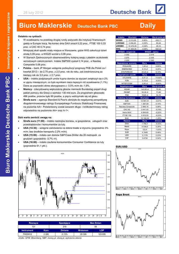 Inwestycje krajowe i zagraniczne Biuro Maklerskie Deutsche Bank PBC 28 luty 2012 Biuro Maklerskie Daily Deutsche Bank PBC Ostatnio na rynkach: W oczekiwaniu na przebieg drugiej rundy pożyczek dla instytucji finansowych giełdy w Europie tracą. Na koniec dnia DAX stracił 0,22 proc., FTSE 100 0,33 proc. a CAC 40 0,74 proc. Mniejszej skali spadki miały miejsce w Warszawie, gdzie WIG zakończył dzień stratą 0,09 proc. a WIG20 wzrósł o 0,06 proc. W Stanach Zjednoczonych obserwowaliśmy kolejną sesję z płaskim aczkolwiek wzrostowym zakończeniem. Indeks S&P500 zyskał 0,14 proc., a Nasdaq Composite 0,08 proc. Polska – bank JP Morgan wstępnie podwyższył prognozę PKB dla Polski za I kwartał 2012 r. do 2,75 proc. z 2,0 proc. rok do roku, zaś średnioroczną za bieżący rok do 3,0 proc. z 2,7 proc. USA – indeks podpisanych umów kupna domów za styczeń zwiększył się o 2% w ujęciu miesięcznym, co było wynikiem nieco lepszym niż oczekiwania (1,1%). Dane za poprzedni okres skorygowano z -3,5% m/m do -1,9%. Niemcy - zdecydowaną większością głosów niemiecki Bundestag poparł drugi pakiet pomocy dla Grecji o wartości 130 mld euro. Za programem głosowało 496 posłów, przeciw było 90 posłów, a pięciu wstrzymało się od głosu. Strefa euro – agencja Standard & Poor's obniżyła do negatywnej perspektywę długoterminowowego ratingu Europejskiego Funduszu Stabilizacji Finansowej na poziomie AA+. Potwierdzony został zarazem długo- i krótkoterminowy rating odpowiednio na poziomnie AA+ oraz A-1+. Dziś warto zwrócić uwagę na: Strefa euro (11:00) – indeks nastrojów biznesu, w gospodarce, usługach oraz przedsiębiorców i konsumentów za luty. USA (14:30) – wstępne zamówienia na dobra trwałe w styczniu (poprzednio 3% m/m; bez środków transportu 2,2% m/m). USA (15:00) – indeks cen domów S&P/Case-Shiller dla 20 metropolii za grudzień (poprzednio -3,7% r/r). USA (16:00) – indeks zaufania konsumentów Consumer Confidence za luty (poprzednio 61,1 pkt.). Wartość Zmiana Obrót (mln zł) WIG20 2 313,28 0,06% 432,11 mWIG40 2 456,40 -0,52% 85,48 sWIG80 10 374,49 -0,30% 29,12 WIG 41 464,05 -0,09% 622,22 Indeks WIG20 - wsparcia WIG20 - opory 2 292 2 319 2 275 2 335 2 250 2 360 Największe wzrosty Kurs Zmiana PCGUARD 1,42 zł 6,80% ENERGOINS 8,18 zł 6,20% STAPORKOW 33,22 zł 6,10% Największe spadki Kurs Zmiana ATLANTIS 0,41 zł -14,60% FON 0,19 zł -9,50% NTTSYSTEM 0,95 zł -8,60% Najaktywniesi Kurs Obrót (mln zł) KGHM 143,00 zł 75,95 PKOBP 34,35 zł 71,88 PGE 19,65 zł 53,19 Indeksy światowe Wartość Zmiana DJIA 12 981,51 -0,01% S&P 500 1 367,59 0,14% Nasdaq Composite 2 966,16 0,08% CAC 40 3 441,45 -0,74% Xetra DAX 6 849,60 -0,22% FT-SE 100 5 915,55 -0,33% BUX 19 168,50 -1,05% Nazwa Kurs Zmiana -0,43% Złoto 1 768,7 Miedź 8 538,0 0,35% Ropa 123,4 -1,63% EUR 4,1845 0,46% USD 3,1176 0,23% CHF 3,4730 0,54% EUR/USD EUR/USD 1.45 1.44 WIG20 1.43 2450 1.42 1.41 1.40 1.39 2400 1.38 1.37 1.36 1.35 2350 1.34 1.33 1.32 1.31 2300 1.30 1.29 1.28 1.27 1.26 2250 1.25 29 5 12 19 26 3 10 17 24 31 7 14 21 28 5 12 19 26 2 9 September October November December 2012 16 23 30 6 13 20 27 5 12 February March 2200 Ropa Brent BRENT OIL 2150 125 120 2100 115 10 October 17 24 31 7 14 November 21 28 5 12 December 19 27 2 9 2012 16 23 30 6 February 13 20 27 5 March Rosnące Spadające Bez Zmian 131 219 58 12 Instrument Kurs Zmiana Wolumen LOP FW20H12 2 326 0,13% 29 326 123 035 źródło: GPW, Bloomberg, NBP, money.pl, stooq.pl, wyliczenia własne 110 105 100 29 5 12 19 26 3 10 17 24 31 7 14 21 28 5 12 19 27 3 9 September October November December 2012 16 23 30 6 13 20 27 5 12 February March "SD" czyli selektywną niewypłacalność Wczoraj niemiecki parlament zgodził się na drugi pakiet ratunkowy dla Grecji. Po burzliwej debacie poprzedzonej krytycznymi wypowiedziami niemieckiego ministra finansów za głosowało 496 posłów, a 90 było przeciw. Jeszcze przed głosowaniem kanclerz Angela Merkel przyznała, że nie ma gwarancji sukcesu programu ratunkowego dla Grecji, ale potencjalne korzyści przewyższają nad ryzykami. Przyznanie Grekom pakietu 130 mld euro wydaje się być już przesądzone, pomimo że podobne do wczorajszej debaty musze się odbyć jeszcze w innych parlamentach, a w tym tygodniu będzie to Estonia, Finlandia i Holandia. Agencja ratingowa Standard & Poor's obniżyła w poniedziałek wieczorem wiarygodność kredytową Grecji z poziomu "CC" na "SD", czyli "selektywną niewypłacalność". Agencja krytycznie ocenia plan rządu w Atenach w sprawie redukcji zadłużenia Grecji wobec prywatnych wierzycieli. Decyzja S&P nie jest zaskoczeniem, gdyż już przed miesiącem ostrzegała, że obniży rating gdy dojdzie do restrukturyzacji długu. Natomiast grecki minister finansów powiedział, że oczekuje podniesienia ratingu, gdy zakończy się proces wymiany obligacji (bond swap), co potwierdza sama agencja. Po zakończeniu wymiany obligacji ocena wiarygodności kredytowej Grecji prawdopodobnie ponownie zostanie podniesiona do poziomu CCC. S&P500 S&P500 1390 1380 1370 1360 1350 1340 1330 1320 1310 1300 1290 1280 1270 1260 1250 1240 1230 1220 1210 1200 1190 1180 1170 1160 1150 1140 1130 1120 1110 1100 1090 1080 1070 1060 29 6 12 19 26 3 10 17 24 31 7 14 21 28 5 12 19 27 3 9 September October November December 2012 17 23 30 6 13 21 27 5 12 February March mWIG 40 mWIG40 2500 2450 2400 ISDA o Grecji, Troika o Portugalii Dziś wieczorem zbierze się specjalny komitet Międzynarodowego Stowarzyszenia Swapów i Derywatów (ISDA) aby zdecydować czy w przypadku Grecji wystąpiło wydarzenie kredytowe. Od decyzji czy Grecja zostanie formalnie uznana za bankruta zależy uruchomione greckich CDS-ów. Możliwe że ISDA nie zdecyduje się na uruchomienie CDS-ów, nawet pomimo uznania Grecji przez agencję S&P za "częściowo niewypłacalną". Ponadto znaczenie może mieć także liczba prywatnych wierzycieli Aten, którzy dobrowolnie zdecydują się wymienić posiadane ob