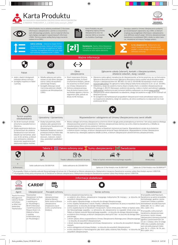 Karta Produktu DO OGÓLNYCH WARUNKÓW UBEZPIECZENIA KREDYTOBIORCÓW O INDEKSIE TIMB/CARCPI_3_1.0/2015 dalej zwanych „OWU” Karta Produktu nie jest integralną częścią Umowy Ubezpieczenia oraz nie stanowi oferty w rozumieniu Kodeksu Cywilnego. Karta Produktu ma za zadanie przedstawić Ci kluczowe informacje o ubezpieczeniu i pomóc w zrozumieniu cech oferowanego produktu. Jest to materiał informacyjny będący wyciągiem najważniejszych informacji z OWU. Terminy pisane wielką literą mają znaczenie nadane im w OWU. Zakres ochrony - Zdarzenia objęte Ochroną ubezpieczeniową. Zależy od wybranego Pakietu określonego szczegółowo w Tabeli 1 poniżej. Szczegółowe definicje ryzyk objętych ochroną znajdziesz w Art. 1 OWU. Decyzję o zawarciu Umowy Ubezpieczenia podejmij po wcześniejszym zapoznaniu się z OWU, w których znajdują się szczegółowe informacje o ubezpieczeniu oraz definicje użytych pojęć. Ochrona ubezpieczeniowa świadczona na podstawie OWU, działa na całym świecie, niezależnie od miejsca Twojego pobytu. Suma ubezpieczenia - Maksymalna wysokość Świadczeń, które Ubezpieczyciel wypłaci z tytułu danego zdarzenia (objętego Zakresem ochrony). Świadczenie - Kwota, którą Ubezpieczyciel wypłaca Uposażonemu lub Uprawnionemu w razie zajścia zdarzenia. Ważne informacje Pakiet Składka • J eden z dwóch dostępnych rodzajów zakresu ochrony. • Szczegóły znajdziesz w Tabeli 1 poniżej. Termin wypłaty odszkodowania • D o 30 dni liczonych od daty otrzymania zawiadomienia o Zdarzeniu. • Gdyby wyjaśnienie okoliczności koniecznych do ustalenia Świadczenia w tym terminie okazało się niemożliwe, wówczas 14 dni od dnia, w którym przy zachowaniu należytej staranności wyjaśnienie tych okoliczności będzie możliwe. • S kładka opłacana jest jednorazowo za cały Okres ubezpieczenia i zależy od wysokości udzielonego Kredytu. • Szczegóły dotyczące zasad i terminów płatności składki znajdziesz we Wnioskopolisie i OWU. Uposażony i Uprawniony A B (Premium) Zgłoszenie szkody (zdarzeń), kontakt z Ubezpieczycielem, składanie odwołań, skarg i zażaleń • D zień rozpoczęcia Ochrony ubezpieczeniowej, to Dzień uruchomienia Kredytu, jednak nie wcześniej niż Dzień zawarcia Umowy Ubezpieczenia • Ochrona ubezpieczeniowa trwa do końca trwania Umowy Kredytu zgodnie z Harmonogramem spłat, jednak nie dłużej niż 96 miesięcy. • Z darzenie należy zgłosić niezwłocznie do Ubezpieczyciela, w formie pisemnej, np. na Formularzu Zgłoszenia Roszczenia (Formularz Zgłoszenia Roszczenia można uzyskać lub po kontakcie telefonicznym z Ubezpieczycielem tel. 801 801 111 lub 22 319 00 00) lub wysyłając e-mail na adres [email protected]. Do zgłoszenia należy dołączyć dokumenty wskazane w art. 12 ust. 10 OWU. • Odwołania, skargi lub zażalenia można złożyć w każdej chwili, w siedzibie Ubezpieczyciela (pl. Piłsudskiego 2, 00-073 Warszawa), osobiście lub pocztą, a także e-mailem pod adresem [email protected] i telefonicznie pod numerem telefonu wskazanym na stronie www.cardif.pl. • Ubezpieczyciel udzieli odpowiedzi na odwołanie, skargę lub zażalenie w ciągu 30 dni liczonych od doręczenia pisma. • W szczególnie skomplikowanych przypadkach Ubezpieczyciel może potrzebować więcej czasu na rozpatrzenie odwołania, skargi lub zażalenia, ale okres oczekiwania na odpowiedź nie może przekroczyć 60 dni. Wypowiedzenie i odstąpienie od Umowy Ubezpieczenia oraz zwrot składki • O soby lub podmioty, które • Możesz odstąpić od Umowy Ubezpieczenia w terminie 30 dni lub gdy jesteś przedsiębiorcą w terminie 7 dni od jej zawarcia składając wskażesz jako upoważnione Ubezpieczycielowi pisemne oświadczenie. Ochrona ubezpieczeniowa skończy się w dniu złożenia oświadczenia, a Składka za do otrzymania Świadczenia od niewykorzystany Okres ochrony zostanie Ci zwrócona. Ubezpieczyciela. • Wypowiedzieć Umowę Ubezpieczenia możesz w dowolnym momencie jej trwania. Wypowiedzenie uznaje się za skuteczne • Nadwyżka Świadczeń zostanie z ostatnim dniem miesiąca, w którym Ubezpieczyciel otrzymał Twoje oświadczenie. Wypowiedzenie Umowy Ubezpieczenia przekazana kolejno Tobie albo nie zwalnia Cię z obowiązku opłacenia składki za okres, w którym Ubezpieczyciel udzielał Ochrony ubezpieczeniowej. Twoim bliskim: małżonkowi, dzieciom, rodzicom, rodzeństwu, pozostałym spadkobiercom. Tabela 1. Pakiet Okres ubezpieczenia Zakres ochrony oraz Sumy ubezpieczenia i Zgon Trwała i całkowita niezdolność do pracy Saldo zadłużenia do 250.000 PLN Saldo zadłużenia do 250.000 PLN Świadczenia Pobyt w Szpitalu wskutek Nieszczęśliwego wypadku Utrata pracy Spłata do 12 Rat Kredytu max 36.000 PLN* Spłata do 12 Rat Kredytu max 36.000PLN** * W przypadku Pobytu w Szpitalu wskutek Nieszczęśliwego otrzymasz do 12 Świadczeń w Okresie ubezpieczenia. Maksymalne miesięczne Świadczenie w postaci spłaty Raty Kredytu wynosi 3.000 PLN. ** W przypadku Utraty pracy otrzymasz do 12 Świadczeń w Okresie ubezpieczenia. Maksymalne miesięczne Świadczenie w postaci spłaty Raty Kredytu wynosi 3.000 PLN. Informacje dodatkowe Agent Toyota Insurance Management lub/oraz Dealer wchodzący w skład sieci dealerskiej Toyota/Lexus Ubezpieczyciel Towarzystwo Ubezpieczeń na Życie Cardif Polska S.A. z siedzibą przy pl. Piłsudskiego 2, 00-073 Warszawa i Cardif Assurances Risques Divers S.A. Oddział w Polsce z siedzibą w Warszawie przy pl. Piłsudskiego 2 Karta_produktu_Toyota_CPI IKONY.indd 1 Początek ochrony Ochrona ubezpieczeniowa dotyczy Zdarzeń, które zaszły w Okresie ubezpieczenia (rozpoczyna się on w dniu uruchomienia Kredytu). Koniec ochrony Opodatkowanie Ochrona ubezpieczeniowa kończy się: ̶̶ w ostatnim dniu Okresu ubezpieczenia trwającego maksymalnie 96 miesięcy – w stosunku do wszystkich Ubezpieczonych; ̶̶ w dniu zgonu Ubezpieczonego - w stosunku do danego Ubezpieczonego; ̶̶ w dniu wypłaty Ś