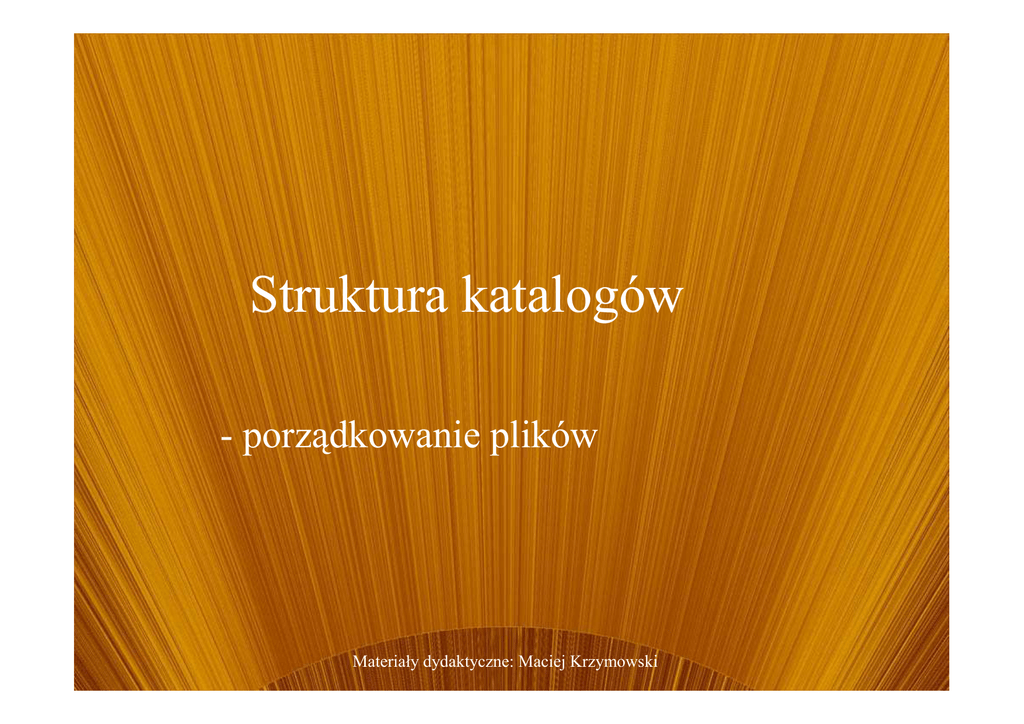 Struktura katalogów - porządkowanie plików Materiały dydaktyczne: Maciej Krzymowski Katalog = folder = teczka • W celu uporządkowania dysku pliki zbiera się w katalogach, • Ułatwia to odszukiwanie programów i plików, • W układzie katalogów zastosowano hierarchiczną strukturę drzewiastą. Materiały dydaktyczne: Maciej Krzymowski Struktura drzewiasta • Struktura katalogów na twardym dysku, • Uporządkowana wg reguły: „pień” – „konary, – „pień” – katalog główny dysku twardego (C:\), – „konary” – katalogi widoczne bezpośrednio pod katalogiem głównym (Moje dokumenty), – „gałęzie” – wszystkie katalogi znajdujące się wewnątrz katalogów „konarów” (Windows\System), Materiały dydaktyczne: Maciej Krzymowski Organizacja plików i katalogów • Kopiowanie, kasowanie plików, • Przeglądanie zawartości dysku, • Programy: – Eksplorator Windows, – Mój komputer. Materiały dydaktyczne: Maciej Krzymowski Eksplorator Materiały dydaktyczne: Maciej Krzymowski Prawy przycisk myszy - Eksploruj Materiały dydaktyczne: Maciej Krzymowski Mój komputer Materiały dydaktyczne: Maciej Krzymowski Rozszerzenie nazwy • Trzyliterowy skrót występujący po kropce na końcu nazwy pliku, • Jednoznacznie określa typ pliku, • Pozwala systemowi operacyjnemu rozpoznać jaka operację wykonuje dany plik, – – – – – .exe – wykonywalne pliki programów, .sys, .drv – pliki sterowników, .doc – plik dokumentu Microsoft Word, .xls – plik dokumentu Microsoft Excel, .ppt – plik dokumentu Microsoft PowerPoint. Materiały dydaktyczne: Maciej Krzymowski Zadania: • Co to jest plik i jakiego typu pliki juŜ tworzyłeś? • Narysuj schematycznie proces instalowania i uruchamiania programu komputerowego? • Narysuj schematycznie drzewiastą strukturę katalogów, ukazując równieŜ jej hierarchię (porównaj ją np.- do biblioteki, regałów i ksiąŜek). Materiały dydaktyczne: Maciej Krzymowski zeszyt Podaj wyjaśnienie pojęć: • • • • • • Nazwa katalogu, Zawieszenie systemu, Kopia zapasowa, Schowek, Skopiowanie pliku, Przeniesienie pliku. Materiały dydaktyczne: Maciej Krzymowski