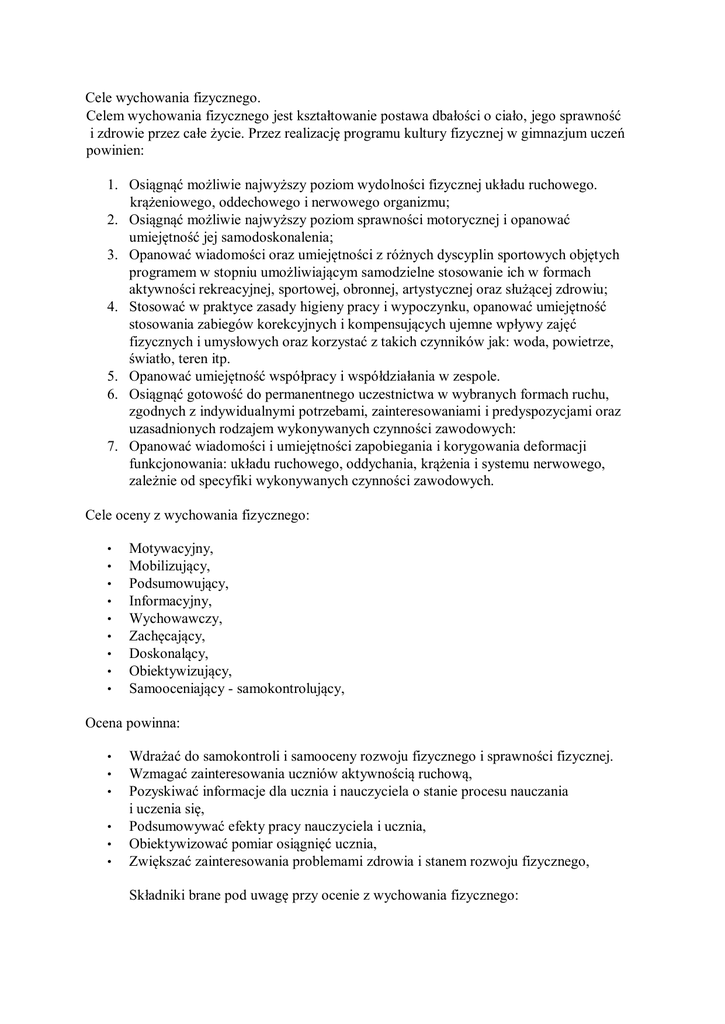 Cele wychowania fizycznego. Celem wychowania fizycznego jest kształtowanie postawa dbałości o ciało, jego sprawność i zdrowie przez całe życie. Przez realizację programu kultury fizycznej w gimnazjum uczeń powinien: 1. Osiągnąć możliwie najwyższy poziom wydolności fizycznej układu ruchowego. krążeniowego, oddechowego i nerwowego organizmu; 2. Osiągnąć możliwie najwyższy poziom sprawności motorycznej i opanować umiejętność jej samodoskonalenia; 3. Opanować wiadomości oraz umiejętności z różnych dyscyplin sportowych objętych programem w stopniu umożliwiającym samodzielne stosowanie ich w formach aktywności rekreacyjnej, sportowej, obronnej, artystycznej oraz służącej zdrowiu; 4. Stosować w praktyce zasady higieny pracy i wypoczynku, opanować umiejętność stosowania zabiegów korekcyjnych i kompensujących ujemne wpływy zajęć fizycznych i umysłowych oraz korzystać z takich czynników jak: woda, powietrze, światło, teren itp. 5. Opanować umiejętność współpracy i współdziałania w zespole. 6. Osiągnąć gotowość do permanentnego uczestnictwa w wybranych formach ruchu, zgodnych z indywidualnymi potrzebami, zainteresowaniami i predyspozycjami oraz uzasadnionych rodzajem wykonywanych czynności zawodowych: 7. Opanować wiadomości i umiejętności zapobiegania i korygowania deformacji funkcjonowania: układu ruchowego, oddychania, krążenia i systemu nerwowego, zależnie od specyfiki wykonywanych czynności zawodowych. Cele oceny z wychowania fizycznego: • • • • • • • • • Motywacyjny, Mobilizujący, Podsumowujący, Informacyjny, Wychowawczy, Zachęcający, Doskonalący, Obiektywizujący, Samooceniający - samokontrolujący, Ocena powinna: • • • • • • Wdrażać do samokontroli i samooceny rozwoju fizycznego i sprawności fizycznej. Wzmagać zainteresowania uczniów aktywnością ruchową, Pozyskiwać informacje dla ucznia i nauczyciela o stanie procesu nauczania i uczenia się, Podsumowywać efekty pracy nauczyciela i ucznia, Obiektywizować pomiar osiągnięć ucznia, Zwiększać zainteresowania problemami zdrowia i stanem rozwoju fizycznego, Składniki brane pod uwagę przy ocenie z wychowania fizycznego: 1. Postawa wobec KF - uczestnictwo w różnych formach KF organizowanych przez szkołę i środo samorządowe, reprezentowanie szkoły, postawy prohigieniczne itp. oraz dyscyplina, aktywność na zajęciach, frekwencja, itp. Uwaga! To jest ważne kryterium oceniania. 2. Sprawność kondycyjna — wystawiane są dwie oceny: pierwsza za wynik, która wskazuje uczniowie poziom jego sprawności na tle kolegów, oraz druga za postęp. Ocena za postęp jest wagowo równa ocenie za postawę wobec KF. 3. Umiejętności - oceniamy poziom z uwzględnieniem indywidualnych uzdolnień i możliwości. 4. Wiadomości - obejmują treści zawarte w programie nauczania i przewidziane do realizacji przez nauczyciela prowadzącego grupę w planie wynikowym (rozkładzie materiału). 5. Opanowanie treści programowych z określonego poziomu nauczania wskazują przeprowadzane sprawdziany. Ocenę celującą otrzymuje uczeń, który spełnił wymagania na ocenę bardzo dobrą, a ponadto reprezentując szkołę na zawodach szczebla powiatowego organizowanych w ramach współzawodnictwa SZS „Gimnazjada” zajął miejsca 1-3 indywidualnie lub drużynowo, miejsca 1-6 na zawodach szczebla wojewódzkiego albo sukcesy uznane przez nauczyciela wystawiającego uczniowi ocenę klasyfikacyjną. Ocenę bardzo dobrą otrzymuje uczeń, który: • • • • • • • • prezentuje pozytywną postawę wobec swojego zdrowia i zdrowia innych; uczestniczy w pozalekcyjnych lub pozaszkolnych formach aktywności rekreacyjnozdrowotnej lub sportowej oraz reprezentuje klasę w rozgrywkach lub zawodach szkolnych lub międzyklasowych; ma usprawiedliwione nieobecności na wszystkich obligatoryjnych zajęciach ruchowych organizowanych przez szkołę (dopuszcza się 25% absencję na zajęciach pod warunkiem usprawiedliwienia nieobecnych godzin); z dużym zaangażowaniem uczestniczy w lekcjach wychowania fizycznego, jest twórczy i odznacza się umiejętnościami organizatora aktywności ruchowej dla siebie I rówieśników występuje z własną inicjatywą oraz potrafi zorganizować sobie czas przeznaczony na uczestnictwo w aktywności ruchowej; nie ma nieusprawiedliwionych nieobecności na obligatoryjnych zajęciach ruchowych organizowanych przez szkołę, a najwyżej dwa razy w czasie semestru był nieprzygotowany do zajęć; opanował umiejętności ruchowe realizowane w ramach zajęć obligatoryjnych lub w przypadku obniżonej sprawności fizycznej chętnie podejmuje optymalne dla swoich możliwości wysiłki zmierzające do samousprawniania się w ramach zajęć szkolnych lub indywidualnych i poprawił wyniki większości sprawdzianów: posiadł wiedzę dotyczącą kultury fizycznej i zdrowego stylu życia oraz potrafi korzystać z niej na lekcji wychowania fizycznego i w życiu codziennym. stosuje zasadę fair play w czasie lekcji i poza nią. Ocenę dobrą otrzymuje uczeń, który: • • • • • • • • • • deklaruje pozytywną postawę wobec swojego zdrowia i zdrowia innych, jednak nie zawsze ma ona charakter czynny. sporadycznie uczestniczy w pozalekcyjnych lub pozaszkolnych formach aktywności rekreacyjno zdrowotnej lub sportowej lub zawodach szkolnych lub międzyklasowych; ma niewiele nieusprawiedliwionych nieobecności na obligatoryjnych zajęciach ruchowych organizowanych przez szkołę, uczestniczy w nich (bez względu na posiadane umiejętności ruchowe, posiadaną wiedzę oraz poziom sprawności fizycznej) lub będąc na zajęciach tylko sporadycznie jest nieprzygotowany (nie posiada wymaganego stroju sportowego, na który składają się: krótkie spodenki sportowe (na gumce), koszulka sportowa lub ubranie treningowe (dres), obuwie sportowe odpowiednie do formy i miejsca aktywności sportowej a do zajęć na sali o