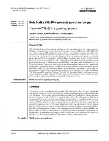 Postepy Hig Med Dosw (online), 2016; 70: 1286-1299 e-ISSN 1732-2693 Received: 2015.08.25 Accepted: 2016.11.02 Published: 2016.12.27 www.phmd.pl Review Rola białka YKL-40 w procesie nowotworowym The role of YKL-40 in a cancerous process Agnieszka Rusak1, Karolina Jabłońska1, Piotr Dzięgiel1,2 1 Katedra i Zakład Histologii i Embriologii, Uniwersytet Medyczny im. Piastów Śląskich we Wrocławiu Katedra Fizjoterapii, Akademia Wychowania Fizycznego we Wrocławiu 2 Streszczenie YKL-40 jest białkiem sekrecyjnym, wydzielanym m.in. przez komórki nowotworowe oraz makrofagi towarzyszące guzom. Ze względu na homologię strukturalną białko to zaklasyfikowano do rodziny chitynaz CLP (chitinase-like protein) oraz 18 rodziny hydrolaz glikozylowych, choć nie ma funkcji katalitycznej. Podwyższone stężenie YKL-40 w surowicy krwi stwierdza się w stanach zapalnych o zróżnicowanej etiologii oraz w chorobach nowotworowych, takich jak rak gruczołu piersiowego jajnika, jelita grubego, czy też rak płuc. Wyniki licznych badań wskazują na znaczący związek YKL-40 z progresją choroby nowotworowej: występowaniem przerzutów, krótszym czasem wolnym od wznowy oraz krótszym czasem przeżycia. Uważa się, że YKL-40 może być czynnikiem prognostycznym rozwoju choroby nowotworowej i odpowiedzi pacjenta na zastosowaną terapię. Podwyższone stężenie białka w surowicy krwi pacjentów onkologicznych może mieć znaczenie w procesach angiogenezy, proliferacji i migracji komórek nowotworowych. Najprawdopodobniej mechanizm tego zjawiska jest wynikiem działania YKL-40 przez szlaki sygnałowe FAK oraz PI3K/AKT. Uzyskane dotychczas wyniki są w znacznej mierze oparte na analizie stężenia YKL-40 w surowicy krwi pacjentów oraz na ocenie zmian poziomu ekspresji genu tego białka w badaniach in vitro oraz in vivo. Słowa kluczowe: YKL-40 • nowotwory • czynnik prognostyczny Summary - YKL-40 is a secretory protein secreted among others by tumor cells and tumor-associated macrophages. Due to the structural homology this protein was classified to chitinases family CLP (chitinase – like protein) and to 18 of glycosyl hydrolase family, but it has no catalytic function. Elevated levels of YKL-40 in serum is observed in the inflammatory diseases of various aetiology and in cancers, such as breast, ovarian, colon or lung. The results of many studies suggest a significant relationship of YKL-40 with progression of cancer: incidence of metastases, shorter relapse-free survival and shorter overall survival. It is believed that YKL-40 may be a prognostic factor of cancer development and the patient’s response to the applied therapy. Elevated levels of protein in serum of cancer patients may play a role in angiogenesis, proliferation and migration of tumor cells. Probably the mechanism of this phenomenon is the result of YKL-40 action by FAK and PI3K/AKT signaling pathways. Results obtained so far are largely based on an analysis of the YKL-40 level in the patients’ serum and on the assessment of changes in the expression level of this protein in studies in vitro and in vivo. YKL-40 • cancers • prognostic factor - - - - Key words: 1286 Postepy Hig Med Dosw (online), 2016; 70 Rusak A. i wsp. – Rola białka YKL-40 w procesie nowotworowym Full-text PDF: 4310 – 3 109 Adres autorki: mgr inż. Agnieszka Rusak, Katedra i Zakład Histologii i Embriologii, Uniwersytet Medyczny im. Piastów Śląskich, ul. Chałubińskiego 6a, 50-368 Wrocław; e-mail: [email protected] Wykaz skrótów: AKT – kinaza białkowa B (protein kinase B); AMC – kwaśna chitynaza ssacza (acidic mammalian chitinase); BMI – wskaźnik masy ciała (body mass index); CA125 – białko antygenowe będące markerem nowotworowym (cancer antigen 125); cDNA – komplementarny DNA (complementary DNA); CEA – białko rakowo-płodowe (carcinoembrionic antigen); CLP – białko chitynazopodobne (chitinase-like protein); CRI – stan zapalny związany z chorobą nowotworową (cancer related inflammation); CRP – białko C-reaktywne (C-reactive protein); DLD-1 – linia komórek raka jelita grubego (colon cancer cell line); DU-145 – linia komórek raka stercza (prostate cancer cell line); ERK1/2 – zewnątrzkomórkowe kinazy regulowanej sygnałem (extracellular-signal-regulated kinases); FAK – kinaza ognisk adhezyjnych (focal adhesion kinase); FDA – Agencja Żywności i Leków (Food and Drug Administration); FGF – czynnik wzrostu fibroblastów (fibroblast growth factor); Gli-1 – homolog 1 onkogenu związanego z glejakiem (glioma-associated oncogene homolog 1); GM-CSF – czynnik stymulujący tworzenie kolonii granulocytów i makrofagów (granulocyte-macrophage colony stimulating factor); HER2 – receptor ludzkiego naskórkowego czynnika wzrostu (human epidermal growth factor receptor 2); HIF1/2 – czynniki indukowane hipoksją (hypoxia-inducible factors-1/2); HMVEC – ludzka linia komórek śródbłonka mikronaczyń (human microvascular endothelial cells); HUVEC – ludzka pierwotna linia komórek śródbłonka otrzymana z pępowiny (human umbilical vein endothelial cells); IBD – zapalna choroba jelit (inflammatory bowel disease); IGF-1 – insulinopodobny czynnik wzrostu (insulin-like growth factor 1); IL-13 – interleukina 13 (interleukin 13); IL-6 – interleukina 6 (interleukin 6); IL-8 – interleukina 8 (interleukin 8); LDH – dehydrogenaza mleczanowa (lactate dehydrogenase); LOX – ludzka linia komórek czerniaka (human melanoma cell line); MAPK – kinaza białkowa aktywowana mitogenem (mitogen activated protein kinase); MDA-MB-231 – linia komórek raka gruczołu piersiowego (breast cancer cell line); MG63 – linia ludzkich komórek kostniakomięsaka (human osteosarcoma cell line); MCP-1 – białko 1 chemotaktyczne dla monocytów (monocyte chemotactic protein 1); M-CSF – czynnik stymulujący tworzenie kolonii makrofagów (macrophage colony stimulating factor); MMP9 – metaloproteinaza macierzy (matrix