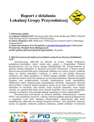 Raport z działania Lokalnej Grupy Przyrodniczej 1. Informacje ogólne: a) realizator działań LGP: Stowarzyszenie Aktywności Społecznej TREK i Wydział Nauk Biologicznych Uniwersytetu Wrocławskiego. b) obszar działania LGP: Wałbrzych, LGP Książ przy Zespole Szkół z Oddziałami integracyjnymi c) osoba prowadząca: Ewa Przepiórka, [email protected], Uniwersytet Wrocławski, Wydział Nauk Biologicznych d) ilość godzin odbytych spotkań/zajęć/szkoleń: 30 godzin 2. Opis inwentaryzacji miejsc przyrodniczo cennych na obszarze działalności LGP Inwentaryzacja odbywała się głównie na terenie osiedla Podzamcze, południowo-wschodniej części miasta przy granicy z Książańskim Parkiem Krajobrazowym oraz na terenie samego Książańskiego PK. Przeprowadzono ją głównie metodą transektów tj. pieszych wycieczek wieczornych w okresie jesieni, których trasa przechodziła przez różnorodne siedliska m.in. tereny otwarte, śródleśne drogi czy okolice zbiorników wodnych, co miało na celu zbadać aktywność nietoperzy oraz skład gatunkowy w obrębie danego siedliska. Ponadto uczestnicy poszukiwali letnich kryjówek nietoperzy na strychach budynków, dokonali przeglądu literatury oraz przeprowadzali wywiady środowiskowe wśród mieszkańców Wałbrzycha celem zlokalizowania potencjalnych schronień. Najczęściej obecność (lub jej brak) i wielkość kolonii nietoperzy ocenia się po ilości, kształcie i składzie odchodów na strychach. Stan kolonii, mimo licznych odchodów, może ulegać zmianie, tzn. zgrupowanie letnie może zmienić kryjówkę. Jest to często występująca strategia u nietoperzy, która pomaga uniknąć zagrożenia ze strony drapieżników. Inwentaryzację prowadzono za pomocą detektora ultrasonicznego Lunabat DFD-1 oraz rejestratora Zoom H1. Zebrany materiał poddano analizie komputerowej w programie Cool Edit. Detekcja ultradźwięków emitowanych jako pulsy echolokacyjne odbywała się metodą frequency-division. Tym sposobem oznaczyć można do gatunku większość polskich nietoperzy, jednak dokładne rozróżnienie gatunków z rodzaju nocek Myotis sp. jest niemożliwe, dlatego podczas inwentaryzacji nietoperze z tej grupy oznacza się do rodzaju. Osiedle Podzamcze charakteryzuje się stosunkowo nową zabudową złożoną głównie z wysokich bloków mieszkalnych. Pomiędzy „szpalerami” budynków rozpościera się otwarta przestrzeń, w której żerować mogą nietoperze takie jak borowiec wielki Nyctalus noctula oraz mroczek późny Eptesicus serotinus. Dodatkowo obecność latarni ulicznych zwabiając owady stwarza mikrosiedlisko, w którym często żerują nietoperze, szczególnie mroczki późne. Przy granicy lasu w kierunku północno-wschodnim od osiedla Podzamcze znajdują się starsze zabudowania, na strychach których mogą znajdować się potencjalne kolonie rozrodcze i schronienia dzienne. Tu wyróżnić można strych kościoła p.w. Św. Anny oraz strych dawnej szkoły ewangelickiej. Większą część zinwentaryzowanego terenu stanowi centralna część Książańskiego Parku Krajobrazowego, w którego obszarze mieści się rezerwat przyrody Przełomy pod Książem koło Wałbrzycha oraz obszar specjalnej ochrony siedlisk Natura 2000 Przełomy Pełcznicy pod Książem. Na obszarze Natura 2000 przedmiotem ochrony są trzy gatunki nietoperzy: nocek duży Myotis myotis, nocek Bechsteina Myotis bechsteinii oraz mopek Barbastella barbastellus. Na badanym terenie stwierdzono szereg zrujnowanych obiektów z podpiwniczeniami, pozostałych po zabudowach zamku Stary Książ. Liczne kamienne wykroty stanowić mogą potencjalne zimowiska dla nietoperzy. Wiele starych podpiwniczeń np. nieistniejącego już gościńca Meierhof lub starej pompowni mają częściowo przysypane rumoszem wejścia, co stanowi barierę do sforsowania dla człowieka, dzięki czemu nietoperze mogłyby przeprowadzić hibernacje bez większych zagrożeń. Dawne mosty kamienne na trasie spacerowej od strony Świebodzic z uwagi na liczne szczeliny mogą służyć za schronienia dzienne oraz za hibernakulum dla gatunków zimnolubnych np. mopkek Barbastella barbastellus. Ruiny Zamku Cisy na północnym zachodzie Książańskiego PK również mogą stanowić potencjalne hibernakulum, jednak stan zachowania pozostawia wiele do życzenia bezpieczeństwu kryjówki. Prócz zrujnowanych zabudowań w KPK znajduje się nowy Zamek Książ, w którego sztolniach i kanałach ciepłowniczych odnotowano pojedyncze zimujące osobniki nocka dużego Mymotis myotis, nocka Bechsteina Myotis bechsteinii oraz mopka. Na strychach zabudowań zamkowych mogą znajdować się potencjalne kolonie rozrodcze nietoperzy kilku gatunków m.in. gacka brunatnego Plecotus auritus czy szarego P. austriacus. W okolicach latarni na dziedzińcu zamku stwierdzono żerowiska mroczka późnego oraz borowca. Na terenie Książańskiego Parku Krajobrazowego występuje duże zróżnicowanie siedliskowe, które jest przedmiotem ochrony powyższego obszaru programem Natura 2000. Występują tu bardzo rzadkie zbiorowisko lasów klonowolipowych (Tilio plathyphyllis-Acerion pseudoplatani), które są siedliskiem priorytetowym i głównym przedmiotem ochrony tego obszaru. Należy wymienić tutaj również ciepłolubne dąbrowy (Quercetalia pubescenti-petraeae) oraz kwaśne dąbrowy (Quercetea robori-petraeae), które ze względu na ubogie runo stanowią dogodne miejsce żerowania dla nocka dużego, który poluje na naziemne chrząszcze z rodziny biegaczowatych. Siedlisko kwaśnych buczyn (Luzulo-Fagenion) jest obfitym żerowiskiem dla mniejszych nietoperzy z rodzaju nocek oraz nietoperzy z rodzaju karlik Pipisterllus. Płynące przez obszar KPK rzeki Pełcznica i Szczawnica stanowią korytarz ekologiczny dla przemieszczania się nietoperzy oraz wodopój i miejsce żerowiska. Zbiorniki wodne takie jak staw „poleśnicki” I i II oraz zbiornik Solna na skraju lasu od strony Świebodzic są miejscem żerowania głów