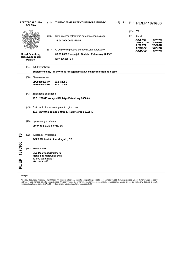 RZECZPOSPOLITA POLSKA (12) (96) TŁUMACZENIE PATENTU EUROPEJSKIEGO (19) Data i numer zgłoszenia patentu europejskiego: 28.04.2006 06753454.5 (97) Urząd Patentowy Rzeczypospolitej Polskiej O udzieleniu patentu europejskiego ogłoszono: PL (11) PL/EP 1876906 (13) T3 (51) Int. Cl. A23L1/30 A61K31/202 A23L1/22 A23D9/00 A23D9/02 (2006.01) (2006.01) (2006.01) (2006.01) (2006.01) 09.09.2009 Europejski Biuletyn Patentowy 2009/37 EP 1876906 B1 (54) Tytuł wynalazku: Suplement diety lub żywność funkcjonalna zawierające mieszaninę olejów (30) Pierwszeństwo: EP20050009471 EP20060000920 29.04.2005 17.01.2006 (43) Zgłoszenie ogłoszono: 16.01.2008 Europejski Biuletyn Patentowy 2008/03 (45) O złożeniu tłumaczenia patentu ogłoszono: 30.07.2010 Wiadomości Urzędu Patentowego 07/2010 (73) Uprawniony z patentu: T3 Vinorica S.L., Mallorca, ES (72) Twórca (y) wynalazku: PL/EP 1876906 POPP Michael A., Lauf/Pegnitz, DE (74) Pełnomocnik: Ewa Malewska&Partners rzecz. pat. Malewska Ewa 00-950 Warszawa 1 skr. pocz. 613 Uwaga: W ciągu dziewięciu miesięcy od publikacji informacji o udzieleniu patentu europejskiego, każda osoba może wnieść do Europejskiego Urzędu Patentowego sprzeciw dotyczący udzielonego patentu europejskiego. Sprzeciw wnosi się w formie uzasadnionego na piśmie oświadczenia. Uważa się go za wniesiony dopiero z chwilą wniesienia opłaty za sprzeciw (Art. 99 (1) Konwencji o udzielaniu patentów europejskich). EP 1 876 906 B1 Opis [0001] Niniejszy wynalazek dotyczy suplementu diety lub żywności funkcjonalnej składającej się z lub zawierającej (a) olej z orzechów w ilości 0,5 do 20% objętościowych; (b) jedno lub więcej źródeł zawierających kwasy tłuszczowe ω-3 w ilości 10 do 50 lub 10 do 90% objętościowych, przy czym całkowita ilość kwasów tłuszczowych ω-3 w każdym ze źródeł zawierających kwasy tłuszczowe ω-3 wynosi co najmniej 20% objętościowych; oraz (c) nośnik aromatu w ilości 10 do 89,5% objętościowych. Ponadto niniejszy wynalazek dotyczy oleju jadalnego zawierającego lub stanowiącego suplement diety lub żywność funkcjonalną według wynalazku. Niniejszy wynalazek dotyczy wreszcie zastosowania suplementu diety lub żywności funkcjonalnej według wynalazku jako oleju jadalnego. [0002] Choroby sercowo-naczyniowe stanowią według statystyk główną przyczynę zgonów w Niemczech i Europie. Ten wspólny termin obejmuje wiele chorób, takich jak zawał serca, nagła śmierć sercowa i dusznica bolesna. W tym kontekście określa się je często jako tak zwaną chorobę wieńcową serca, w skrócie CHD. Wspólną przyczyną tych występujących powszechnie chorób jest często miażdżyca tętnic, która rozwija się bez rozpoznania przez wiele lat. Naczynia krwionośne stopniowo zwężają się, wskutek czego swobodny przepływ krwi zostaje zablokowany. W związku z tym krążenie krwi w mięśniu sercowym nie jest prawidłowe. W najgorszym wypadku następuje nagła niedrożność naczynia, określana mianem zakrzepicy, która prowadzi do całkowitego zatrzymania dopływu krwi i tlenu do serca. Skutkiem tego jest zawał serca. [0003] W wielu badaniach naukowych wykazano, że nieprawidłowe nawyki żywieniowe są jedną z głównych przyczyn występowania tych czynników ryzyka. Oznacza to, że dzięki odpowiedniej zmianie diety wystąpienie miażdżycy tętnic można opóźnić lub nawet mu zapobiec. Jeśli chodzi o dietę, oprócz witamin, ilość i rodzaj wchłanianych tłuszczów jest czynnikiem mającym zasadnicze znaczenie w rozwoju i postępie chorób sercowonaczyniowych. Odpowiednia równowaga między nasyconymi kwasami tłuszczowymi pochodzenia zwierzęcego i nienasyconymi kwasami tłuszczowymi pochodzenia roślinnego lub z ryb staje się coraz ważniejsza. Tak zwane kwasy tłuszczowe ω-3 i kwasy tłuszczowe ω6 mają szczególne znaczenie. Kwasy tłuszczowe ω-6 występują w wielu olejach roślinnych, dlatego przy obecnych nawykach żywieniowych ich spożycie jest wystarczające. Kwas linolowy – najważniejszy przedstawiciel tej rodziny – występuje w znacznej ilości na przykład w oleju szafranowym, słonecznikowym, sojowym, kukurydzianym i pszennym, ale 2 EP 1 876 906 B1 także w margarynie. Wielonienasycone kwasy tłuszczowe typu ω-3, przynajmniej w dużym stężeniu, występują jednak wyłącznie u niektórych tłustych ryb i glonów. [0004] Kwasy tłuszczowe ω-3 i ω-6 to wielonienasycone, długołańcuchowe kwasy tłuszczowe. Oznacza to, że zawierają co najmniej 18 atomów węgla (C) i więcej niż jedno wiązanie podwójne. ω i n oznaczają odpowiednio łańcuch kwasu tłuszczowego, którego numeracja rozpoczyna się od grupy metylowej. Liczby 3 i 6 oznaczają odpowiednio położenie pierwszego wiązania podwójnego odpowiednio przy trzecim i szóstym atomie węgla. Ponieważ organizm człowieka nie potrafi wytwarzać żadnego z tych kwasów tłuszczowych z innych kwasów tłuszczowych, kwasy tłuszczowe ω-3 i ω-6 uznaje się za niezbędne. Z tych dwóch kwasów tłuszczowych organizm może wytworzyć w ograniczonej ilości związki o dłuższym łańcuchu potrzebne w wielu funkcjach metabolicznych, za pomocą enzymów desaturazy i elongazy. [0005] Wiele właściwości kwasów tłuszczowych ω-3 ma znaczenie profilaktyczne w przypadku zawałów serca: badania na osobach zdrowych i chorych wykazały, że spożywanie dużej ilości kwasów tłuszczowych ω-3 może zmniejszyć stężenie triglicerydów i cholesterolu we krwi. Wyraźny spadek stężenia tłuszczów we krwi wystąpił jednak jedynie przy spożywaniu stosunkowo dużej ilości – 3 do 4 gramów na dobę. Kwasy tłuszczowe ω-3 obniżają ponadto w szczególności stężenie niekorzystnego cholesterolu LDL. Co więcej – badacze stwierdzili, że krew Inuitów krzepnie wolniej niż krew Europejczyków. Jest to korzystne w przypadku osób narażonych na ryzyko zawału serca, ponieważ skrzepy krwi powodują często niedrożność zwężo