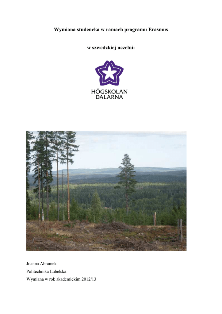 Wymiana studencka w ramach programu Erasmus w szwedzkiej uczelni: Joanna Abramek Politechnika Lubelska Wymiana w rok akademickim 2012/13 Szwecja jest krajem bardzo pięknym. Większość terenów zajmują lasy, występuje tam również bardzo dużo jezior. Ludzie w Szwecji są bardzo mili, pomocni i ufni, można praktycznie z każdym, niezależnie od wieku, porozumieć się w języku angielskim. Praktycznie wszystkie instytucje posiadają oferty w języku angielskim. Uczelnia natomiast mieści się w dwóch położonych blisko siebie miejscowościach Falun oraz Borlänge w rejonie Dalarna. Wybór miejscowości do zamieszkania zależy od tego na jakie przedmioty ma się zamiar uczęszczać. Można wybrać przedmioty z obu miejscowości i dojeżdżać do jednej z nich, jednak jest to rozwiązanie dość kosztowne, ponieważ koszty przejazdów w Szwecji są dużo wyższe (dla porównania bilet przejazdowy po mieście kosztuje 20 SEK, z miejscowości do miejscowości 40 SEK, gdzie 1 SEK to około 0,50zł.). Högskolan Dalarna przed wyjazdem przesyła wszelkie niezbędne informacje dotyczące nauki i zakwaterowania. Szczególnie pomocna jest Pani Egle Berstiene, która chętnie udziela informacji i odpowiedzialnie sprawuje opiekę nad studentami. Można bez obaw kierować do niej wszelkie zapytania dotyczące uczelni oraz zagadnień powiązanych. Dojazd Droga na miejsce jest dość długa. Najlepszym rozwiązaniem jest przelot z Warszawy na Skavsta (Nyköping) liniami Ryanair lub Wizzair, dalej autobusem linii Flygbussarna do Sztokholmu i pociągiem (sj.se) na miejsce. Można także skorzystać z opcji samolot- autobus do centrum Nyköping - autobus do Sztokholmu- pociąg. Można także dotrzeć tam włączając prom, jednak tej opcji nie próbowałam. Zakwaterowanie Bardzo trudno jest znaleźć mieszkanie na własną rękę, choć czasem się to udaje. Najlepiej potrzebę zakwaterowania zgłosić do tunabyggen.se w Borlänge lub kopparstaden.se w Falun. Są to jedyne firmy zajmujące się wynajmem mieszkań w tamtej okolicy. Poza nimi mieszkania można szukać tylko prywatnie. Szwedzi cenią sobie przestrzeń, dlatego powierzchnia mieszkalna przypadająca na jedną osobę jest duża. Do wyboru są akademiki i mieszkania w blokach. Akademik posiada pokoje jednoosobowe z własną łazienką i kuchnią lub z kuchnią wspólną, dzieloną na kilka osób. Mieszkanie natomiast są dwu lub trzy osobowe. W Borlänge wszyscy studenci zagraniczni mieszkają na osiedlu Tjarna. W Falun można dostać mieszkanie w różnych częściach miasta. Jeśli chodzi o Internet, koniecznie należy wcześniej dowiedzieć się czy już jest podłączony czy też trzeba się tym zająć osobiście. W moim przypadku koniecznym było udać się do jednej z firm aby podpisać umowę. Wybrałam http://bahnhof.se/ Lepiej udać się do danej firmy w pierwszym dniu po przyjeździe, ponieważ na podłączenie czeka się około tygodnia. W czasie oczekiwania można korzystać z Internetu na uczelni lub w bibliotece w centrum. Pierwszy tydzień oraz rozpoczęcie zajęć Droga ze stacji kolejowej nie jest długa i jest bardzo prosta. Uczelnia daje jednak możliwość podwiezienia uczelnianym samochodem na miejsce podpisania umowy i odebrania kluczy, o miejscu tym zostaje się poinformowanym mailowo. Ważne jest, że rok akademicki rozpoczyna się tam wcześniej. Rozpoczęcie odbyło się 21.08.2012, a pierwszy tydzień w każdym semestrze rozpoczyna się od uczestnictwa w zorganizowanych przez uczelnię zajęciach, które mają na celu zapoznanie i integrację studentów, są to m. in. marsz przez miasto, spotkania w kawiarni, grill przed budynkiem uczelni i wiele innych, w których naprawdę warto uczestniczyć. Plan tych wydarzeń dostaje się zaraz po przyjeździe w czasie rejestracji razem z wszelkimi innymi informacjami dalszego postępowania i dokumentami. Po zatwierdzeniu uczestnictwa w zajęciach na MyPage na stronie uczelni uzyskuje się dostęp do planu zajęć i grup danego przedmiotu na Fronterze. Zajęć jest mniej niż na uczelniach polskich, jednak wszyscy zakładają tam pobieżne przestudiowanie informacji w czasie zajęć oraz szczegółową samodzielną naukę w domu. Wykładowcy to bardzo mili ludzie, z którymi rozmawia się jak z kolegą czy koleżanką, oczywiście z należnym szacunkiem. W Szwecji ludzie są wyrozumiali, podchodzą do wszystkiego bardziej spokojnie i ufnie. Gdy wypadnie coś nieoczekiwanego, bez problemu można się z każdym spokojnie dogadać. Przedmioty nie trwają do końca semestru. Przy wyborze zaznaczone jest ile tygodni trwa oraz w którym tygodniu się zaczyna. Aby w pełni rozumieć co dzieje się na zajęciach, niezbędnym było przygotowanie się do nich, pobieżne przejrzenie książki zalecanej przez prowadzącego, poszukanie informacji w Internecie lub nauczenie się czegoś. Zajęcia są tam bardziej aktywne. Choć nikt do tego nie zmusza. Egzamin wyznaczany jest na koniec przedmiotu. Jedne są trudniejsze inne łatwiejsze. Bez trudu można było się porozumieć z wykładowcami co do terminów. Także co do uzgodnienia długości przerwy świątecznej nie było problemu. Czas wolny Nie są to duże miejscowości, jednak zawsze jest coś ciekawego do zrobienia. Uczelnia także w tym pomaga. W Borlänge można wyjść do kawiarni, kina, do klubu, całkiem dużej galerii Kupolen, lub wybrać się na spacer po lesie. W czasie tego spaceru odnaleźć można plac zabaw, który może cieszyć nie tylko dzieci, można tam się wspinać, zjeżdżać na oponie czy rozpalić ognisko. W czasie mojego pobytu studenci organizowali cotygodniowe spotkania, na których można było nawiązać ciekawe znajomości. Studentów zagranicznych jest tam zawsze bardzo dużo, najwięcej jest Erasmusów oraz Freemoverów, ale także realizowane są tam inne różnego rodzaju programy z krajów Europy i Azji. Ciekawsze jest moim zdaniem Falun, więcej się tam dzieje. Znajduje się tam skocznia nar