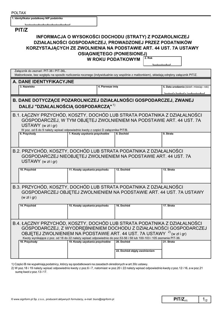 POLTAX 1. Identyfikator podatkowy NIP podatnika PIT/Z INFORMACJA O WYSOKOŚCI DOCHODU (STRATY) Z POZAROLNICZEJ DZIAŁALNOŚCI GOSPODARCZEJ, PROWADZONEJ PRZEZ PODATNIKÓW KORZYSTAJĄCYCH ZE ZWOLNIENIA NA PODSTAWIE ART. 44 UST. 7A USTAWY OSIĄGNIĘTEGO (PONIESIONEJ) W ROKU PODATKOWYM 2. Rok Załącznik do zeznań: PIT-36 i PIT-36L. Małżonkowie, bez względu na sposób rozliczenia rocznego (indywidualnie czy wspólnie z małżonkiem), składają odrębny załącznik PIT/Z. A. DANE IDENTYFIKACYJNE 3. Nazwisko 4. Pierwsze imię 5. Data urodzenia (dzień - miesiąc - rok) B. DANE DOTYCZĄCE POZAROLNICZEJ DZIAŁALNOŚCI GOSPODARCZEJ, ZWANEJ DALEJ "DZIAŁALNOŚCIĄ GOSPODARCZĄ" 1) B.1. ŁĄCZNY PRZYCHÓD, KOSZTY, DOCHÓD LUB STRATA PODATNIKA Z DZIAŁALNOŚCI GOSPODARCZEJ, W TYM OBJĘTEJ ZWOLNIENIEM NA PODSTAWIE ART. 44 UST. 7A USTAWY (w zł i gr) W poz. od 6 do 9 należy wpisać odpowiednio kwoty z części D załącznika PIT/B. 6. Przychody 7. Koszty uzyskania przychodów 8. Dochód 9. Strata B.2. PRZYCHÓD, KOSZTY, DOCHÓD LUB STRATA PODATNIKA Z DZIAŁALNOŚCI GOSPODARCZEJ NIEOBJĘTEJ ZWOLNIENIEM NA PODSTAWIE ART. 44 UST. 7A USTAWY (w zł i gr) 10. Przychód 11. Koszty uzyskania przychodu 12. Dochód 13. Strata B.3. PRZYCHÓD, KOSZTY, DOCHÓD LUB STRATA PODATNIKA Z DZIAŁALNOŚCI GOSPODARCZEJ OBJĘTEJ ZWOLNIENIEM NA PODSTAWIE ART. 44 UST. 7A USTAWY (w zł i gr) 14. Przychód 15. Koszty uzyskania przychodu 16. Dochód 17. Strata B.4. ŁĄCZNY PRZYCHÓD, KOSZTY, DOCHÓD LUB STRATA PODATNIKA Z DZIAŁALNOŚCI GOSPODARCZEJ, Z WYODRĘBNIENIEM DOCHODU Z DZIAŁALNOŚCI GOSPODARCZEJ OBJĘTEJ ZWOLNIENIEM NA PODSTAWIE ART. 44 UST. 7A USTAWY 2) (w zł i gr) Kwoty wynikające z poz. od 18 do 22 należy wpisać odpowiednio do poz.53-56 i 58 lub 100-103 i 105 zeznania PIT-36. 18. Przychody 19. Koszty uzyskania przychodów 20. Dochód 21. Strata 22. Dochód objęty zwolnieniem 1) Części B nie wypełniają podatnicy, którzy są opodatkowani na zasadach określonych w art.30c ustawy. 2) W poz.18 i 19 należy wpisać odpowiednio kwoty z poz.6 i 7, natomiast w poz.20 i 22 należy wpisać odpowiednio kwoty z poz.12 i 16, a w poz.21 sumę kwot z poz.13 i 17. © www.signform.pl Sp. z o.o., producent aktywnych formularzy, e-mail: [email protected] PIT/Z(4) 1/2 POLTAX C. DANE DOTYCZĄCE DOLICZENIA NA PODSTAWIE ART. 44 UST. 7F USTAWY C.1. PRZYCHÓD, KOSZTY, DOCHÓD LUB STRATA PODATNIKA Z DZIAŁALNOŚCI GOSPODARCZEJ (w zł i gr) W poz. od 23 do 26 należy wpisać odpowiednio kwoty z części D załącznika PIT/B. 23. Przychody 24. Koszty uzyskania przychodu 25. Dochód 26. Strata C.2. KWOTY ZWIĘKSZAJĄCE DOCHÓD/ZMNIEJSZAJĄCE STRATĘ Z DZIAŁALNOŚCI GOSPODARCZEJ NA PODSTAWIE ART. 44 UST. 7F USTAWY (w zł i gr) 20% kwoty dochodu wykazanego w zeznaniu PIT-36 składanym za rok podatkowy objęty zwolnieniem, o którym mowa w art. 44 ust. 7a ustawy 27. Rok Strata z działalności gospodarczej po doliczeniu na podstawie art. 44 ust. 7f ustawy 29. Od kwoty z poz.26 należy odjąć kwotę z poz.28; jeżeli różnica jest liczbą ujemną należy wpisać 0. Dochód podlegający doliczeniu do dochodu z działalności gospodarczej na podstawie art. 44 ust. 7f ustawy Od kwoty z poz.28 należy odjąć kwotę z poz.26; jeżeli różnica jest liczbą ujemną należy wpisać 0. Dochód z działalności gospodarczej po doliczeniu na podstawie art. 44 ust. 7f ustawy 3) 28. 30. 31. Do kwoty z poz.25 należy dodać kwotę z poz.30. C.3. ŁĄCZNY PRZYCHÓD, KOSZTY, DOCHÓD LUB STRATA PODATNIKA Z DZIAŁALNOŚCI GOSPODARCZEJ NA PODSTAWIE ART. 44 UST. 7F USTAWY 4) (w zł i gr) Kwoty wynikające z poz. od 32 do 35 należy wpisać odpowiednio do poz.53-56 lub 100-103 zeznania PIT-36 albo do poz.13-16 zeznania PIT-36L. 33. Koszty uzyskania przychodu 32. Przychody 34. Dochód 35. Strata 3) Należy podać rok, w którym podatnik korzystał ze zwolnienia na podstawie art. 44 ust. 7a ustawy. 4) W poz.32 i 33 należy wpisać odpowiednio kwoty z poz.23 i 24, natomiast w poz.34 i 35 odpowiednio kwoty z poz.31 i 29. PIT/Z(4) 2/2 © www.signform.pl Sp. z o.o., producent aktywnych formularzy, e-mail: [email protected]