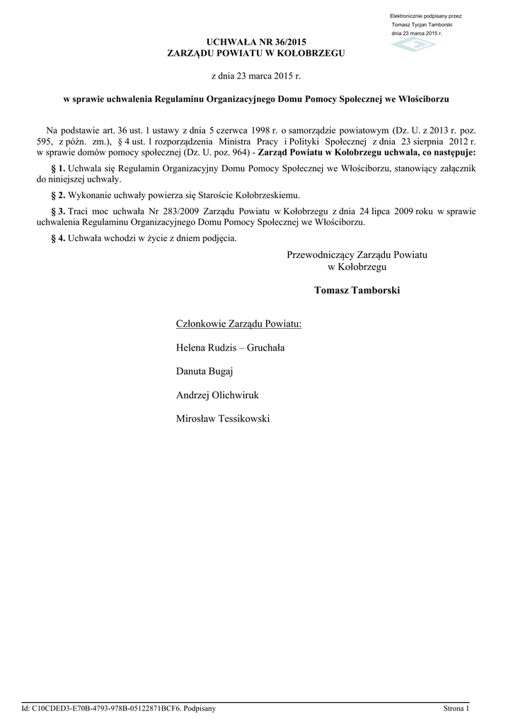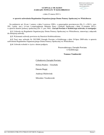 Elektronicznie podpisany przez: Tomasz Tycjan Tamborski dnia 23 marca 2015 r. UCHWAŁA NR 36/2015 ZARZĄDU POWIATU W KOŁOBRZEGU z dnia 23 marca 2015 r. w sprawie uchwalenia Regulaminu Organizacyjnego Domu Pomocy Społecznej we Włościborzu Na podstawie art. 36 ust. 1 ustawy z dnia 5 czerwca 1998 r. o samorządzie powiatowym (Dz. U. z 2013 r. poz. 595, z późn. zm.), § 4 ust. 1 rozporządzenia Ministra Pracy i Polityki Społecznej z dnia 23 sierpnia 2012 r. w sprawie domów pomocy społecznej (Dz. U. poz. 964) - Zarząd Powiatu w Kołobrzegu uchwala, co następuje: § 1. Uchwala się Regulamin Organizacyjny Domu Pomocy Społecznej we Włościborzu, stanowiący załącznik do niniejszej uchwały. § 2. Wykonanie uchwały powierza się Staroście Kołobrzeskiemu. § 3. Traci moc uchwała Nr 283/2009 Zarządu Powiatu w Kołobrzegu z dnia 24 lipca 2009 roku w sprawie uchwalenia Regulaminu Organizacyjnego Domu Pomocy Społecznej we Włościborzu. § 4. Uchwała wchodzi w życie z dniem podjęcia. Przewodniczący Zarządu Powiatu w Kołobrzegu Tomasz Tamborski Członkowie Zarządu Powiatu: Helena Rudzis – Gruchała Danuta Bugaj Andrzej Olichwiruk Mirosław Tessikowski Id: C10CDED3-E70B-4793-978B-05122871BCF6. Podpisany Strona 1 Załącznik do Uchwały Nr 36/2015 Zarządu Powiatu w Kołobrzegu z dnia 23 marca 2015 r. REGULAMIN ORGANIZACYJNY DOMU POMOCY SPOŁECZNEJ Rozdział 1. POSTANOWIENIA OGÓLNE § 1. 1. Regulamin organizacyjny, zwany dalej "Regulaminem", określa organizację i zasady funkcjonowania Domu Pomocy Społecznej we Włościborzu. 2. llekroć w Regulaminie jest mowa o Domu - należy przez to rozumieć Dom Pomocy Społecznej we Włościborzu i jego Filię w Kołobrzegu. § 2. 1. Dom jest jednostką budżetową działającą na zasadach określonych w ustawie z dnia 27 sierpnia 2009 roku o finansach publicznych (Dz. U. z 2013r., poz. 885, poz. 938, poz. 1646, z 2014r., poz. 379, poz. 911, poz. 1146). § 3. 1. Dom Pomocy Społecznej we Włościborzu jest placówką pomocy społecznej przeznaczoną dla osób przewlekle somatycznie chorych. 2. Dom dysponuje 85 miejscami we Włościborzu i 20 miejscami w Filii DPS w Kołobrzegu. Rozdział 2. ZADANIA I OBOWIĄZKI DOMU § 4. 1. Standard podstawowych usług świadczonych przez Dom określa rozporządzenie Ministra Pracy i Polityki Społecznej z dnia 23 sierpnia 2012r. w sprawie domów pomocy społecznej (Dz. U. z 2012r., poz. 964) oraz niniejszy Regulamin. 2. Do podstawowych zadań i obowiązków Domu należy: 1) zapewnienie mieszkańcom całodobowej opieki oraz zaspokojenie ich niezbędnych potrzeb bytowych, społecznych, religijnych i kulturalnych, 2) tworzenie właściwych warunków socjalno - bytowych gwarantujących mieszkańcom poszanowanie godności osobistej, poczucie bezpieczeństwa, intymności i rozwoju osobowości. § 5. 1. W celu określenia indywidualnych potrzeb mieszkańca Domu oraz zakresu i rodzaju usług, Dyrektor powołuje Zespół Terapeutyczno - Opiekuńczy. 2. Zadaniem Zespołu wymienionego w ust.1 jest w szczególności opracowywanie indywidualnych planów wsparcia mieszkańca oraz wspólna z mieszkańcem Domu ich realizacja i okresowa weryfikacja. Rozdział 3. STRUKTURA ORGANIZACYJNA § 6. 1. Dyrektor kieruje Domem i reprezentuje go na zewnątrz. 2. Dyrektor jest zwierzchnikiem służbowym w stosunku do pracowników zatrudnionych w Domu. 3. Dyrektorowi bezpośrednio podlegają: Zastępca Dyrektora, Główny Księgowy, Kierownik Działu Terapeutyczno-Opiekuńczego, Kierownik Filii DPS Kołobrzeg, Samodzielne stanowisko radcy prawnego. 4. Zastępcy Dyrektora bezpośrednio podlegają: Kierownik Działu Gospodarczo-Technicznego, Samodzielne stanowisko ds. administracji i kadr, Samodzielne stanowisko ds. bhp i p.poż. 5. Podczas nieobecności, Dyrektor może upoważnić pisemnie zastępcę dyrektora lub - w zależności od bieżących potrzeb - innego pracownika Domu do podejmowania w swoim imieniu określonych w upoważnieniu czynności związanych z funkcjonowaniem placówki. § 7. 1. Do obowiązków i kompetencji Dyrektora należy w szczególności: Id: C10CDED3-E70B-4793-978B-05122871BCF6. Podpisany Strona 1 1) ogólny nadzór nad wykonywaniem obowiązków przez osoby zatrudniane w Domu i jego reprezentowanie na zewnątrz – w tym sprawowanie funkcji reprezentanta pracodawcy wobec wszystkich zatrudnianych pracowników. 2) zapewnienie prawidłowego działania Domu poprzez właściwą organizację pracy oraz sprawowanie nadzoru nad wykonywanymi zadaniami, w tym także w formie kontroli wewnętrznej, 3) kierowanie Domem poprzez wydawanie zarządzeń wewnętrznych, instrukcji, poleceń służbowych i okólników, 4) kształtowanie właściwego stosunku personelu do mieszkańców, 5) zapewnienie mieszkańcom respektowania ich praw osobistych, 6) przyjmowanie, awansowanie i zwalnianie pracowników, 7) ustalanie zakresu obowiązków, kompetencji i odpowiedzialności pracowników. § 8. 1. W celu zapewnienia właściwego funkcjonowania Domu i należytej obsługi jego mieszkańców , ustanawia się w strukturze organizacyjnej Domu następujące komórki organizacyjne oznaczone określonymi symbolami: 1) Dyrektor - D 2) Zastępca Dyrektora - ZD 3) Dział Finansowo – Księgowy - FK 4) Dział Terapeutyczno – Opiekuńczy - TO 5) Dział Gospodarczo – Techniczny - GT 6) Filia DPS w Kołobrzegu - F 7) Samodzielne stanowisko ds. administracji i kadr - KA 8) Samodzielne stanowisko ds. bhp i p.poż. - BP 9) Samodzielne stanowisko radcy prawnego - RP 2. Działami : Terapeutyczno - Opiekuńczym, Gospodarczo - Technicznym i Filią DPS w Kołobrzegu - kierują kierownicy Działów, natomiast Działem Finansowo - Księgowym kieruje Główny Księgowy. 3. Kierownik Działu organizuje jego pracę i odpowiada za realizację należących do tej komórki zadań oraz za prawidłowe prowadzenie dokumentacji zgodnie z obowiązującymi przepisami. 4. Dyrektor Domu, według bieżących potrzeb, w drodze zarządzenia może powoływać dod