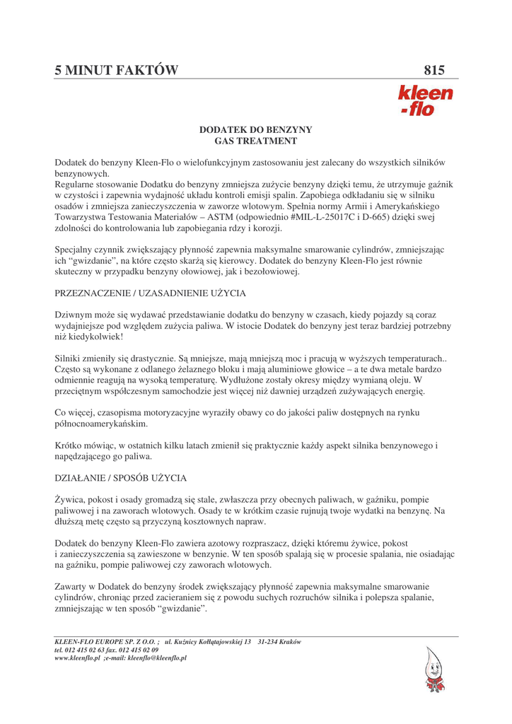 5 MINUT FAKTÓW 815 DODATEK DO BENZYNY GAS TREATMENT Dodatek do benzyny Kleen-Flo o wielofunkcyjnym zastosowaniu jest zalecany do wszystkich silników benzynowych. Regularne stosowanie Dodatku do benzyny zmniejsza zu ycie benzyny dzi ki temu, e utrzymuje ga nik w czysto ci i zapewnia wydajno układu kontroli emisji spalin. Zapobiega odkładaniu si w silniku osadów i zmniejsza zanieczyszczenia w zaworze wlotowym. Spełnia normy Armii i Ameryka skiego Towarzystwa Testowania Materiałów – ASTM (odpowiednio #MIL-L-25017C i D-665) dzi ki swej zdolno ci do kontrolowania lub zapobiegania rdzy i korozji. Specjalny czynnik zwi kszaj cy płynno zapewnia maksymalne smarowanie cylindrów, zmniejszaj c ich “gwizdanie”, na które cz sto skar si kierowcy. Dodatek do benzyny Kleen-Flo jest równie skuteczny w przypadku benzyny ołowiowej, jak i bezołowiowej. PRZEZNACZENIE / UZASADNIENIE U YCIA Dziwnym mo e si wydawa przedstawianie dodatku do benzyny w czasach, kiedy pojazdy s coraz wydajniejsze pod wzgl dem zu ycia paliwa. W istocie Dodatek do benzyny jest teraz bardziej potrzebny ni kiedykolwiek! Silniki zmieniły si drastycznie. S mniejsze, maj mniejsz moc i pracuj w wy szych temperaturach.. Cz sto s wykonane z odlanego elaznego bloku i maj aluminiowe głowice – a te dwa metale bardzo odmiennie reaguj na wysok temperatur . Wydłu one zostały okresy mi dzy wymian oleju. W przeci tnym współczesnym samochodzie jest wi cej ni dawniej urz dze zu ywaj cych energi . Co wi cej, czasopisma motoryzacyjne wyraziły obawy co do jako ci paliw dost pnych na rynku północnoameryka skim. Krótko mówi c, w ostatnich kilku latach zmienił si praktycznie ka dy aspekt silnika benzynowego i nap dzaj cego go paliwa. DZIAŁANIE / SPOSÓB U YCIA ywica, pokost i osady gromadz si stale, zwłaszcza przy obecnych paliwach, w ga niku, pompie paliwowej i na zaworach wlotowych. Osady te w krótkim czasie rujnuj twoje wydatki na benzyn . Na dłu sz met cz sto s przyczyn kosztownych napraw. Dodatek do benzyny Kleen-Flo zawiera azotowy rozpraszacz, dzi ki któremu ywice, pokost i zanieczyszczenia s zawieszone w benzynie. W ten sposób spalaj si w procesie spalania, nie osiadaj c na ga niku, pompie paliwowej czy zaworach wlotowych. Zawarty w Dodatek do benzyny rodek zwi kszaj cy płynno zapewnia maksymalne smarowanie cylindrów, chroni c przed zacieraniem si z powodu suchych rozruchów silnika i polepsza spalanie, zmniejszaj c w ten sposób “gwizdanie”. KLEEN-FLO EUROPE SP. Z O.O. ; ul. Ku nicy Kołł tajowskiej 13 31-234 Kraków tel. 012 415 02 63 fax. 012 415 02 09 www.kleenflo.pl ;e-mail: [email protected] 5 MINUT FAKTÓW 815 ZASTOSOWANIE Aby jak najlepiej wykorzysta mo liwo ci produktu, Dodatek do benzyny powinno si dodawa przy co drugim tankowaniu benzyny. Silniki, których wn trze jest czyste potrzebuj do pracy mniej paliwa i na ogół s trwalsze, wymagaj c mniejszej liczby napraw. MIEJSCA SPRZEDA Y / ZASTOSOWANIA Do stosowania we wszystkich nap dzanych benzyna pojazdach, maszynach i sprz cie. - Samochody osobowe - Ci arówki - Autobusy - Silniki jachtów (wewn trzne i zewn trzne) - Mopedy, motocykle - Pojazdy nie ne - Generatory pr du - Kosiarki i sprz t ogrodowy KORZY CI DLA NABYWCY / ODBIORCY - Zmniejsza zu ycie paliwa i zmniejsza “gwizdanie”. - Smaruje górn cz cylindrów. - Zmniejsza osady w układzie paliwowym. - Zapobiega osadzaniu si ywicy i pokostu. - Zapobiega powstawaniu w silniku szlamu. - Powstrzymuje rdz i korozj . - Mo na go bezpiecznie stosowa do benzyny ołowiowej i bezołowiowej. - Wystarcza na 91 litrów (20 galonów) benzyny. - Ekonomiczny – przy tej cenie mo na sobie na niego pozwoli przy ka dym tankowaniu. - Sto kowata szyjka butelki mie ci si łatwo do ka dego baku. - Piecz stwierdzaj ca otwieranie (pod zakr tk ) daje klientowi bezpiecze stwo. OPAKOWANIA: Nr katalogowy 815 – 12 x 395 ml KLEEN-FLO EUROPE SP. Z O.O. ; ul. Ku nicy Kołł tajowskiej 13 31-234 Kraków tel. 012 415 02 63 fax. 012 415 02 09 www.kleenflo.pl ;e-mail: [email protected]