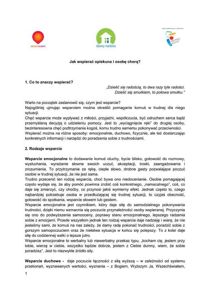 Jak wspierać opiekuna i osobę chorą? 1. Co to znaczy wspierać? „Dzielić się radością, to dwa razy tyle radości. Dzielić się smutkiem, to połowa smutku.” Warto na początek zastanowić się, czym jest wsparcie? Najogólniej ujmując wsparciem można określić pomaganie komuś w trudnej dla niego sytuacji. Chęć wsparcia może wypływać z miłości, przyjaźni, współczucia, być odruchem serca bądź przemyślaną decyzją o udzieleniu pomocy. Jest to „wyciągnięcie ręki” do drugiej osoby, bezinteresowna chęć podtrzymania kogoś, komu trudno samemu pokonywać przeciwności. Wspierać można na różne sposoby: emocjonalnie, duchowo, fizycznie, ale też dostarczając konkretnych informacji i narzędzi do poradzenia sobie z trudnościami. 2. Rodzaje wsparcia Wsparcie emocjonalne to dodawanie komuś otuchy, bycie blisko, gotowość do rozmowy, wysłuchania, wyrażanie słowne swoich uczuć, akceptacji, troski, zaangażowania i zrozumienia. To przytrzymanie za rękę, ciepłe słowo, drobne gesty pozwalające poczuć osobie w trudnej sytuacji, że nie jest sama. Trudno przecenić ten rodzaj wsparcia, choć bywa ono niedocenianie. Osobie pomagającej często wydaje się, że aby pomóc powinna zrobić coś konkretnego, „namacalnego”, coś, co daje się zmierzyć, czy choćby, co przynosi jakiś wymierny efekt. Jednak często to, czego najbardziej potrzebuje osoba w przedłużającej się trudnej sytuacji, to czyjaś obecność, gotowość do spotkania, wsparcie słowem lub gestem. Wsparcie emocjonalne jest czynnikiem, który daje siłę do samodzielnego pokonywania trudności, dzięki niemu wzmacnia się poczucie przynależności osoby wspieranej. Przyczynia się ono do podwyższenia samooceny, poprawy stanu emocjonalnego, lepszego radzenia sobie z emocjami. Przede wszystkim jednak ten rodzaj wsparcia daje nadzieję i wiarę, że nie jesteśmy sami, że komuś na nas zależy, że damy radę pokonać trudności, poradzić sobie z gorszym samopoczuciem oraz że niełatwa sytuacja w końcu się polepszy. To z kolei daje siłę do codziennej walki o lepsze jutro. Wsparcie emocjonalne to werbalny lub niewerbalny przekaz typu, „kocham cię, jestem przy tobie, wierzę w ciebie, wszystko będzie dobrze, jestem z Ciebie dumny, wiem, że sobie poradzisz”. Jest to niezwykłe źródło siły. Wsparcie duchowe - daje poczucie łączności z siłą wyższą – w zależności od systemu przekonań, wyznawanych wartości, wyznania – z Bogiem, Wyższym Ja, Wszechświatem, 1 Miłością, Istnieniem itp. Połączenie z tą siłą sprawia, że człowiek nabiera przekonania o głębszym sensie trudnych doświadczeń, przez które przechodzi i stara się odkrywać ich znaczenie. Łącznikiem z tą siłą może być np. kapłan, przewodnik duchowy, uzdrowiciel, szaman. Uzyskując wsparcie duchowe osoba cierpiąca jest w stanie przekroczyć fizyczne granice swojego istnienia. Wykraczając poza nie czerpie siłę z połączenia z czymś większym od niej samej. Może umocnić się w swojej wierze, nabrać duchowej siły, osiągnąć wewnętrzny stan spokoju. Ten rodzaj wsparcia odnosi się do sfery duchowości człowieka, potrzeby poszukiwania celu oraz istoty bycia, życia i śmierci. Wsparcie informacyjne polega na dostarczaniu danych i informacji, które mogą pomóc drugiej osobie. To także udzielanie porad, dostarczanie wiedzy, która może być pomocna w lepszym rozumieniu trudnej sytuacji, potrzeb, stanu emocjonalnego itp. Aby ten rodzaj pomocy był skuteczny, powinien być „opatrzony” wsparciem emocjonalnym, dostosowany do potrzeb danej osoby, jej kondycji psychicznej. I przede wszystkim chciany. W przeciwnym razie takie wsparcie może być odbierane jako mądrzenie się, górowanie, a nawet atak. Oprócz tego, że dostarczamy osobie jakiejś informacji, powinniśmy być czujni na jej reakcje na nasz przekaz, na sposób, w jaki informacja zostaje przyjęta. Warto również o tych reakcjach wspólnie porozmawiać. Wsparcie informacyjne jest skuteczne wówczas, gdy jest odpowiedzią na czyjąś potrzebę lepszego radzenia sobie z trudnościami w oparciu o sposoby, narzędzia, wiedzę o tym, w jaki sposób i skąd czerpać zasoby do poradzenia sobie w kryzysie. Źródłem tego rodzaju wsparcia są najczęściej osoby znajome, przyjaciele, ale i profesjonaliści – terapeuci, psycholodzy, pracownicy instytucji pomocowych, lekarze itp. Mogą to być także książki, poradniki, filmy. Wsparcie instrumentalne polega na udzieleniu bezpośredniej pomocy osobie potrzebującej. Może ono przybierać różne formy, takie jak: dostarczenie darów, usług, pomoc finansowa. To także odciążenie kogoś od obowiązków, np. zrobienie zakupów, pomoc w sprzątaniu, przygotowanie posiłków, karmienie, zajęcie się dziećmi, zaopatrzenie w lekarstwa i środki lecznicze, przekazanie sprzętu rehabilitacyjnego, wyremontowanie mieszkania itp. Jest to najbardziej namacalny typ pomocy, znacznie ułatwiający codzienne funkcjonowanie osobie potrzebującej. Dostarcza zasoby, dobra, które są poza zasięgiem jej możliwości. Ten typ wsparcia jest najbardziej potrzebny w sytuacjach choroby, biedy, utraty kogoś lub czegoś, a także katastrof, klęsk żywiołowych itp. 3. Rola wsparcia Niewątpliwie jest tak, że każdy człowiek, w zależności od problemu, z jakim się styka oraz od struktury osobowości, posiadanych zasobów, oczekuje i potrzebuje od bliższych i dalszych osób jakiegoś rodzaju wsparcia. Wsparcie ma ogromne znaczenie w procesie codziennego zmagania się z trudnymi sytuacjami życiowymi i wynikającym z nich stresem psychicznym. Odgrywa pozytywną rolę w zwalczaniu stresu pourazowego i zawodowego, kryzysu psychicznego, w radzeniu sobie z chorobami somatycznymi i walce z uzależnieniami. W przypadku osoby chorej, korzyści ze 2 wsparcia są olbrzymie – jest ono nieodzownym wspomożeniem leczenia farmakologicznego i wszelkich terapii medycznych. W przypadku poważnyc