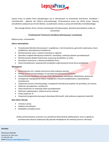 Lepsza Praca to polska firma specjalizująca się w rekrutacjach na stanowiska techniczne, handlowe i menedżerskie - głównie dla sektora przemysłowego. Prezentowane przez nas oferty pracy, dotyczą zatrudnienia wyłącznie po stronie klienta, na podstawie umowy o pracę lub kontraktu menedżerskiego. Dla naszego klienta, firmy z branży wentylacyjno-klimatyzacyjnej, aktualnie poszukujemy osoby na stanowisko: Przedstawiciel Techniczno-Handlowy (klimatyzacja i wentylacja) Miejsce pracy: mazowieckie Zakres obowiązków: Pozyskiwanie klientów biznesowych i współpraca z nimi (inwestorzy, generalni wykonawcy, biura projektowe, dystrybutorzy instalatorzy) Monitorowanie rynku i nowych inwestycji w regionie Sprzedaż urządzeń klimatyzacji komfortu i wentylacji, realizacja planów sprzedażowych Monitorowanie działań konkurencji, pozycji jej produktów na rynku Doradztwo techniczne z zakresie produktów firmy Ocena kompletności i poprawności projektów wykonywanych przez biura projektowe Wymagania: Wykształcenie min. średnie techniczne (mile widziane wyższe) Wiedza techniczna pozwalająca na sprzedaż konsultacyjną produktów Doświadczenie handlowe w branży HVAC (klimatyzacja, wentylacja, chłodnictwo, grzewcza) Umiejętność nawiązywania relacji i współpracy z biurami projektowymi, wykonawcami, instalatorami Znajomość procesu inwestycyjnego, umiejętność koordynacji projektu od sprzedaży, po montaż Zdolności sprzedażowe i analityczne Ukierunkowanie na realizację celów sprzedażowych Zdolności organizacyjne, zwłaszcza pracy własnej Prawo jazdy kat. B Znajomość programów biurowych dystrybucji Microsoft, mile widziana znajomość AutoCAD Nasz klient oferuje: Umowę o pracę Stabilne zatrudnienie Niezbędne narzędzia pracy Osoby zainteresowane, proszone są o przesłanie dokumentów aplikacyjnych, wraz ze zgodą na przetwarzanie danych osobowych dla potrzeb niezbędnych do realizacji procesu rekrutacji. Kontakt: Katarzyna Skalska Specjalista ds. Rekrutacji Tel. 696 003 788 Email: [email protected]