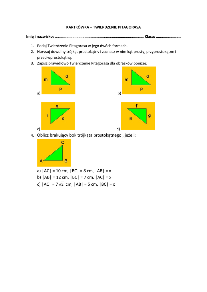 KARTKÓWKA – TWIERDZENIE PITAGORASA Imię i nazwisko: ……………………………………………………………………………… Klasa: ……………………. 1. Podaj Twierdzenie Pitagorasa w jego dwóch formach. 2. Narysuj dowolny trójkąt prostokątny i zaznacz w nim kąt prosty, przyprostokątne i przeciwprostokątną. 3. Zapisz prawidłowo Twierdzenie Pitagorasa dla obrazków poniżej: a) b) c) d) 4. Oblicz brakujący bok trójkąta prostokątnego , jeżeli: a) |AC| = 10 cm, |BC| = 8 cm, |AB| = x b) |AB| = 12 cm, |BC| = 7 cm, |AC| = x c) |AC| = 7 2 cm, |AB| = 5 cm, |BC| = x