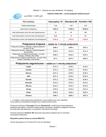 Wariant 1 - Umowa na czas określony 12 miesięcy Telefonia Wide-Net – cennik połączeń telefonicznych Plan taryfowy Oszczędny 15 Standard 60 Komfort 180 Opłata aktywacyjna 1 zł 1 zł 1 zł Abonament miesięczny 9,90 zł 15,90 zł 30,90 zł Ilość darmowych minut do sieci stacjonarnych 15 60 180 Ilość darmowych minut do sieci komórkowych brak 15 30 Prezentacja numeru dla połączeń przychodzących 0,00 zł 0,00 zł 0,00 zł Połączenia krajowe – opłata za 1 minutę połączenia Połączenia lokalne, strefowe i międzymiastowe – do sieci TP SA Połączenia lokalne, strefowe i międzymiastowe – do sieci NOL Połączenia na telefony komórkowe – do sieci Orange, T-Mobile, Plus GSM Połączenia na telefony komórkowe – do sieci Play, Polsat, CenterNet, inne MVNO 0,09 zł 0,08 zł 0,07 zł 0,15 zł 0,13 zł 0,11 zł 0,35 zł 0,34 zł 0,33 zł 0,7 zł 0,67 zł 0,65 zł Połączenia zagraniczne – opłata za 1 minutę połączenia * Anglia 0,11 zł 0,10 zł 0,10 zł Irlandia 0,11 zł 0,10 zł 0,10 zł Niemcy 0,11 zł 0,10 zł 0,10 zł USA 0,11 zł 0,10 zł 0,10 zł Kanada 0,11 zł 0,10 zł 0,10 zł Holandia 0,13 zł 0,12 zł 0,12 zł Włochy 0,13 zł 0,12 zł 0,12 zł Grecja 0,15 zł 0,14 zł 0,13 zł Rosja 0,35 zł 0,34 zł 0,32 zł Ukraina 0,94 zł 0,90 zł 0,87 zł * - w związku z obecnością wielu operatorów w tych krajach są to ceny najniższe. Ceny zależne od operatorów dostępne są w pełnej wersji cennika W planach taryfowych Oszczędny 15 oraz Standard 60, za pierwszą minutę połączenia pobierana jest opłata w wysokości pełnej stawki minutowej a następnie następuje naliczanie za każdą sekundę połączenia, w wysokości 1/60 stawki minutowej. W planie taryfowym Komfort 180 naliczanie sekundowe dostępne jest od momentu rozpoczęcia połączenia. Wszystkie podane kwoty są cenami BRUTTO. Cennik obowiązuje od 10 marca 2012 roku do odwołania Strona 1