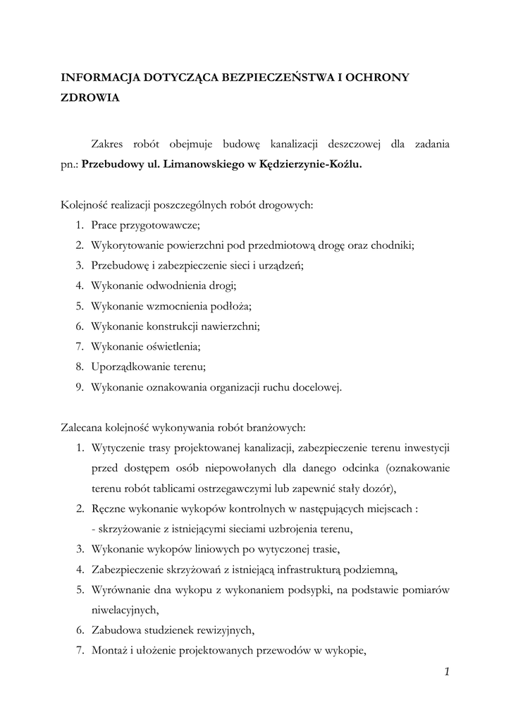 INFORMACJA DOTYCZĄCA BEZPIECZEŃSTWA I OCHRONY ZDROWIA Zakres robót obejmuje budowę kanalizacji deszczowej dla zadania pn.: Przebudowy ul. Limanowskiego w Kędzierzynie-Koźlu. Kolejność realizacji poszczególnych robót drogowych: 1. Prace przygotowawcze; 2. Wykorytowanie powierzchni pod przedmiotową drogę oraz chodniki; 3. Przebudowę i zabezpieczenie sieci i urządzeń; 4. Wykonanie odwodnienia drogi; 5. Wykonanie wzmocnienia podłoża; 6. Wykonanie konstrukcji nawierzchni; 7. Wykonanie oświetlenia; 8. Uporządkowanie terenu; 9. Wykonanie oznakowania organizacji ruchu docelowej. Zalecana kolejność wykonywania robót branżowych: 1. Wytyczenie trasy projektowanej kanalizacji, zabezpieczenie terenu inwestycji przed dostępem osób niepowołanych dla danego odcinka (oznakowanie terenu robót tablicami ostrzegawczymi lub zapewnić stały dozór), 2. Ręczne wykonanie wykopów kontrolnych w następujących miejscach : - skrzyżowanie z istniejącymi sieciami uzbrojenia terenu, 3. Wykonanie wykopów liniowych po wytyczonej trasie, 4. Zabezpieczenie skrzyżowań z istniejącą infrastrukturą podziemną, 5. Wyrównanie dna wykopu z wykonaniem podsypki, na podstawie pomiarów niwelacyjnych, 6. Zabudowa studzienek rewizyjnych, 7. Montaż i ułożenie projektowanych przewodów w wykopie, 1 8. Wykonanie podbudowy i nowej nawierzchni drogi (wg. branży drogowej projektu), 9. Włączenie kanalizacji do istniejącej studzienki, 10. Próba szczelności kanalizacji, 11. Wykonanie pomiarów geodezyjnych powykonawczych, 12. Obsypanie przewodów piaskiem wraz z zagęszczeniem gruntu, 13. Zasypanie wykopów gruntem rodzimym, 14. Uporządkowanie terenu z przywróceniem do stanu pierwotnego, 15. Prześwietlenie wykonanej kanalizacji – sprawdzenie jakości wykonanej kanalizacji, Na działce znajdują się obiekty oraz elementy, które mogą stwarzać zagrożenie bezpieczeństwa i zdrowia ludzi. 1) Kablowa sieć energetyczna. 2) Sieć kanalizacyjna. 3) Sieć telekomunikacyjnej. 4) Sieć wodociągowa. 5) Sieć gazowa. Przewidywane zagrożenia występujące podczas realizacji robót budowlanych, określające ich skalę i rodzaje zagrożeń oraz miejsce i czas ich wystąpienia. Podczas realizacji robót budowlanych będą występowały typowe dla wielobranżowych inwestycji drogowych rodzaje zagrożeń wynikające min. z wykonywania robót ziemnych z użyciem sprzętu zmechanizowanego. Skala zagrożeń jest ograniczona do placu budowy (zagrożenie lokalne). Miejsce i czas wystąpienia zagrożeń: każdorazowo podczas wykonywania robót budowlanych w obszarze i w czasie wykonywania. 2 Wskazanie sposobu prowadzenia instruktażu pracowników przed przystąpieniem do realizacji robót szczególnie niebezpiecznych. Szkolenia w dziedzinie bezpieczeństwa i higieny pracy dla pracowników zatrudnionych na stanowiskach robotniczych, przeprowadza się jako: - szkolenie wstępne, - szkolenie okresowe. Szkolenia te przeprowadzane są w oparciu o programy poszczególnych rodzajów szkolenia. Pracownicy przed przystąpieniem do pracy, powinni być zapoznani z ryzykiem zawodowym związanym z pracą na danym stanowisku pracy. Szkolenia okresowe w zakresie bhp dla pracowników zatrudnionych na stanowiskach robotniczych, powinny być przeprowadzane w formie instruktażu nie rzadziej niż raz na 3 - lata, a na stanowiskach pracy na których występują szczególnie dla zagrożenia dla zdrowia oraz zagrożenia wypadkowe - nie rzadziej niż raz w roku. Na placu budowy powinny być udostępnione pracownikom do stałego korzystania, aktualne instrukcje bezpieczeństwa i higieny pracy dotyczące: - wykonywania prac związanych z zagrożeniami wypadkowymi lub zagrożeniami zdrowia pracowników, - obsługi maszyn i innych urządzeń technicznych, - postępowania z materiałami szkodliwymi dla zdrowia i niebezpiecznymi, - udzielania pierwszej pomocy. W/w instrukcje powinny określać czynności do wykonywania przed rozpoczęciem danej pracy, zasady i sposoby bezpiecznego wykonywania danej pracy, czynności do wykonywania po jej zakończeniu oraz zasady postępowania w sytuacjach awaryjnych stwarzających zagrożenia dla życia lub zdrowia pracowników. 3 Nie wolno dopuścić pracownika do pracy - do której wykonywania nie posiada wymaganych kwalifikacji lub potrzebnych umiejętności, a także dostatecznej znajomości przepisów oraz zasad bhp. Bezpośredni nadzór nad bezpieczeństwem i higieną pracy na stanowiskach pracy sprawują odpowiednio kierownik budowy (kierownik robót) oraz majster budowy, stosownie do zakresu obowiązków. W razie stwierdzenia bezpośredniego zagrożenia dla życia lub zdrowia pracowników osoba kierująca, pracownikami obowiązana jest do niezwłocznego wstrzymania prac i podjęcia działań w celu usunięcia tego zagrożenia. Wskazanie środków technicznych i organizacyjnych, zapobiegających niebezpieczeństwom wynikającym z wykonywania robót budowlanych w strefach szczególnego zagrożenia zdrowia lub w ich sąsiedztwie, w tym zapewniających bezpieczną i sprawną komunikację, umożliwiającą szybką ewakuację na wypadek pożaru, awarii i innych zagrożeń. Roboty w pasie drogowym należy prowadzić po wykonaniu zabezpieczenia miejsca robót zgodnie z zatwierdzonym projektem organizacji ruchu. 4