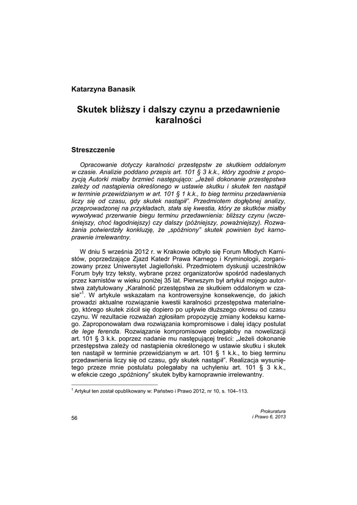 K. Banasik Katarzyna Banasik Skutek bliŜszy i dalszy czynu a przedawnienie karalności Streszczenie Opracowanie dotyczy karalności przestępstw ze skutkiem oddalonym w czasie. Analizie poddano przepis art. 101 § 3 k.k., który zgodnie z propozycją Autorki miałby brzmieć następująco: „JeŜeli dokonanie przestępstwa zaleŜy od nastąpienia określonego w ustawie skutku i skutek ten nastąpił w terminie przewidzianym w art. 101 § 1 k.k., to bieg terminu przedawnienia liczy się od czasu, gdy skutek nastąpił”. Przedmiotem dogłębnej analizy, przeprowadzonej na przykładach, stała się kwestia, który ze skutków miałby wywoływać przerwanie biegu terminu przedawnienia: bliŜszy czynu (wcześniejszy, choć łagodniejszy) czy dalszy (późniejszy, powaŜniejszy). RozwaŜania potwierdziły konkluzję, Ŝe „spóźniony” skutek powinien być karnoprawnie irrelewantny. W dniu 5 września 2012 r. w Krakowie odbyło się Forum Młodych Karnistów, poprzedzające Zjazd Katedr Prawa Karnego i Kryminologii, zorganizowany przez Uniwersytet Jagielloński. Przedmiotem dyskusji uczestników Forum były trzy teksty, wybrane przez organizatorów spośród nadesłanych przez karnistów w wieku poniŜej 35 lat. Pierwszym był artykuł mojego autorstwa zatytułowany „Karalność przestępstwa ze skutkiem oddalonym w czasie”1. W artykule wskazałam na kontrowersyjne konsekwencje, do jakich prowadzi aktualne rozwiązanie kwestii karalności przestępstwa materialnego, którego skutek ziścił się dopiero po upływie dłuŜszego okresu od czasu czynu. W rezultacie rozwaŜań zgłosiłam propozycję zmiany kodeksu karnego. Zaproponowałam dwa rozwiązania kompromisowe i dalej idący postulat de lege ferenda. Rozwiązanie kompromisowe polegałoby na nowelizacji art. 101 § 3 k.k. poprzez nadanie mu następującej treści: „JeŜeli dokonanie przestępstwa zaleŜy od nastąpienia określonego w ustawie skutku i skutek ten nastąpił w terminie przewidzianym w art. 101 § 1 k.k., to bieg terminu przedawnienia liczy się od czasu, gdy skutek nastąpił”. Realizacja wysuniętego przeze mnie postulatu polegałaby na uchyleniu art. 101 § 3 k.k., w efekcie czego „spóźniony” skutek byłby karnoprawnie irrelewantny. 1 Artykuł ten został opublikowany w: Państwo i Prawo 2012, nr 10, s. 104–113. 56 Prokuratura i Prawo 6, 2013 Skutek bliŜszy i dalszy czynu a przedawnienie… Moja propozycja wzbudziła wprawdzie zainteresowanie, ale w dyskusji zostały wyraŜone wobec niej głosy jedynie krytyczne. Odnoszono się głównie do rozwiązania kompromisowego. Postawiony in fine postulat de lege ferenda spotkał się raczej z milczeniem. Zdaje się, Ŝe obecni na Forum karniści uznali, Ŝe lepszą – ewentualnie – propozycją jest rozwiązanie kompromisowe. Broniąc koncepcji, naleŜy ustosunkować się do podniesionych zarzutów i zgłoszonych problemów, jakie – zdaniem dyskutantów – powstałyby w razie realizacji mojego postulatu. Wskazano między innymi, Ŝe kwestię temporalnych granic karalności czynu da się rozwiązać na płaszczyźnie przypisania skutku, a przez to analizowany przeze mnie problem nie ma duŜego znaczenia w praktyce. Ponadto, Ŝe po wielu latach od popełnienia czynu nie moŜna by, kierując się regułami obiektywnego przypisania skutku, przypisać skutku, a przez to sprawca nie zostałby skazany za dokonanie popełnionego przed laty przestępstwa. Nie zagłębiając się w tym miejscu w problematykę przypisania skutku – wszak jest to zagadnienie odrębne i niezwiązane stricte z przedmiotem rozwaŜań – trzeba zaakcentować, Ŝe z pewnością nie moŜna wykluczyć przypadków, w których będzie moŜliwe przypisanie sprawcy skutku jego zachowania. Fakt, Ŝe w wielu przypadkach nie będzie to moŜliwe, nie rozwiązuje problemu. Bezsprzecznie dla pojedynczego sprawcy ma znaczenie prawna dopuszczalność pociągnięcia go do odpowiedzialności karnej. Na tle zasady humanitaryzmu prawa karnego oraz indywidualizacji odpowiedzialności karnej nie wolno bagatelizować nawet pojedynczego człowieka. Wszak konsekwencje prawne wydania wyroku skazującego są oczywiste. Jeden z uczestników wspomniał o uzasadnieniu przedawnienia. Zdaje się, Ŝe jego zdaniem miałoby ono przemawiać przeciwko mojej propozycji. Zagadnienie zasadności bytu instytucji przedawnienia w prawie karnym będzie przedmiotem rozwaŜań w mojej innej pracy. Ze względu na jego odrębność i złoŜoność w tym miejscu moŜna jedynie zasygnalizować, Ŝe brak jest jednego, w pełni przekonywującego argumentu, który definitywnie przemawiałby za przyjęciem przedawnienia. Wydaje się, Ŝe akceptacja instytucji przedawnienia w prawie karnym jest wyrazem pewnego kompromisu. Uzasadnienie przedawnienia nie było głównym przedmiotem artykułu, dlatego teŜ jedynie wspomniałam w nim o prewencji jako argumencie powszechnie wymienianym w literaturze. Podtrzymuję tezę, Ŝe po latach od popełnienia czynu odpada potrzeba ukarania sprawcy ze względu na prewencję specjalną, co uwidacznia się w szczególności przy przestępstwach nieumyślnych, a oceny tej nie zmienia fakt nastąpienia skutku. Przyjmując generalnie przedawnialność przestępstw z powołaniem się na względy prewencyjne, „uzasadnienie” przedawnienia przemawia za urzeczywistnieniem mojego postulatu. Prokuratura i Prawo 6, 2013 57 K. Banasik Padło pytanie, czy uchylenie art. 101 § 3 k.k. moŜna by uzasadnić samym art. 6 § 1 k.k. UwaŜam, Ŝe nie. Odwołanie się do art. 6 § 1 k.k. nie wyjaśnia problemu i nie wnosi nic nowego do zagadnienia „spóźnionego” skutku. Przepis art. 6 § 1 k.k. definiuje, czym jest czas popełnienia przestępstwa, a tym samym wyjaśnia jeden z elementów składowych normy zawartej w art. 101 § 1 k.k. Powołanie art. 6 § 1 k.k. nie moŜe być traktowane jako argument za ani przeciw normie z art. 101 § 3 k.k. Przepis art. 101 § 1 k.k. określa podstawowe terminy przedawnienia ka