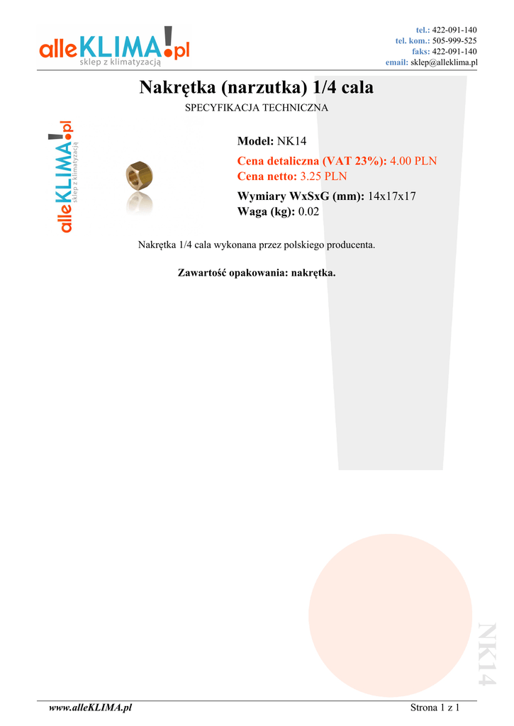tel.: 422-091-140 tel. kom.: 505-999-525 faks: 422-091-140 email: [email protected] Nakrętka (narzutka) 1/4 cala SPECYFIKACJA TECHNICZNA Model: NK14 Cena detaliczna (VAT 23%): 4.00 PLN Cena netto: 3.25 PLN Wymiary WxSxG (mm): 14x17x17 Waga (kg): 0.02 Nakrętka 1/4 cala wykonana przez polskiego producenta. Zawartość opakowania: nakrętka. NK14 www.alleKLIMA.pl Strona 1 z 1