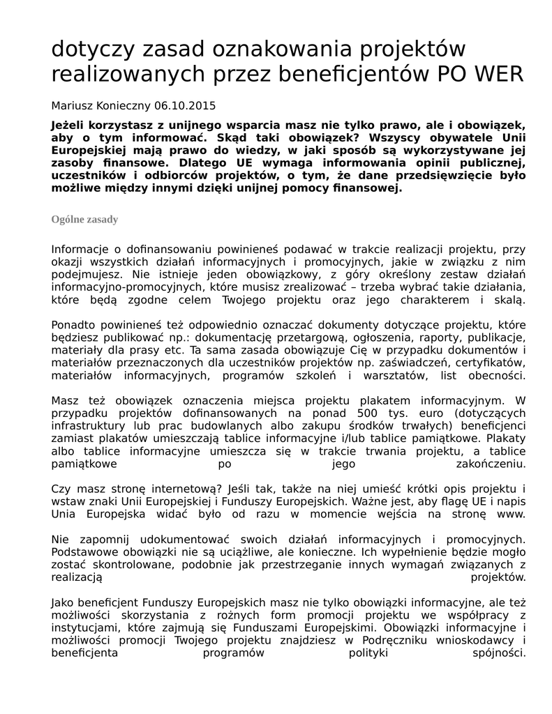 dotyczy zasad oznakowania projektów realizowanych przez beneficjentów PO WER Mariusz Konieczny 06.10.2015 Jeżeli korzystasz z unijnego wsparcia masz nie tylko prawo, ale i obowiązek, aby o tym informować. Skąd taki obowiązek? Wszyscy obywatele Unii Europejskiej mają prawo do wiedzy, w jaki sposób są wykorzystywane jej zasoby finansowe. Dlatego UE wymaga informowania opinii publicznej, uczestników i odbiorców projektów, o tym, że dane przedsięwzięcie było możliwe między innymi dzięki unijnej pomocy finansowej. Ogólne zasady Informacje o dofinansowaniu powinieneś podawać w trakcie realizacji projektu, przy okazji wszystkich działań informacyjnych i promocyjnych, jakie w związku z nim podejmujesz. Nie istnieje jeden obowiązkowy, z góry określony zestaw działań informacyjno-promocyjnych, które musisz zrealizować – trzeba wybrać takie działania, które będą zgodne celem Twojego projektu oraz jego charakterem i skalą. Ponadto powinieneś też odpowiednio oznaczać dokumenty dotyczące projektu, które będziesz publikować np.: dokumentację przetargową, ogłoszenia, raporty, publikacje, materiały dla prasy etc. Ta sama zasada obowiązuje Cię w przypadku dokumentów i materiałów przeznaczonych dla uczestników projektów np. zaświadczeń, certyfikatów, materiałów informacyjnych, programów szkoleń i warsztatów, list obecności. Masz też obowiązek oznaczenia miejsca projektu plakatem informacyjnym. W przypadku projektów dofinansowanych na ponad 500 tys. euro (dotyczących infrastruktury lub prac budowlanych albo zakupu środków trwałych) beneficjenci zamiast plakatów umieszczają tablice informacyjne i/lub tablice pamiątkowe. Plakaty albo tablice informacyjne umieszcza się w trakcie trwania projektu, a tablice pamiątkowe po jego zakończeniu. Czy masz stronę internetową? Jeśli tak, także na niej umieść krótki opis projektu i wstaw znaki Unii Europejskiej i Funduszy Europejskich. Ważne jest, aby flagę UE i napis Unia Europejska widać było od razu w momencie wejścia na stronę www. Nie zapomnij udokumentować swoich działań informacyjnych i promocyjnych. Podstawowe obowiązki nie są uciążliwe, ale konieczne. Ich wypełnienie będzie mogło zostać skontrolowane, podobnie jak przestrzeganie innych wymagań związanych z realizacją projektów. Jako beneficjent Funduszy Europejskich masz nie tylko obowiązki informacyjne, ale też możliwości skorzystania z rożnych form promocji projektu we współpracy z instytucjami, które zajmują się Funduszami Europejskimi. Obowiązki informacyjne i możliwości promocji Twojego projektu znajdziesz w Podręczniku wnioskodawcy i beneficjenta programów polityki spójności. Obowiązkowe oznaczenia Jeżeli jesteś beneficjentem Funduszy Europejskich musisz oznaczać: • działania informacyjne i promocyjne, • dokumenty związane z projektem podawane do wiadomości publicznej i przeznaczone dla uczestników projektów, • miejsca realizacji współfinansowanego przedsięwzięcia. Każde oznaczenie musi zawierać następujące znaki: • znak Funduszy Europejskich (właściwy dla danego programu), • znak Unii Europejskiej (właściwy dla danego funduszu), • w przypadku projektów współfinansowanych z PO WER Wojewódzkiego Urzędu Pracy w Rzeszowie. również logo Znak Funduszy Europejskich Znak Funduszy Europejskich złożony jest z symbolu graficznego, nazwy Fundusze Europejskie oraz nazwy programu, z którego korzystasz. Znak Unii Europejskiej Znak Unii Europejskiej składa się z flagi UE, napisu Unia Europejska i nazwy funduszu, który współfinansuje Twój projekt. Zestawienie znaków Przykładowe zestawienie znaków składa się z znaku Funduszy Europejskich i znaku Unii Europejskiej. Jak oznaczać projekty z wielu programów lub funduszy? Jeżeli Twoje działanie informacyjne lub promocyjne, dokument albo materiał dotyczy: • projektów realizowanych w ramach kilku programów należy stosować wspólny znak Fundusze Europejskie. • projektów dofinansowanych z więcej niż jednego funduszu polityki spójności znak Unii należy podpisać tekstem: Unia Europejska i Europejskie Fundusze Strukturalne i Inwestycyjne. Widoczność znaków Znak Funduszy Europejskich oraz znak Unii Europejskiej muszą być zawsze umieszczone w widocznym miejscu. Ich umiejscowienie oraz wielkość muszą być odpowiednie do charakteru i wielkości materiału, przedmiotu czy dokumentu. Musisz zwrócić szczególną uwagę, żeby znaki i napisy były czytelne dla odbiorcy i wyraźnie widoczne. Kolejność znaków Znak Funduszy Europejskich znajduje się zawsze z lewej strony, a znak Unii Europejskiej z prawej strony. W przypadkach, gdy nie możesz umieścić znaków w poziomie, możesz wykorzystać pionowe ułożenie znaków, w którym znak Funduszy Europejskich z nazwą programu znajduje się na górze, a znak Unii Europejskiej na dole. Liczba znaków Liczba znaków zestawionych ze sobą nie może przekraczać czterech łącznie ze znakami Funduszy Europejskich oraz Unii Europejskiej. Dodatkowe znaki, jeśli potrzebujesz, możesz umieścić w innej linii. Musisz jednak przestrzegać zasady, że jeśli w zestawieniu lub na materiale występują inne dodatkowe znaki, to nie mogą być one większe (mierzone wysokością lub szerokością) od symbolu (flagi) Unii Europejskiej. W zestawieniu znaków możesz dodatkowo dodać logo beneficjenta. Nie możesz natomiast umieszczać znaków wykonawców, którzy wykonują działania i usługi w ramach projektu, a którzy nie są beneficjentami. Plakaty Informacyjne Do umieszczania plakatów w trakcie realizacji projektu są zobowiązani beneficjenci, którzy nie mają obowiązku umieszczania tablic informacyjnych lub tablic pamiątkowych. Plakat musi zawierać informacje: • • • • • • nazwę beneficjenta, tytuł projektu, cel projektu (opcjonalnie), wysokość wkładu Unii Europejskiej w projekt, zestaw logo – znaki FE i UE oraz logo Woje