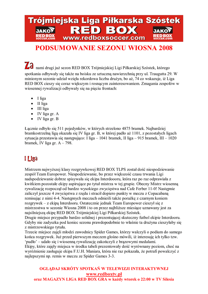 PODSUMOWANIE SEZONU WIOSNA 2008 nami drugi już sezon RED BOX Trójmiejskiej Ligi Piłkarskiej Szóstek, którego spotkania odbywały się także na boisku ze sztuczną nawierzchnią przy ul. Traugutta 29. W minionym sezonie udział wzięła rekordowa liczba drużyn, bo aż, 74 co wskazuje, iż Liga RED BOX cieszy się coraz większym i rosnącym zainteresowaniem. Zmagania zespołów w wiosennej rywalizacji odbywały się na pięciu frontach: I liga II liga III liga IV liga gr. A IV liga gr. B Łącznie odbyło się 511 pojedynków, w których strzelono 4875 bramek. Najbardziej bramkostrzelną ligą okazała się IV liga gr. B, w której padło aż 1101, z pozostałych ligach sytuacja przestawia się następująco: I liga – 1041 bramek, II liga – 915 bramek, III – 1020 bramek, IV liga gr. A – 798. Mistrzem najwyższej klasy rozgrywkowej RED BOX TLPS został dość niespodziewanie zespół Team Europower. Niespodziewanie, bo przez większość czasu trwania Ligi nadspodziewanie dobrze spisywała się ekipa Interdoooru, która raz po raz odprawiała z kwitkiem pozostałe ekipy aspirujące po tytuł mistrza w tej grupie. Obecny Mistrz wiosenną rywalizację rozpoczął od bardzo wysokiego zwycięstwa nad Cafe Ferber 11-0! Następnie zaliczył jeszcze 4 zwycięstwa z rzędu i stracił dopiero punkty w meczu z Copacabaną remisując z nimi 4-4. Następnych meczach odnieśli także porażkę z czarnym koniem rozgrywek – z ekipą Interdooru. Ostatecznie jednak Team Europower cieszył się z mistrzostwa w sezonie Wiosna 2008 i to on przez najbliższe miesiące uznawany jest za najsilniejszą ekipę RED BOX Trójmiejskiej Ligi Piłkarskiej Szóstek. Drugie miejsce przypadło bardzo solidnej i prezentującej skuteczny futbol ekipie Interdooru. Gdyby nie zadyszka pod koniec sezonu prawdopodobnie to właśnie ta drużyna cieszyłaby się z mistrzowskiego tytułu. Trzecie miejsce zajęli młodzi zawodnicy Spider Games, którzy walczyli o podium do samego końca rozgrywek. Już przed pierwszym meczem głośno mówili, iż interesuję ich tylko tzw. ‘pudło’ – udało się i wiosenną rywalizację zakończyli z brązowymi medalami. Ekipy, które zajęły miejsca w środku tabeli prezentowały dość wyrównany poziom, choć na wyróżnienie zasługuje ekipa F.U.H. Maniara, która nie raz pokazała, że potrafi powalczyć z najlepszymi np. remis w meczu ze Spider Games 3-3. OGLĄDAJ SKRÓTY SPOTKAŃ W TELEWIZJI INTERAKTYWNEJ www.redboxtv.pl oraz MAGAZYN LIGA RED BOX GRA w każdy wtorek o 22:00 w TV Silesia Ekipy, które pożegnały szeregi I Ligi to: Radio Gdańsk, Monte Carlo, Gazeta Gdańska oraz Iveco. Na drugoligowym froncie rozegrano 105 pojedynków, w których padło 915 bramek. Najlepszy wynik w rundzie wiosennej zanotowali gracze Grupy Lotos, którzy pokonali w końcówce sezonu Oliwę 97 15-3. Królem strzelców został Bartosz Tęcza z ekipy Akademos, który zaaplikował przeciwnikom 30 bramek. Także ekipa Akademos strzeliła najwięcej bramek ze wszystkich drużyn w II lidze – 85 i to im przypadł najbardziej bramkostrzelnej drużyny w II lidze. Najlepszą obroną zaś pochwalić się może drużyna Golden Team, która straciła tylko 57 bramek – w dużej mierze przyczynił się temu bramkarz tej drużyny – Maciej Libor. Mistrzem w II lidze został wcześniej wspominany Akademos, który kończąc sezon miał 5 punktów przewagi na drugą ekipą Saur Neptun Gdańsk. Do I Ligi awansowały jeszcze: CROPP i Tan-Viet. Szeregi II Ligi opuszczają: Mapa S.C., Grupa Lotos, Oliwa 97, Gazownia Gdańska. Grupa montaż zdominowała większość zespołów w III Lidze, jedyną drużyną, która wyrwała punkty mistrzowskiej drużynie jest ekipa C.O.W. Cross która zakończyła ligowe zmagania tuż za Grupą Montaż, czyli na drugim miejscu. Najwyższe zwycięstwo, jakie odniósł mistrz tej grupy w wiosennym sezonie to imponująca wygrana z TVP Gdańsk 19-1.Zaraz za pierwszą dwójką uplasowały się S&A i Thomson Reuters i oni także awansowali do wyższej klasy rozgrywkowej RED BOX TLPS. O czwarte premiowane awansem miejsce, walczyli gracze CHWM ale w ostatecznym rozrachunku uzbierali 2 punkty mniej niż Thomson Reuters Królem strzelców został Radosław Skibiński (C.O.W. Cross), który trafiał do siatki rywali aż 47 razy. Najbardziej bramkostrzelną ekipą okazała się mistrzowska drużyna tj. Grupa Montaż, która łącznie strzeliła aż 150 bramek w 14 spotkaniach. Grupie Montaż przypadł też tytuł za najszczelniej obronę, stracili, bowiem oni tylko 34 bramki w całym wiosennym sezonie. Zarówno gr. A jak i gr. B były największymi niewiadomymi w minionym wiosennym sezonie RED BOX Trójmiejskiej Lidze Piłkarskiej Szóstek. Było to spowodowane tym, iż w tych grupach grały całkowicie nowe zespoły i ciężko było przewidzieć, jaki poziom sportowy prezentują poszczególne drużyny. W tej grupie rozegrano 91 spotkań, w których padło 798 bramek. Królem Strzelców został zawodnik drużyny Dolny Wrzeszcz Rafał Karcz, który zaaplikował przeciwnikom aż 39 bramek. Bezapelacyjnie najlepszą drużyną okazała się ekipa Rodizio El Torro, która straciła punkty tylko z Sobotą 11.Tytuł najskuteczniejszego i najlepiej broniącego zespołu także przypadł liderowi tej grupy tj. Rodizio El Torro. W trakcie trwania sezonu wiosennego zanotowali oni OGLĄDAJ SKRÓTY SPOTKAŃ W TELEWIZJI INTERAKTYWNEJ www.redboxtv.pl oraz MAGAZYN LIGA RED BOX GRA w każdy wtorek o 22:00 w TV Silesia także bardzo efektowne zwycięstwo 16-0 nad ekipą Professional, które potwierdzało, iż będą walczyć o najwyższe cele w tym sezonie. Tak Też się stało Rodizio El Torro zajęło pierwsze miejsce, drugie wywalczyła ekipa Power Team, natomiast na trzeciej pozycji uplasował się Dolny Wrzeszcz. Czwarte premiowane awansem miejsce zajęli gracze Soboty 11 i oni także w przyszłym sezonie dołączą do grona drugoligowców. Wysokie Loty Portu Lotniczego – tak można by zatytuł
