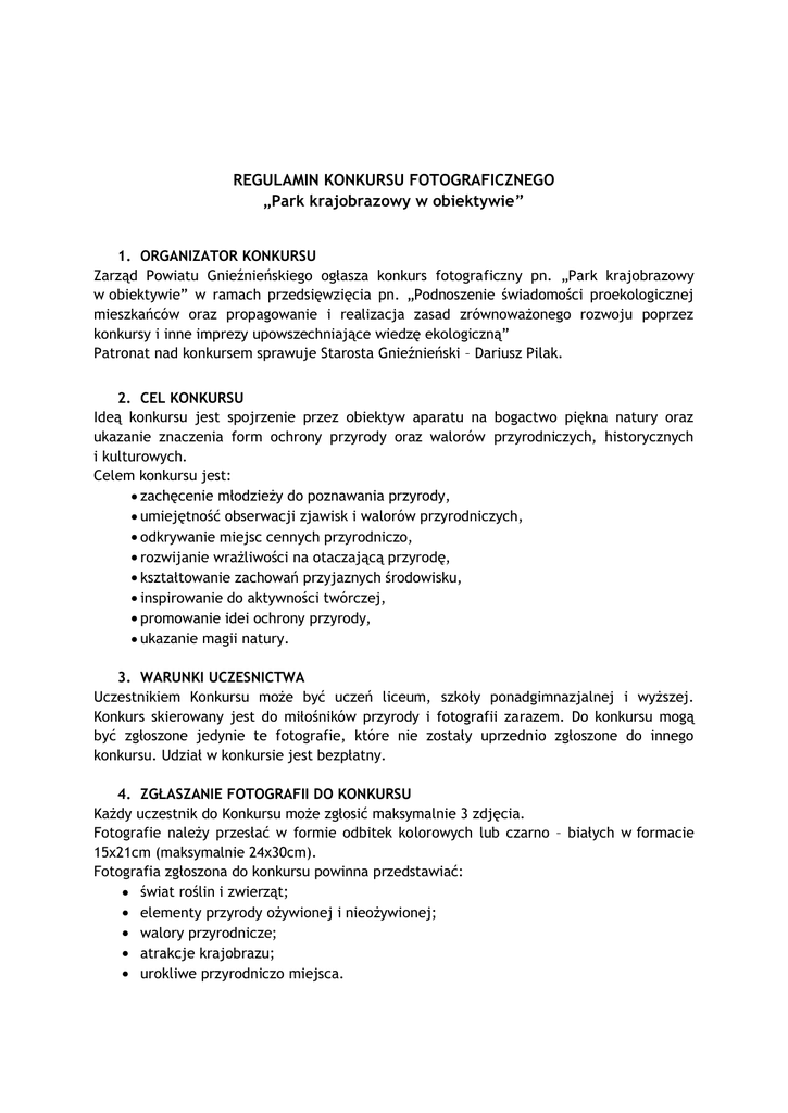 Załącznik nr 1 do Uchwały Nr ……../2012 Zarządu Powiatu Gnieźnieńskiego z dnia …………………….2012 r. REGULAMIN KONKURSU FOTOGRAFICZNEGO „Park krajobrazowy w obiektywie” 1. ORGANIZATOR KONKURSU Zarząd Powiatu Gnieźnieńskiego ogłasza konkurs fotograficzny pn. „Park krajobrazowy w obiektywie” w ramach przedsięwzięcia pn. „Podnoszenie świadomości proekologicznej mieszkańców oraz propagowanie i realizacja zasad zrównoważonego rozwoju poprzez konkursy i inne imprezy upowszechniające wiedzę ekologiczną” Patronat nad konkursem sprawuje Starosta Gnieźnieński – Dariusz Pilak. 2. CEL KONKURSU Ideą konkursu jest spojrzenie przez obiektyw aparatu na bogactwo piękna natury oraz ukazanie znaczenia form ochrony przyrody oraz walorów przyrodniczych, historycznych i kulturowych. Celem konkursu jest: zachęcenie młodzieży do poznawania przyrody, umiejętność obserwacji zjawisk i walorów przyrodniczych, odkrywanie miejsc cennych przyrodniczo, rozwijanie wrażliwości na otaczającą przyrodę, kształtowanie zachowań przyjaznych środowisku, inspirowanie do aktywności twórczej, promowanie idei ochrony przyrody, ukazanie magii natury. 3. WARUNKI UCZESNICTWA Uczestnikiem Konkursu może być uczeń liceum, szkoły ponadgimnazjalnej i wyższej. Konkurs skierowany jest do miłośników przyrody i fotografii zarazem. Do konkursu mogą być zgłoszone jedynie te fotografie, które nie zostały uprzednio zgłoszone do innego konkursu. Udział w konkursie jest bezpłatny. 4. ZGŁASZANIE FOTOGRAFII DO KONKURSU Każdy uczestnik do Konkursu może zgłosić maksymalnie 3 zdjęcia. Fotografie należy przesłać w formie odbitek kolorowych lub czarno – białych w formacie 15x21cm (maksymalnie 24x30cm). Fotografia zgłoszona do konkursu powinna przedstawiać: świat roślin i zwierząt; elementy przyrody ożywionej i nieożywionej; walory przyrodnicze; atrakcje krajobrazu; urokliwe przyrodniczo miejsca. Zdjęcia nie mogą być przetworzone i obrobione komputerowo. Wszystkie prace muszą być zapisane na płycie CD w postaci plików cyfrowych (JPEG lub PDF). Koszty przygotowania pracy konkursowej ponosi uczestnik. Z chwilą nadesłania prac na konkurs, wszelkie autorskie prawa majątkowe do nadesłanych prac nieodpłatnie przechodzą na organizatora. Prace nadesłane na konkurs nie będą zwracane autorom. Nadesłanie prac jest równoznaczne z akceptacją niniejszego regulaminu, oświadczeniem posiadania praw autorskich do nadesłanych prac oraz wyrażeniem zgody na przetwarzanie danych osobowych uczestnika w celach związanych z konkursem. Organizator zastrzega sobie prawo do nieodpłatnego wykorzystania nadesłanych prac w publikacjach związanych z konkursem - w materiałach i na stronie internetowej Powiatu. Zgłaszający gwarantuje, że zrobiona przez niego fotografia w żaden sposób nie stanowi naruszenia jakichkolwiek istniejących praw licencyjnych czy autorskich obowiązujących wobec całości lub części dzieła. Zgłaszający ponosi pełną odpowiedzialność zarówno względem organizatora konkursu, jak i względem osób trzecich za naruszenie postanowień niniejszego regulaminu, jak i ogólnie obowiązujących przepisów prawa. 5. TERMIN ZGŁASZANIA PRAC Prace konkursowe należy dostarczyć osobiście lub przesłać w kopertach w nieprzekraczalnym terminie do dnia 5.11.2012 r. (decyduje data stempla pocztowego) na adres: Starostwo Powiatowe w Gnieźnie Wydział Ochrony Środowiska, Rolnictwa i Leśnictwa ul. Jana Pawła II 9/10 62-200 Gniezno z dopiskiem: „Park krajobrazowy w obiektywie” Do każdej pracy konkursowej należy załączyć kwestionariusz zawierający: IMIĘ I NAZWISKO AUTORA NAZWĘ SZKOŁY TELEFON KONTAKTOWY TYTUŁ FOTOGRAFII MIEJCE WYKONANIA ZDJĘCIA KOMENTARZ DO ZDJĘCIA OŚWIADCZENIE TREŚCI Oświadczam, że jest autorem dostarczonego zdjęcia po tytułem …………………………………………………………………………………………………………………………………………... Podpis autora ZGODA NA PRZETWARZANIE DANYCH OSOBOWYCH „Wyrażam zgodę na przetwarzanie moich danych osobowych przez organizatora Konkursu Fotograficznego Park krajobrazowy w obiektywie w celach wynikających z regulaminu konkursu, z godnie z ustawą z dnia 29 sierpnia 1997 r. o ochronie danych osobowych (Dz. U. z 1997 r. Nr 133, poz. 883 z późn. zm.)”. IMIĘ I NAZWISKO OPIEKUNA, podpis opiekuna 6. OCENA KONKURSOWYCH ZDJĘĆ Oceny fotografii dokona powołana przez Starostę Gnieźnieńskiego komisja konkursowa w składzie: Aleksandra Kużniak – Dyrektor Wydziału Oświaty, Kultury i Sportu Starostwa Powiatowego w Gnieźnie; Agnieszka Rzempała – Chmielewska – Dyrektor Wydziału Promocji i Rozwoju Starostwa Powiatowego w Gnieźnie; Magdalena Musiałowicz – Dyrektor Wydziału Ochrony Środowiska, Rolnictwa i Leśnictwa Starostwa Powiatowego w Gnieźnie; Joanna Włodarczyk – Podinspektor Wydziału Ochrony Środowiska, Rolnictwa i Leśnictwa Starostwa Powiatowego w Gnieźnie; Waldemar Stube – fotograf. Komisja przyzna po 3 nagrody główne o łącznej wartości ok. 1000 zł. Organizator zastrzega sobie prawo do przyznania wyróżnień. Laureaci zostaną powiadomieni o wynikach i przyznanych im nagrodach. Ocenie prac podlegać będą: kryteria merytoryczne (zgodność z celami i ideą konkursu) kryteria artystyczne (pomysłowość, innowacyjność, oryginalność, wyobraźnia) kryteria techniczne i poziom estetyczny. Uroczyste ogłoszenie wyników, podsumowanie i wręczenie nagród nastąpi podczas wernisażu zorganizowanego z nadesłanych prac fotograficznych. W przypadku otrzymania niewystarczającej liczby zgłoszeń organizator zastrzega sobie możliwość wydłużenia terminu zgłaszania prac. Ostateczna interpretacja niniejszego regulaminu należy do organizatora. Organizator zastrzega sobie prawo do odwołania konkursu w przypadku zaistnienia okoliczności od niego niezależnych. Decyzje komisji ko
