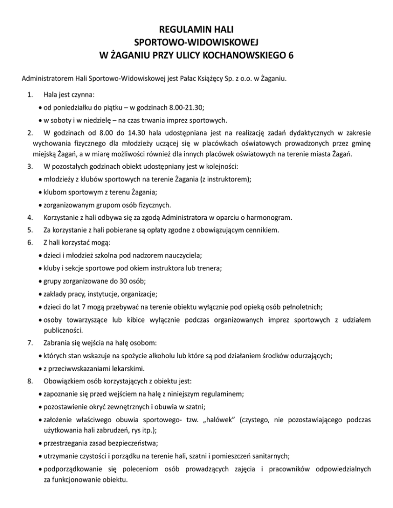 REGULAMIN HALI SPORTOWO-WIDOWISKOWEJ W ŻAGANIU PRZY ULICY KOCHANOWSKIEGO 6 Administratorem Hali Sportowo-Widowiskowej jest Pałac Książęcy Sp. z o.o. w Żaganiu. 1. Hala jest czynna: od poniedziałku do piątku – w godzinach 8.00-21.30; w soboty i w niedzielę – na czas trwania imprez sportowych. 2. W godzinach od 8.00 do 14.30 hala udostępniana jest na realizację zadań dydaktycznych w zakresie wychowania fizycznego dla młodzieży uczącej się w placówkach oświatowych prowadzonych przez gminę miejską Żagań, a w miarę możliwości również dla innych placówek oświatowych na terenie miasta Żagań. 3. W pozostałych godzinach obiekt udostępniany jest w kolejności: młodzieży z klubów sportowych na terenie Żagania (z instruktorem); klubom sportowym z terenu Żagania; zorganizowanym grupom osób fizycznych. 4. Korzystanie z hali odbywa się za zgodą Administratora w oparciu o harmonogram. 5. Za korzystanie z hali pobierane są opłaty zgodne z obowiązującym cennikiem. 6. Z hali korzystać mogą: dzieci i młodzież szkolna pod nadzorem nauczyciela; kluby i sekcje sportowe pod okiem instruktora lub trenera; grupy zorganizowane do 30 osób; zakłady pracy, instytucje, organizacje; dzieci do lat 7 mogą przebywać na terenie obiektu wyłącznie pod opieką osób pełnoletnich; osoby towarzyszące lub kibice wyłącznie podczas organizowanych imprez sportowych z udziałem publiczności. 7. Zabrania się wejścia na halę osobom: których stan wskazuje na spożycie alkoholu lub które są pod działaniem środków odurzających; z przeciwwskazaniami lekarskimi. 8. Obowiązkiem osób korzystających z obiektu jest: zapoznanie się przed wejściem na halę z niniejszym regulaminem; pozostawienie okryć zewnętrznych i obuwia w szatni; założenie właściwego obuwia sportowego- tzw. „halówek” (czystego, nie pozostawiającego podczas użytkowania hali zabrudzeń, rys itp.); przestrzegania zasad bezpieczeństwa; utrzymanie czystości i porządku na terenie hali, szatni i pomieszczeń sanitarnych; podporządkowanie się poleceniom osób prowadzących zajęcia i pracowników odpowiedzialnych za funkcjonowanie obiektu. 9. Na terenie hali zabrania się: palenia papierosów; picia napojów alkoholowych; stosowania środków odurzających; korzystania ze sprzętu i urządzeń sportowych niezgodnie z ich przeznaczeniem. 10. W czasie zawodów osoba odpowiedzialna za ich organizację jest zobowiązana przestrzegać przepisów regulaminu oraz jest odpowiedzialna za zapewnienie bezpieczeństwa korzystających z hali. 11. Zajęcia grup szkolnych korzystających z hali powinny odbywać się w obecności nauczyciela(instruktora, trenera). Wejście grupy na halę powinno odbywać się za jego zgodą. 12. Prowadzący zajęcia, organizator zajęć (instruktor, trener, opiekun) odpowiada za stan czystości i porządku w szatniach i pomieszczeniach sanitarnych hali po każdych zajęciach. 13. Osoby niszczące sprzęt lub urządzenia hali ponoszą odpowiedzialność materialną za wyrządzone szkody. 14. Administrator może kontrolować wszystkie zajęcia, a w razie stwierdzenia uchybień – zakazać korzystania z hali. 15. Administrator nie ponosi odpowiedzialności za wartościowe przedmioty pozostawione w szatniach hali. 16. Na terenie hali zabrania się biegania po korytarzach, schodach itp. oraz stwarzania zagrożeń narażających na utratę zdrowia lub kalectwo. 17. W całym obiekcie i jego pomieszczeniach obowiązuje bezwzględne przestrzeganie przepisów BHP i przeciw pożarowych. 18. Wszelkie skaleczenia, urazy itp. należy niezwłocznie zgłaszać nauczycielowi, trenerowi lub obsłudze obiektu. 19. Osoby naruszające porządek publiczny lub przepisy niniejszego regulaminu będą usuwane z terenu hali, a w razie konieczności powiadamiane będą organy ścigania prawnego. 20. Administrator i obsługa hali sprawuje nadzór nad przestrzeganiem niniejszego regulaminu. 21. Wszystkie osoby przebywające na terenie obiektu zobowiązane są do zapoznania się z treścią regulaminu i podporządkowania się jego nakazom. 22. Prowadzący zajęcia zobowiązani są do zapoznania się z regulaminem, fakt ten powinien być odnotowany u pracowników hali. 23. Administrator zastrzega sobie prawo zmiany stawek wynajmowania hali oraz prawo do ewentualnych zmian harmonogramu wynajmu. 24. Zmiana stawek oraz harmonogramu wymaga powiadomienia zainteresowanych stron. 25. W sprawach skarg, wniosków i zażaleń należy zwracać się do Administratora. 26. Niniejszy regulamin dotyczy także SALI FITNESS.