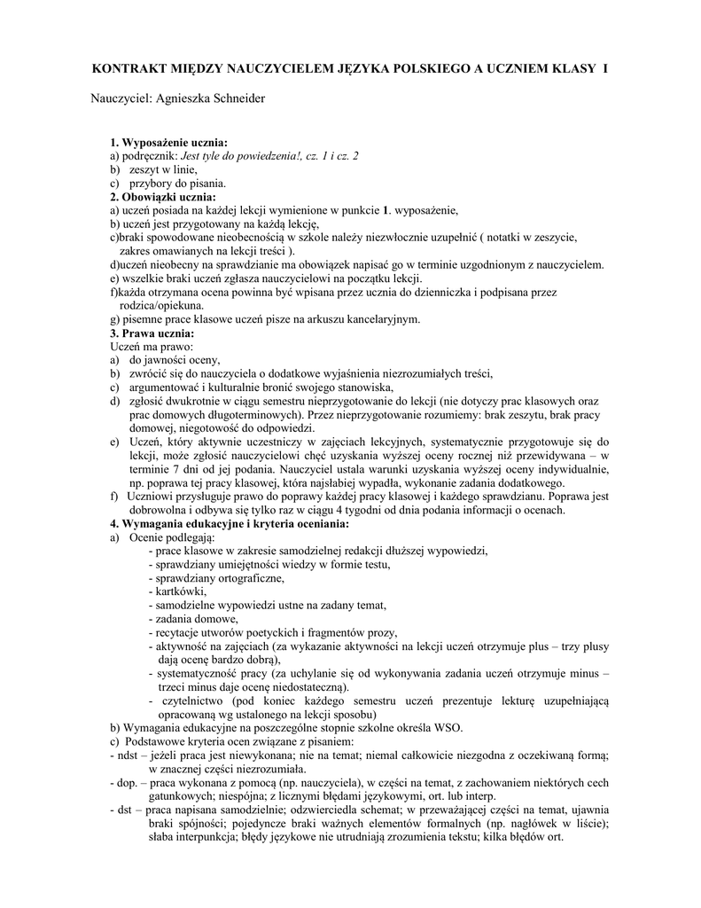 KONTRAKT MIĘDZY NAUCZYCIELEM JĘZYKA POLSKIEGO A UCZNIEM KLASY I Nauczyciel: Agnieszka Schneider 1. Wyposażenie ucznia: a) podręcznik: Jest tyle do powiedzenia!, cz. 1 i cz. 2 b) zeszyt w linie, c) przybory do pisania. 2. Obowiązki ucznia: a) uczeń posiada na każdej lekcji wymienione w punkcie 1. wyposażenie, b) uczeń jest przygotowany na każdą lekcję, c)braki spowodowane nieobecnością w szkole należy niezwłocznie uzupełnić ( notatki w zeszycie, zakres omawianych na lekcji treści ). d)uczeń nieobecny na sprawdzianie ma obowiązek napisać go w terminie uzgodnionym z nauczycielem. e) wszelkie braki uczeń zgłasza nauczycielowi na początku lekcji. f)każda otrzymana ocena powinna być wpisana przez ucznia do dzienniczka i podpisana przez rodzica/opiekuna. g) pisemne prace klasowe uczeń pisze na arkuszu kancelaryjnym. 3. Prawa ucznia: Uczeń ma prawo: a) do jawności oceny, b) zwrócić się do nauczyciela o dodatkowe wyjaśnienia niezrozumiałych treści, c) argumentować i kulturalnie bronić swojego stanowiska, d) zgłosić dwukrotnie w ciągu semestru nieprzygotowanie do lekcji (nie dotyczy prac klasowych oraz prac domowych długoterminowych). Przez nieprzygotowanie rozumiemy: brak zeszytu, brak pracy domowej, niegotowość do odpowiedzi. e) Uczeń, który aktywnie uczestniczy w zajęciach lekcyjnych, systematycznie przygotowuje się do lekcji, może zgłosić nauczycielowi chęć uzyskania wyższej oceny rocznej niż przewidywana – w terminie 7 dni od jej podania. Nauczyciel ustala warunki uzyskania wyższej oceny indywidualnie, np. poprawa tej pracy klasowej, która najsłabiej wypadła, wykonanie zadania dodatkowego. f) Uczniowi przysługuje prawo do poprawy każdej pracy klasowej i każdego sprawdzianu. Poprawa jest dobrowolna i odbywa się tylko raz w ciągu 4 tygodni od dnia podania informacji o ocenach. 4. Wymagania edukacyjne i kryteria oceniania: a) Ocenie podlegają: - prace klasowe w zakresie samodzielnej redakcji dłuższej wypowiedzi, - sprawdziany umiejętności wiedzy w formie testu, - sprawdziany ortograficzne, - kartkówki, - samodzielne wypowiedzi ustne na zadany temat, - zadania domowe, - recytacje utworów poetyckich i fragmentów prozy, - aktywność na zajęciach (za wykazanie aktywności na lekcji uczeń otrzymuje plus – trzy plusy dają ocenę bardzo dobrą), - systematyczność pracy (za uchylanie się od wykonywania zadania uczeń otrzymuje minus – trzeci minus daje ocenę niedostateczną). - czytelnictwo (pod koniec każdego semestru uczeń prezentuje lekturę uzupełniającą opracowaną wg ustalonego na lekcji sposobu) b) Wymagania edukacyjne na poszczególne stopnie szkolne określa WSO. c) Podstawowe kryteria ocen związane z pisaniem: - ndst – jeżeli praca jest niewykonana; nie na temat; niemal całkowicie niezgodna z oczekiwaną formą; w znacznej części niezrozumiała. - dop. – praca wykonana z pomocą (np. nauczyciela), w części na temat, z zachowaniem niektórych cech gatunkowych; niespójna; z licznymi błędami językowymi, ort. lub interp. - dst – praca napisana samodzielnie; odzwierciedla schemat; w przeważającej części na temat, ujawnia braki spójności; pojedyncze braki ważnych elementów formalnych (np. nagłówek w liście); słaba interpunkcja; błędy językowe nie utrudniają zrozumienia tekstu; kilka błędów ort. - db - praca napisana samodzielnie; na temat, zgodnie z formą bez pominięcia żadnych elementów; spójna i logicznie uporządkowana; nieliczne błędy językowe i stylistyczne - bdb - praca napisana samodzielnie; na temat, zgodnie z formą bez pominięcia żadnych elementów; spójna i logicznie uporządkowana; ujawnia samodzielność myślenia i wykorzystanie materiału nieomawianego na lekcjach; sporadyczne błędy językowe i stylistyczne - cel. - praca napisana samodzielnie; oryginalne ujęcie tematu, zgodnie z formą o nietypowych rozwiązaniach kompozycyjnych; spójna i logicznie uporządkowana; bezbłędna językowo i stylistycznie d) Podstawowe kryteria ocen związane z czytaniem, mówieniem i słuchaniem: - ndst – Częste i uporczywe niewypełnianie podstawowych obowiązków grozi oceną ndst! - dop. – uczeń czyta z niepełnym zrozumieniem, nie pamięta ważnych treści i wiadomości związanych z lekturami, samodzielnie nie rozumie sensów przenośnych i symbolicznych; mówi pojedynczymi wyrazami, krótkimi frazami; często nie rozumie poleceń i pytań – korzysta z pomocy nauczyciela w dużym stopniu, - dst – uczeń w znacznej części rozumie czytane teksty, mówi językiem ubogim i korzysta z ograniczonego zasobu słów; rozumie sensy dosłowne; wypowiada się o sensach przenośnych i symbolicznych z pomocą nauczyciela; zna i stosuje podstawowe terminy (np. narrator, podmiot, zdanie złożone); uważnie słucha; często się wypowiada, ale popełnia przy tym różnego rodzaju błędy, - db – uczeń rozumie czytane teksty na wszystkich poziomach; wypowiada się na ich temat, wykorzystując zdobytą wiedzę, posługuje się stosowną terminologią; popełnia nieliczne błędy merytoryczne i językowe; uważnie słucha i aktywnie bierze udział na lekcji, czyta samodzielnie inne lektury, - bdb - uczeń rozumie czytane teksty na wszystkich poziomach; proponuje samodzielne ich odczytanie; konstruuje dłuższe wypowiedzi ustne, spójne i uporządkowane logicznie; czyta samodzielnie inne teksty; orientuje się w istotnych zjawiskach kultury - cel. – jak na ocenę bdb oraz przejawia uzdolnienia humanistyczne, bierze udział w działaniach na terenie szkoły związanych z szeroko rozumianą edukacją humanistyczną (np. konkursy literackie, praca w gazetce szkolnej itp.) e) Najważniejsze są oceny z prac klasowych, testów oraz wypowiedzi ustnych. f) Kartkówki nie muszą być zapowiedziane. g) Przy ocenianiu uwzględniane są możliwości intelektualne ucznia. h) Prace pisemne oceniane są według następujących zasad: 0% – 29% - niedostateczny 30% - 49% - do