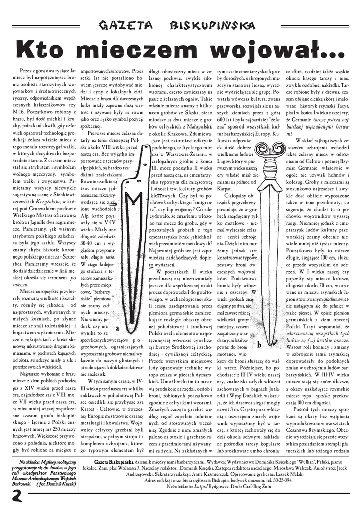 Kto mieczem wojował... Przez z górą dwa tysiące lat miecz był najpotężniejszą bro− nią osobistą starożytnych wo− jowników i średniowiecznych rycerzy, odpowiednikiem współ− czesnych kałasznikowów czy M−16. Początkowo robiony z brązu, był dość miękki i kru− chy, jednak od chwili, gdy czło− wiek opanował technologię pro− dukcji żelaza właśnie miecz z tego metalu rozstrzygał walki, w których decydowało bezpo− średnie starcie. Z czasem miecz stał się atrybutem i symbolem wolnego mężczyzny, symbo− lem walki i zwycięstwa. Pa− miętamy wszyscy niezwykle sugestywną scenę z Sienkiewi− czowskich Krzyżaków, w któ− rej pod Grunwaldem posłowie Wielkiego Mistrza ofiarowują królowi Jagielle dwa nagie mie− cze. Pamiętamy, jak ważnym atrybutem polskiego szlachci− ca była jego szabla. Wszyscy znamy chyba historię koron− nego polskiego miecza − Szcze− rbca. Pamiętamy wreszcie, że do dziś dziedziczenie w linii mę− skiej określa się terminem po mieczu. Miecze europejskie przybie− rały rozmaitą wielkość i kształ− ty, różniły się jakością − od najprostszych, wykuwanych w małych kuźniach, po słynne miecze ze stali toledańskiej − i bogactwem wykończenia. Mie− cze o rękojeściach z kości sło− niowej inkrustowanej drogimi ka− mieniami, w pochwach kapiących od złota, świadczyć miały o sile i potędze swoich właścicieli. Najstarsze wykonane z brązu miecze z ziem polskich pochodzą już z XIV wieku przed naszą erą, najmłodsze zaś z VIII, mo− że VII wieku przed naszą erą, są więc mniej więcej współcze− sne czasom grodu biskupiń− skiego − łącznie z Polski zna− nych jest mniej niż 250 mieczy brązowych. Większość przywo− żono z południa, niektóre mo− gły być robione na miejscu z Na okładce: Myśliwy neolityczny przygotowuje się do łowów, w jego roli wicedyrektor Państwowego Muzeum Archeologicznego Wojciech Borkowski. ( fot. Dominik Księski) importowanych surowców. Przez setki lat nie potrafiono bo− wiem jeszcze wydobywać mie− dzi i cyny z lokalnych złóż. Miecze z brązu dla ówczesnych ludzi miały zapewne dużą war− tość i używane były na równi jako oręż i jako symbol pozycji społecznej. Pierwsze miecze żelazne do− tarły na teren dzisiejszej Pol− ski około VIII wieku przed naszą erą. Bez wyjątku im− portowane z terenów przy− alpejskich, są bardzo rza− dkimi znaleziskami. Równie rzadkie są tzw. miecze jed− nosieczne, także wy− wodzące się z re− jonu wschodnich Alp, które poja− wiły się w V−IV wieku. Miały one długość zaledwie 30−40 cm i wy− glądem przypomi− nały długie noże. W ciągu kolejne− go stulecia z te− renów zamieszka− łych przez miejs− cowe, “barbarzy− ńskie” plemiona nie znamy żad− nych mieczy. Nie wiemy je− dnak, czy nie wynika to ze specyficznych zwyczajów p o − grzebowych, ograniczających wyposażenia grobowe niemal wy− łącznie do naczyń glinianych i utrudniających dokładne datowa− nie znalezisk. W tym samym czasie, w IV− III wieku przed naszą erą w kilku enklawach w południowej Pol− sce osiedlili się przybysze zza Karpat − Celtowie, w ówczes− nej Europie mistrzowie czarnej metalurgii i kowalstwa. Wojo− wnicy celtyccy grzebani byli niespaleni, w pełnym stroju i z kompletem uzbrojenia, które− go typowym elementem był a długi, obosieczny miecz w że− laznej pochwie, zwykle zdo− bionej charakterystycznymi wzorami, często zawieszany na pasie z żelaznych ogniw. Takie właśnie miecze znamy z kilku− nastu grobów ze Śląska, nieco młodsze są dwa miecze z gro− bów celtyckich z Małopolski, z okolic Krakowa. Zdumiewa− jące jest natomiast odkrycie podobnego, celtyckiego mie− cza w Warszawie−Żeraniu, w ciałopalnym grobie z końca III, może początku II wieku przed naszą erą, na cmentarzy− sku typowym dla miejscowej ludności tzw. kultury grobów kloszowych. Czy był to po− chówek celtyckiego “emigran− ta”, czy łup wojenny? Co zde− cydowało, że zmarłemu włożo− no ten miecz do grobu, gdy w pozostałych grobach z tego cmentarzyska brak jakichkol− wiek przedmiotów metalowych? Najpewniej grób ten jest zapo− wiedzią nadchodzących dopie− ro wydarzeń. W początkach II wieku przed naszą erą niezrozumiały jeszcze dla współczesnej nauki proces doprowadził do gwałto− wnego, w archeologicznej ska− li czasu, zaadaptowania przez plemiona germańskie zamiesz− kujące rozległe obszary obec− nej południowej i środkowej Polski wielu elementów najpo− tężniejszej wówczas cywiliza− cji Europy Środkowej i zacho− dniej − cywilizacji celtyckiej. Przede wszystkim miejscowe ludy opanowały technikę wy− topu żelaza w piecach dymars− kich. Umożliwiło im to maso− wą produkcję narzędzi, ozdób i broni, robionych początkowo zgodnie z celtyckimi wzorami. Zmarłych zaczęto grzebać we− dług reguł zupełnie odmien− nych od stosowanych wcześ− niej. Zgodnie z nimi zmarłych palono na stosie i grzebano ra− zem z przedmiotami używany− mi za życia. Na zakładanych w tym czasie cmentarzyskach gro− by dorosłych, uzbrojonych mę− żczyzn stanowią liczną, wyraź− nie wydzielającą się grupę. Po− wstała wówczas kultura, zwana przeworską, rozwijała się na na− szych ziemiach przez z górą 600 lat i była najbardziej “żela− zną” spośród wszystkich kul− tur barbarzyńskiej Europy. Ku− ltura ta odpowia− da dość dobrze wielkiemu ludowi Lugiw, który w pie− rwszym wieku naszej ery władać miał zie− miami na północ od Karpat. Ciałopalny ob− rządek pogrzebowy powoduje, że w gro− bach znajdujemy tyl− ko metalowe − nie− mal wyłącznie żelaz− ne − części uzbroje− nia. Dzięki nim mo− żemy jednak zre− konstruować typowe zestawy broni ów− czesnych wojowni− ków. Podstawową bronią