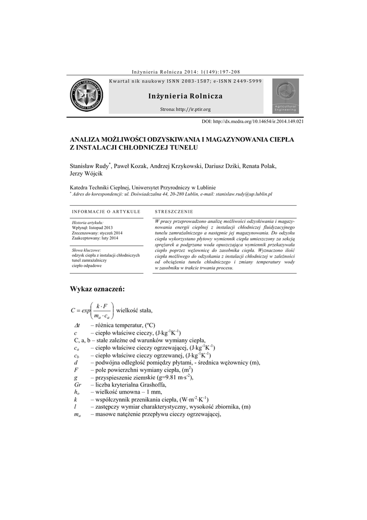 Inżynieria Rolnicza 2014: 1(149):197-208 Kwartal nik naukowy ISNN 2083-1587; e-ISNN 2449-5999 InżynieriaRolnicza Strona:http://ir.ptir.org DOI: http://dx.medra.org/10.14654/ir.2014.149.021 ANALIZA MOŻLIWOŚCI ODZYSKIWANIA I MAGAZYNOWANIA CIEPŁA Z INSTALACJI CHŁODNICZEJ TUNELU Stanisław Rudy*, Paweł Kozak, Andrzej Krzykowski, Dariusz Dziki, Renata Polak, Jerzy Wójcik Katedra Techniki Cieplnej, Uniwersytet Przyrodniczy w Lublinie Adres do korespondencji: ul. Doświadczalna 44, 20-280 Lublin, e-mail: [email protected] INFORMACJE O ARTYKULE STRESZCZENIE Historia artykułu: Wpłynął: listopad 2013 Zrecenzowany: styczeń 2014 Zaakceptowany: luty 2014 W pracy przeprowadzono analizę możliwości odzyskiwania i magazynowania energii cieplnej z instalacji chłodniczej fluidyzacyjnego tunelu zamrażalniczego a następnie jej magazynowania. Do odzysku ciepła wykorzystano płytowy wymiennik ciepła umieszczony za sekcją sprężarek a podgrzana woda opuszczająca wymiennik przekazywała ciepło poprzez wężownicę do zasobnika ciepła. Wyznaczono ilość ciepła możliwego do odzyskania z instalacji chłodniczej w zależności od obciążenia tunelu chłodniczego i zmiany temperatury wody w zasobniku w trakcie trwania procesu. Słowa kluczowe: odzysk ciepła z instalacji chłodniczych tunel zamrażalniczy ciepło odpadowe Wykaz oznaczeń: kF wielkość stała, C exp ma ca t – różnica temperatur, (ºC) c – ciepło właściwe cieczy, (Jkg-1K-1) C, a, b – stałe zależne od warunków wymiany ciepła, ca – ciepło właściwe cieczy ogrzewającej, (Jkg-1K-1) cb – ciepło właściwe cieczy ogrzewanej, (Jkg-1K-1) d – podwójna odległość pomiędzy płytami, - średnica wężownicy (m), – pole powierzchni wymiany ciepła, (m2) F g – przyspieszenie ziemskie (g=9.81 ms-2), Gr – liczba kryterialna Grashoffa, – wielkość umowna – 1 mm, ho k – współczynnik przenikania ciepła, (Wm-2K-1) l – zastępczy wymiar charakterystyczny, wysokość zbiornika, (m) – masowe natężenie przepływu cieczy ogrzewającej, ma S. Rudy, P. Kozak, A. Krzykowski, D. Dziki, R. Polak, J. Wójcik mb Nu Pr Re t tk tp u α β β1 βt ΔTln ζ η λ ν ρ – masa cieczy ogrzewanej, – Liczba Nusselta, – liczba Prandtla, – liczba Reynoldsa, – temperatura cieczy ogrzewającej, (90ºC) – temperatura wody w zasobniku ciepła po ogrzaniu o zadany krok, (tp+ 5ºC) – temperatura początkowa wody w zasobniku ciepła, (ºC) – prędkość czynnika, (m·s-1) – współczynnik przejmowania ciepła, (Wm-2K-1) – współczynnik tłumienia burzliwości przy powierzchni ścianek, – rozszerzalność objętościowa cieczy, – współczynnik wymuszonej burzliwości, – logarytmiczna różnica temperatur, – współczynnik oporu przepływu w kanałach gładkich, – lepkość dynamiczna czynnika, (Pas) – współczynnik przewodzenia ciepła, (Wm-1K-1) – lepkość kinematyczna, (m2s-1) – gęstość czynnika, (kgm-3) – czas nagrzewania zbiornika, (s) Wprowadzenie Zagadnienia dotyczące oszczędności energii, obok jej alternatywnych źródeł, są w ostatnich latach jedną z podstaw strategii europejskiej polityki energetycznej. Biorąc pod uwagę wzrost cen konwencjonalnych źródeł energii, ochronę środowiska a także korzyści finansowe wynikające ze zmniejszenia kosztów wytwarzania, ograniczenie zużycia energii ma szczególne znaczenie w przypadku zakładów produkcyjnych (Staniszewski i Bonca, 2006; Wojdalski i in., 2008a; 2008b; Łapczyńska-Kordon i in., 2013). Prowadzone są również prace nad analizą efektów energetycznych instalacji w tym magazynowania nadwyżek ciepła w różnych obiektach (Kurpaska, 2003; 2007; Rutkowski 2008). Zakłady wykorzystujące instalacje chłodnicze mają możliwość odzyskiwania energii ciepła odpadowego ze skraplaczy, które muszą być chłodzone, a pierwotnie ciepło przekazywane jest do medium chłodzącego (powietrze, woda) i ostatecznie tracone. Ciepło przegrzania par czynnika chłodniczego oraz ciepło skraplania może być zagospodarowane zgodnie z zapotrzebowaniem, jak np.: wytwarzanie ciepłej wody do celów technologicznych - obróbka surowca, mycie urządzeń i pomieszczeń w procesie produkcji oraz ogrzewanie gruntu pod komorami chłodni. W zakładach nie podłączonych do sieci ciepłowniczej gorąca woda może być wykorzystana do celów sanitarnych oraz ogrzewania budynków (Oberg, 2005; Targański, 2011). Biorąc jednak pod uwagę asynchroniczność dostępności i zapotrzebowania na ciepło odpadowe należy zainstalować dodatkowe konwencjonalne źródło ciepła lub zamontować zasobniki ciepła. Wskazane jest przy tym przeprowadzenie analizy ilości możliwej do odzyskania energii cieplnej w odniesieniu do istniejących potrzeb energetycznych (Gazda, 2002; Targański, 2009). 198 Analiza możliwości odzyskiwania... Celem pracy była analiza możliwości odzyskiwania i magazynowania ciepła odzyskanego z wybranej instalacji chłodniczej odbierającej ciepło z tunelu, przeznaczonego do wstępnego zamrażania owoców i warzyw. Wyznaczono ilość ciepła możliwego do odzyskania od instalacji chłodniczej w zależności od obciążenia tunelu chłodniczego, w płytowym wymienniku ciepła umieszczonym za układem sprężarek. W procesie magazynowania ciepła wyznaczono zmiany temperatury zasobnika w zależności od czasu trwania procesu. Obiekt badań Tunel zamrażalniczy fluidyzacyjny służy do zamrażania dowolnych owoców i warzyw, całych lub krojonych i umożliwia uzyskanie wysokiej jakości produktów poprzez indywidualne ich zamrażanie, a następnie domrażanie w dwóch strefach podmuchu zimnego powietrza, dzięki efektowi fluidyzacji. Badania były przeprowadzone na urządzeniu znajdującym się w zakładzie produkcyjnym Grupa Producentów „Klasa” spółka z. o o. z siedzibą w Klementowicach. Dane techniczne fluidyzacyjnego tunelu chłodniczego zestawiono w tabeli 1. Tabela 1. Podstawowe dane techniczne fl