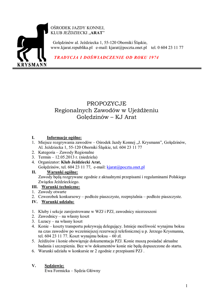 OŚRODEK JAZDY KONNEJ, KLUB JEŹDZIECKI „ARAT” Golędzinów al. Jeździecka 1, 55-120 Oborniki Śląskie, www.kjarat.republika.pl e-mail: [email protected] tel. 0 604 23 11 77 TRADYCJA I DOŚWIADCZENIE OD ROKU 1974 PROPOZYCJE Regionalnych Zawodów w Ujeżdżeniu Golędzinów – KJ Arat I. Informacje ogólne: 1. Miejsce rozgrywania zawodów – Ośrodek Jazdy Konnej „J. Krysmann”, Golędzinów, Al. Jeździecka 1, 55-120 Oborniki Śląskie, tel. 604 23 11 77 2. Kategoria – Zawody Regionalne 3. Termin – 12.05.2013 r. (niedziela) 4. Organizator: Klub Jeździecki Arat, Golędzinów, tel. 604 23 11 77, e-mail: [email protected] II. Warunki ogólne: Zawody będą rozgrywane zgodnie z aktualnymi przepisami i regulaminami Polskiego Związku Jeździeckiego. III. Warunki techniczne: 1. Zawody otwarte 2. Czworobok konkursowy – podłoże piaszczyste, rozprężalnia – podłoże piaszczyste. IV. Warunki udziału: 1. 2. 3. 4. Kluby i sekcje zarejestrowane w WZJ i PZJ, zawodnicy niezrzeszeni Zawodnicy – na własny koszt Luzacy – na własny koszt Konie – koszty transportu pokrywają delegujący. Istnieje możliwość wynajmu boksu na czas zawodów po wcześniejszej rezerwacji telefonicznej u p. Jerzego Krysmanna, tel. 604 23 11 77. Koszt wynajmu boksu – 60 zł. 5. Jeźdźców i konie obowiązuje dokumentacja PZJ. Konie muszą posiadać aktualne badania i szczepienia. Bez w/w dokumentów konie nie będą dopuszczone do startu. 6. Warunki udziału w konkursie nr 2 zgodnie z przepisami PZJ . V. Sędziowie: Ewa Formicka – Sędzia Główny 1 Eliza Skórczyńska VI. Program zawodów: Rozpoczęcie o godz. 10.00 Konkurs nr 1 – L- 3 Konkurs nr 2 – L- 3 (Towarzyski) Konkurs nr 3 – P- 3 Konkurs nr 4 – P- 3 (Towarzyski) Konkurs nr 5 – N- 6 Konkurs nr 6 – C- 3 VII. Zgłoszenia i opłaty: 1. Zgłoszenia należy przesyłać na adres [email protected] do dnia 6.05.(poniedziałek) do godz. 16.00. Zgłoszenie jest ważne po otrzymaniu potwierdzenia o jego przyjęciu oraz po dokonaniu opłaty organizacyjnej. 2. Opłata organizacyjna – 60 zł za każdy start. Wpłaty prosimy dokonywać na konto: Jerzy Krysmann, Aleja Jeździecka 1, Golędzinów, 55-120 Oborniki Śląskie Nr konta: 23 1090 2457 0000 0006 2001 8055 3. Zgłoszenie się do zawodów jest równoznaczne z zaakceptowaniem propozycji zawodów. 4. Zgłoszenia po terminie mogą być przyjęte za dodatkową opłatą 40 zł. 5. Listy startowe będą do wglądu na stronie www.kjarat.republika.pl od piątku 10 .05. od godz. 21.00 6. Różne: 1. Organizator nie odpowiada za wypadki i kradzieże w czasie zawodów i transportu 2. Organizator zastrzega sobie prawo do zmian programu zawodów oraz ograniczenia ilości startujących koni – decyduje kolejność zgłoszeń. 3. Organizator przewiduje nagrody rzeczowe oraz flot’s dla zwycięzców.. 4. Organizator zastrzega sobie prawo odwołania zawodów w przypadku małej liczby zgłoszeń VIII. Propozycje zatwierdzone przez DZJ we Wrocławiu w dniu 20.03.2013 r. 2