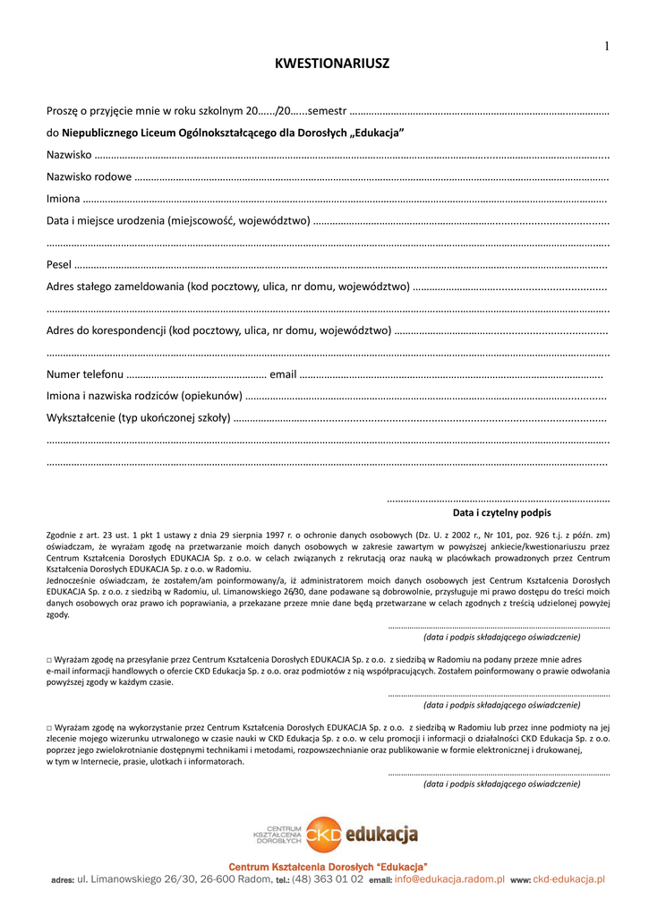 1 KWESTIONARIUSZ Proszę o przyjęcie mnie w roku szkolnym 20….../20…...semestr …………………………….……..……………………………….…………… do Niepublicznego Liceum Ogólnokształcącego dla Dorosłych „Edukacja” Nazwisko …………………………………………………………………………………………………………………………….....……………………………….... Nazwisko rodowe ………………………………………………………………………………………………………………………………………………………. Imiona ………………………………………………………………………………………………………………………………………………………………………. Data i miejsce urodzenia (miejscowość, województwo) …………………………………………………………...................................... ……………………………………………………………………………………………………………………………………………………………………………….….. Pesel …………………………………………………………………………………………………………………………………………………………………….…... Adres stałego zameldowania (kod pocztowy, ulica, nr domu, województwo) …………………………..................................... ………………………………………………………………………………………………………………………………………………………………………….……….. Adres do korespondencji (kod pocztowy, ulica, nr domu, województwo) ………………………………...................................... ………………………………………………………………………………………………………………………………………………………………………….……….. Numer telefonu …………………………………………… email ……………………………………………………………………………………………….. Imiona i nazwiska rodziców (opiekunów) ………………………………………………………………………………………………………............. Wykształcenie (typ ukończonej szkoły) ………………………................................................................................................... …………………………………………………………………………………………………………………………………………………………………………….…….. ………………………………………………………………………………………………………………………………………………………………………………..... ……………………………………………………………………… Data i czytelny podpis Zgodnie z art. 23 ust. 1 pkt 1 ustawy z dnia 29 sierpnia 1997 r. o ochronie danych osobowych (Dz. U. z 2002 r., Nr 101, poz. 926 t.j. z późn. zm) oświadczam, że wyrażam zgodę na przetwarzanie moich danych osobowych w zakresie zawartym w powyższej ankiecie/kwestionariuszu przez Centrum Kształcenia Dorosłych EDUKACJA Sp. z o.o. w celach związanych z rekrutacją oraz nauką w placówkach prowadzonych przez Centrum Kształcenia Dorosłych EDUKACJA Sp. z o.o. w Radomiu. Jednocześnie oświadczam, że zostałem/am poinformowany/a, iż administratorem moich danych osobowych jest Centrum Kształcenia Dorosłych EDUKACJA Sp. z o.o. z siedzibą w Radomiu, ul. Limanowskiego 26/30, dane podawane są dobrowolnie, przysługuje mi prawo dostępu do treści moich danych osobowych oraz prawo ich poprawiania, a przekazane przeze mnie dane będą przetwarzane w celach zgodnych z treścią udzielonej powyżej zgody. ………………………………………………………………………………………….. (data i podpis składającego oświadczenie) □ Wyrażam zgodę na przesyłanie przez Centrum Kształcenia Dorosłych EDUKACJA Sp. z o.o. z siedzibą w Radomiu na podany przeze mnie adres e-mail informacji handlowych o ofercie CKD Edukacja Sp. z o.o. oraz podmiotów z nią współpracujących. Zostałem poinformowany o prawie odwołania powyższej zgody w każdym czasie. ………………………………………………………………………………………….. (data i podpis składającego oświadczenie) □ Wyrażam zgodę na wykorzystanie przez Centrum Kształcenia Dorosłych EDUKACJA Sp. z o.o. z siedzibą w Radomiu lub przez inne podmioty na jej zlecenie mojego wizerunku utrwalonego w czasie nauki w CKD Edukacja Sp. z o.o. w celu promocji i informacji o działalności CKD Edukacja Sp. z o.o. poprzez jego zwielokrotnianie dostępnymi technikami i metodami, rozpowszechnianie oraz publikowanie w formie elektronicznej i drukowanej, w tym w Internecie, prasie, ulotkach i informatorach. ………………………………………………………………………………………….. (data i podpis składającego oświadczenie) adres: Centrum Kształcenia Dorosłych “Edukacja” ul. Limanowskiego 26/30, 26-600 Radom, tel.: (48) 363 01 02 email: [email protected] www: ckd-edukacja.pl 2 POBRANE DOKUMENTY l.p. Spis dokumentów 1. Oryginał: świadectwo ukończenia szkoły średniej, świadectwo dojrzałości* ………………………………………………………….. ………………………………………………………….. nr…………………… z dnia………………………….. 2. 2 fotografie o wym. 37x 52 mm 3. Zaświadczenie lekarskie Pokwitowanie w przypadku odbioru dokumentów przez kandydata Prawidłowość danych zawartych w podaniu stwierdzam własno